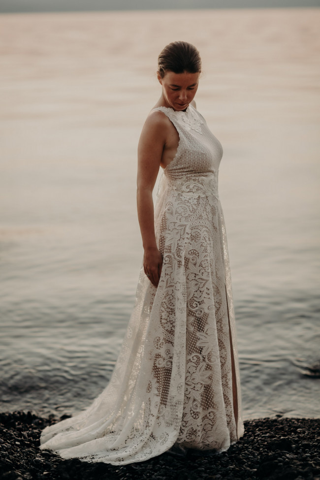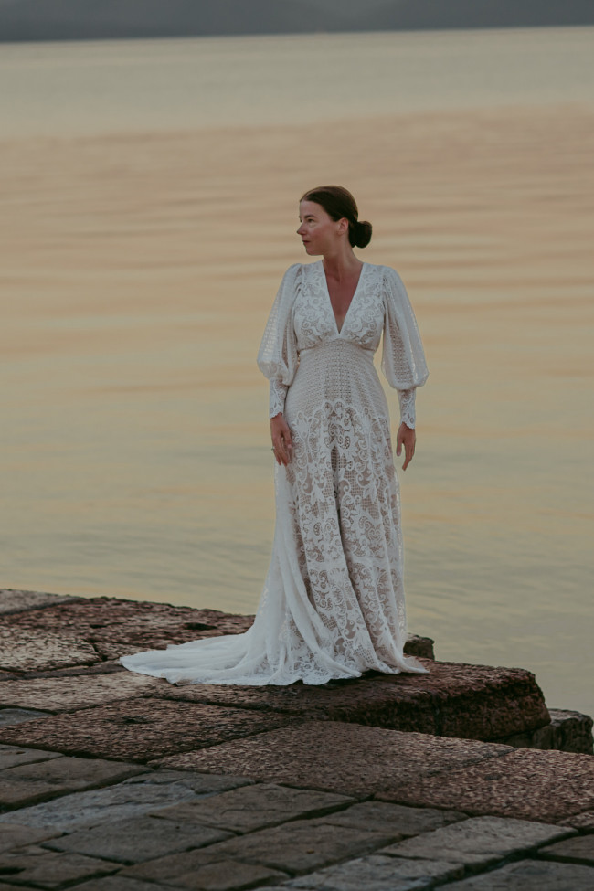 To właśnie ona sprawia, że suknia nie jest jedynie formą, ale staje się doświadczeniem. Miękkim, zmysłowym i bardzo osobistym. W boho koronka nie jest dekoracją samą w sobie. Jest częścią konstrukcji sukni – jej rytmu i charakteru. To materiał, który pozwala na niedopowiedzenie, na miękkie przejścia i na swobodę, której tak wiele panien młodych dziś poszukuje.