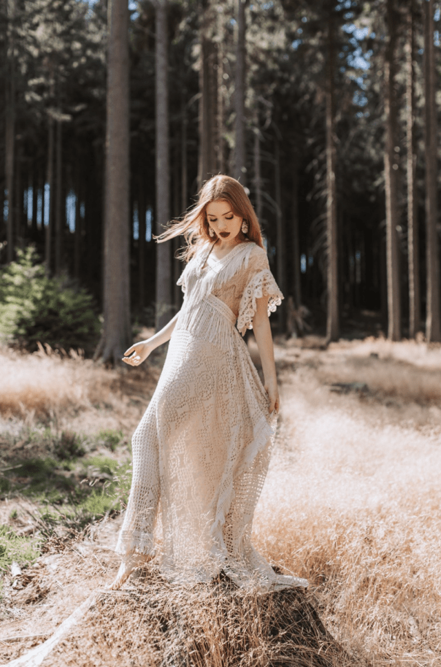 Wkrótce moje projekty zobaczyła Justyna Sinkowska – zaprzyjaźniona fotografka z Jeleniej Góry. Jej reakcja była natychmiastowa: „Musimy zrobić sesję i pokazać Twoje suknie ślubne w stylu boho!”. Justyna ma niesamowite oko do emocji, światła i kobiecej delikatności. Dzięki jej zdjęciom moje suknie zyskały nowe życie – to, które widać w kadrach, ale też to, które czuje każda przyszła panna młoda. Właśnie w tej pierwszej sesji powstała estetyka, która do dziś jest znakiem rozpoznawczym mojej marki: miękkie światło, naturalność, brak sztucznego „pozowania” i ta magiczna boho wolność.