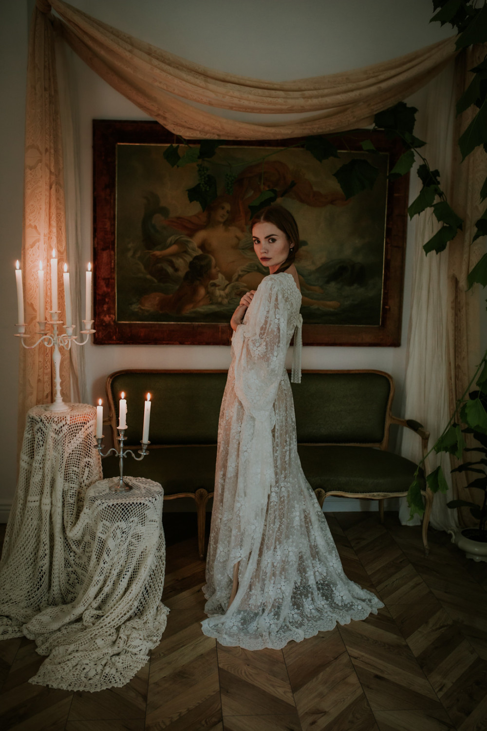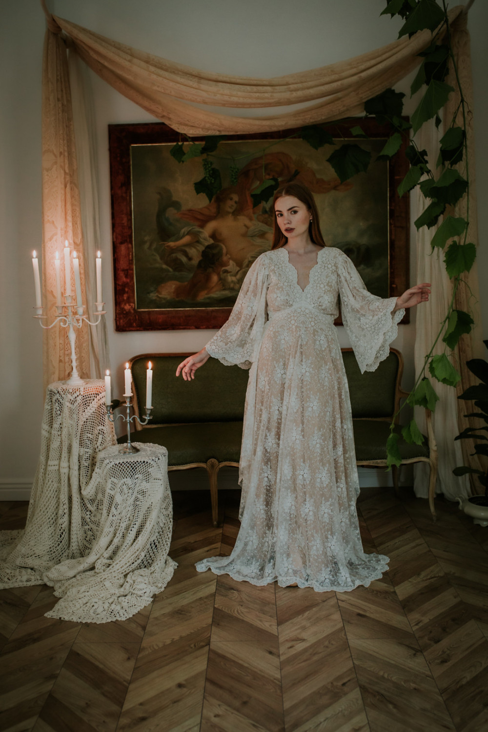 Dekolt sukni wykończony jest w efektowny sposób – kształtem koronki, który tworzy naturalną ozdobę i przyciąga wzrok swoją finezją. Długie, szerokie rękawy z koronki nadają stylizacji lekkości i ruchu, tworząc wrażenie delikatnego tańca z wiatrem.
