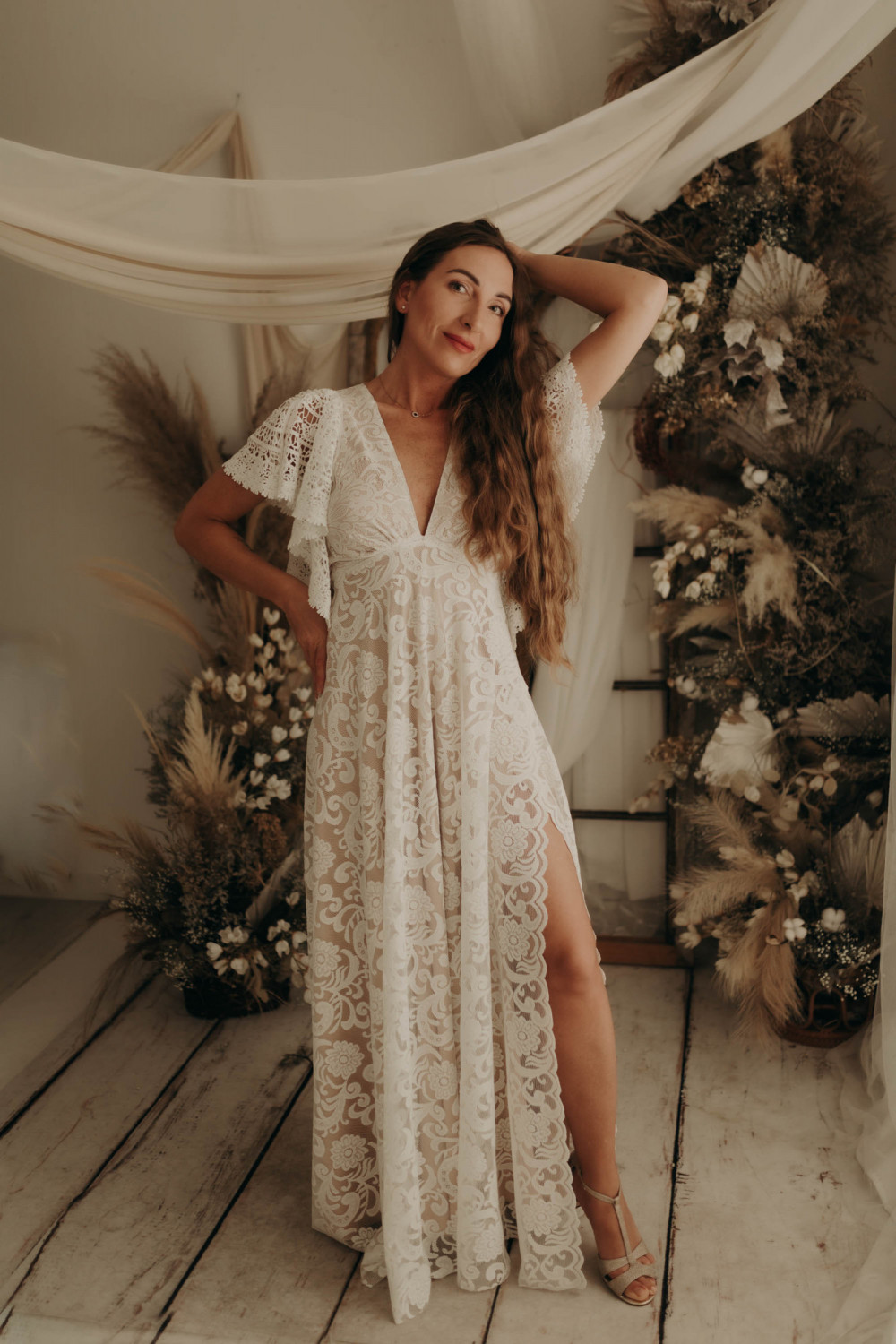 Dół sukni ma kształt litery A, który pięknie wydłuża sylwetkę i zapewnia swobodę ruchu. Rozcięcie na nodze dodaje całości nuty seksapilu i subtelnej pewności siebie, zachowując przy tym lekkość i elegancję charakterystyczną dla stylu boho.