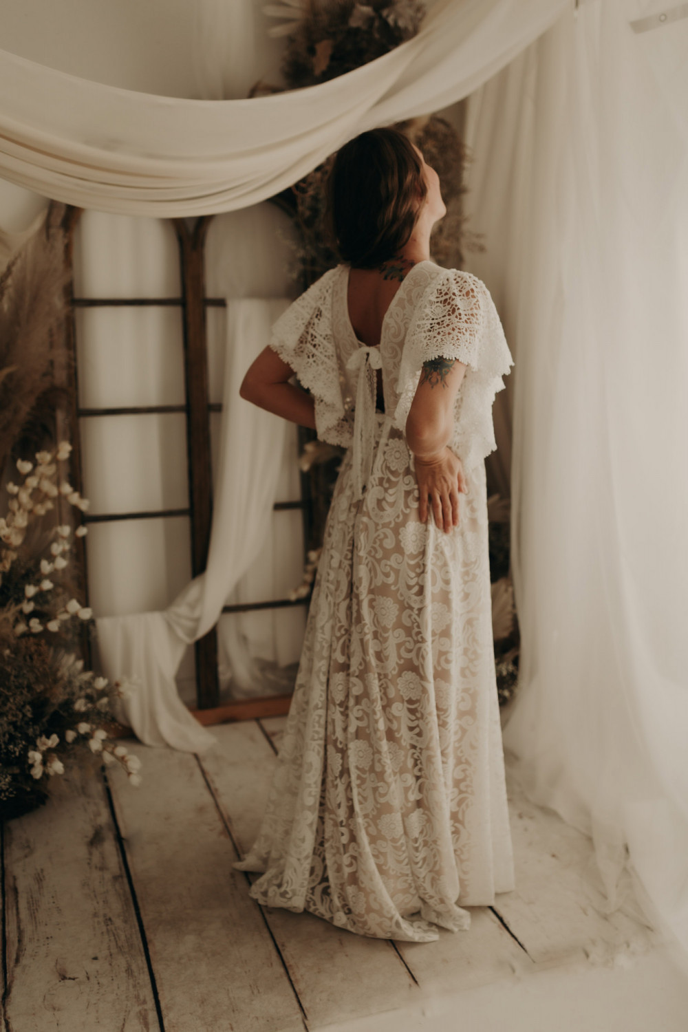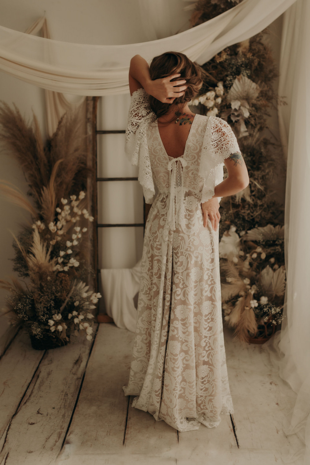 Suknia ślubna Natalia to wyjątkowa propozycja dla kobiet, które pragną połączyć romantyczny charakter z naturalnym wdziękiem stylu boho. Jej góra zachwyca głębokim dekoltem w kształcie litery V, który subtelnie podkreśla kobiecą sylwetkę, a otwarte plecy z koronkowym wiązaniem tworzą zmysłowy i jednocześnie niezwykle elegancki efekt.