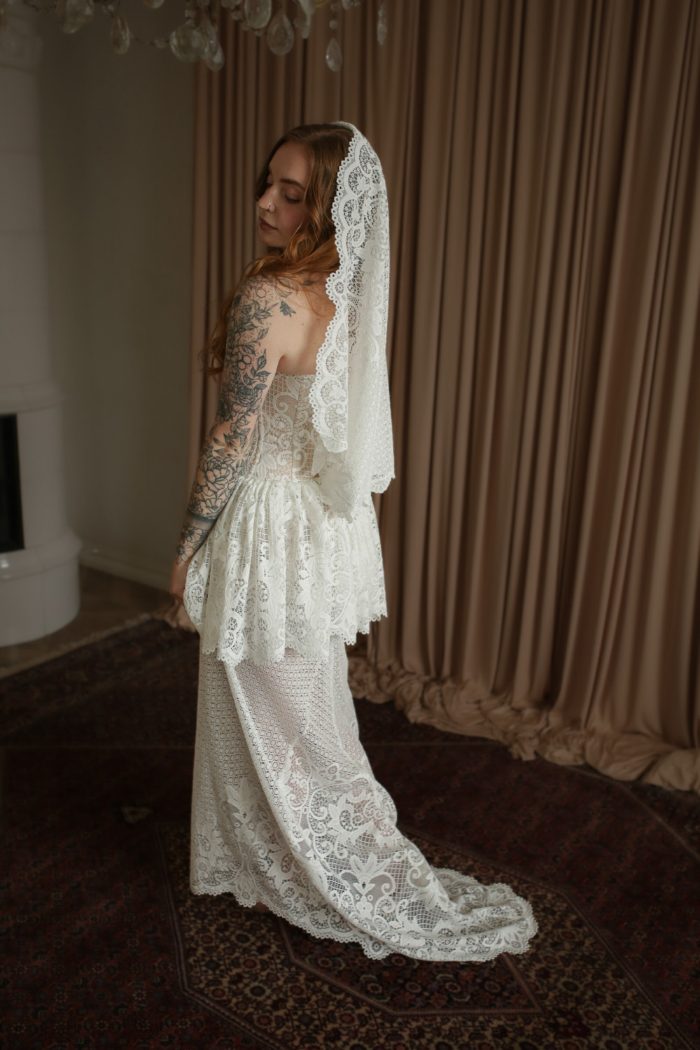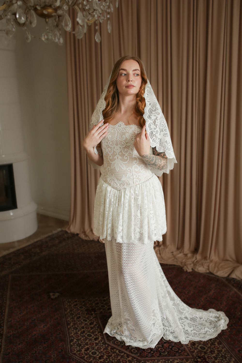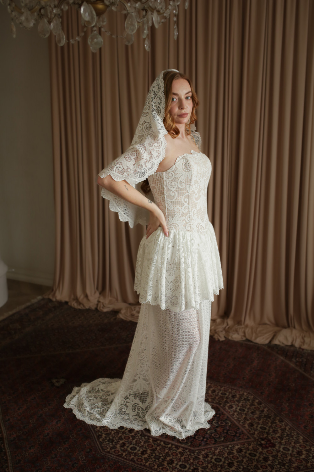 Całość uzupełnia delikatny koronkowy welon, który możesz znaleźć w zakładce Dodatki. To idealne dopełnienie tej wyjątkowej stylizacji – pełnej kobiecości, wdzięku i subtelnego blasku.
