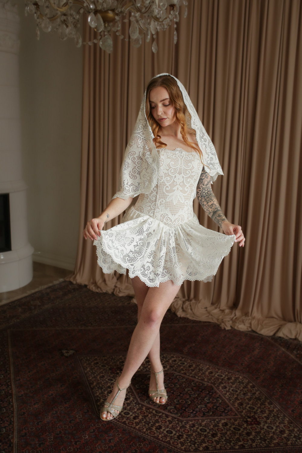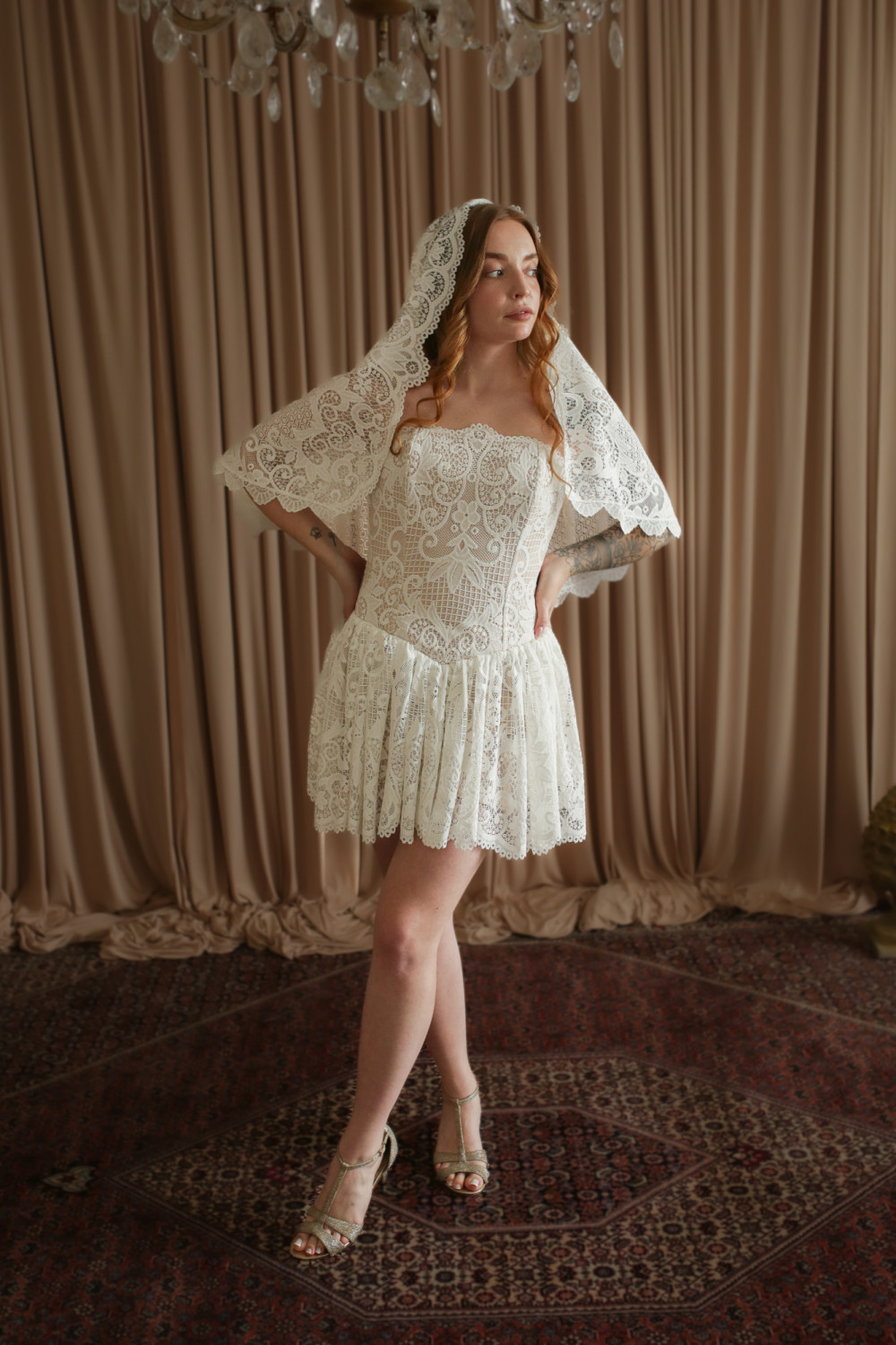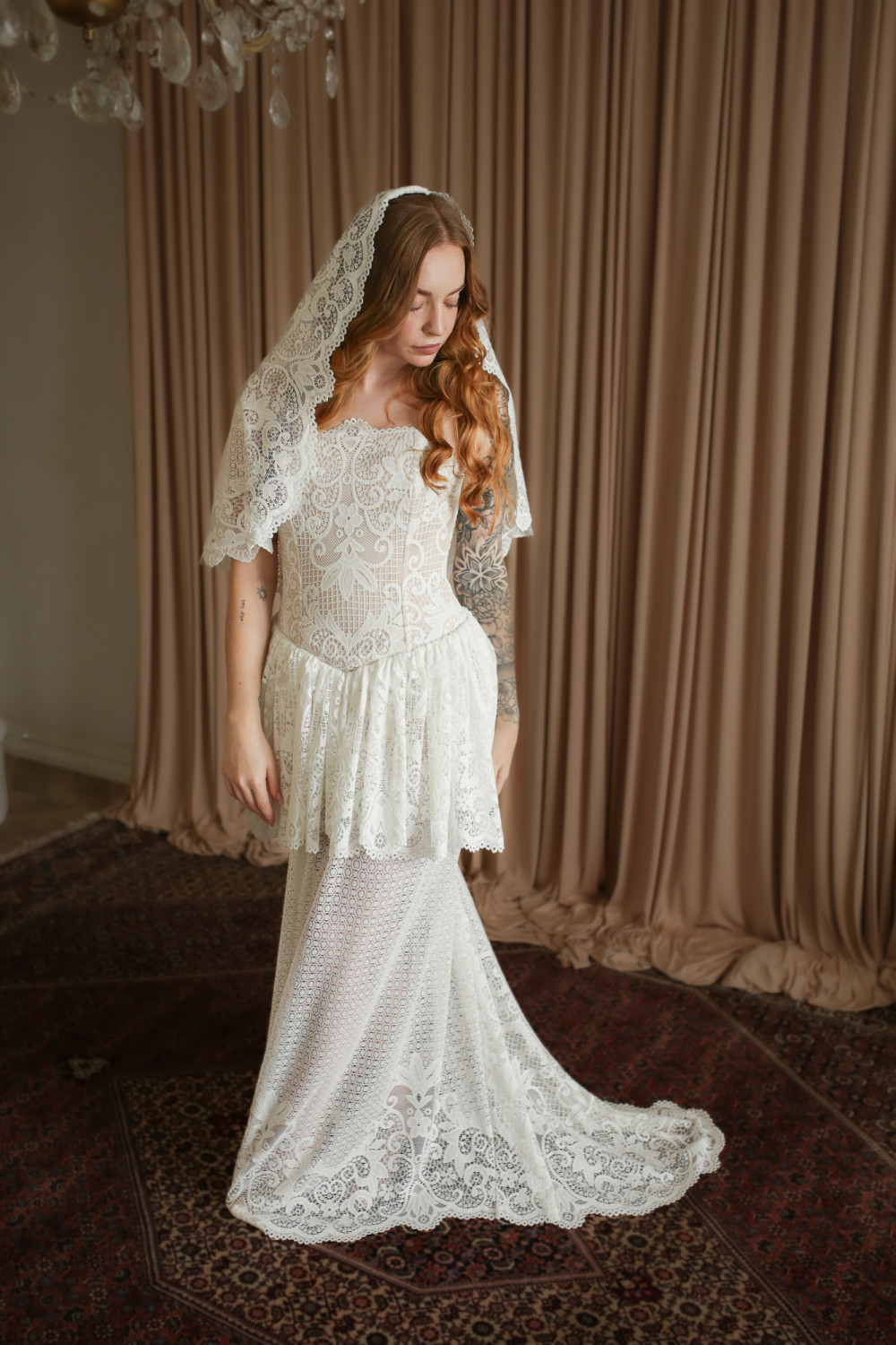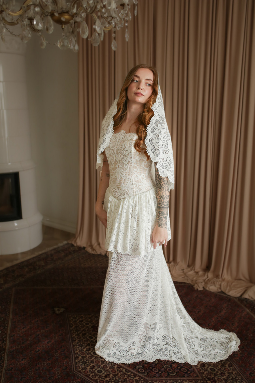 Całość uzupełnia delikatny koronkowy welon, który możesz znaleźć w zakładce Dodatki. To idealne dopełnienie tej wyjątkowej stylizacji – pełnej kobiecości, wdzięku i subtelnego blasku.