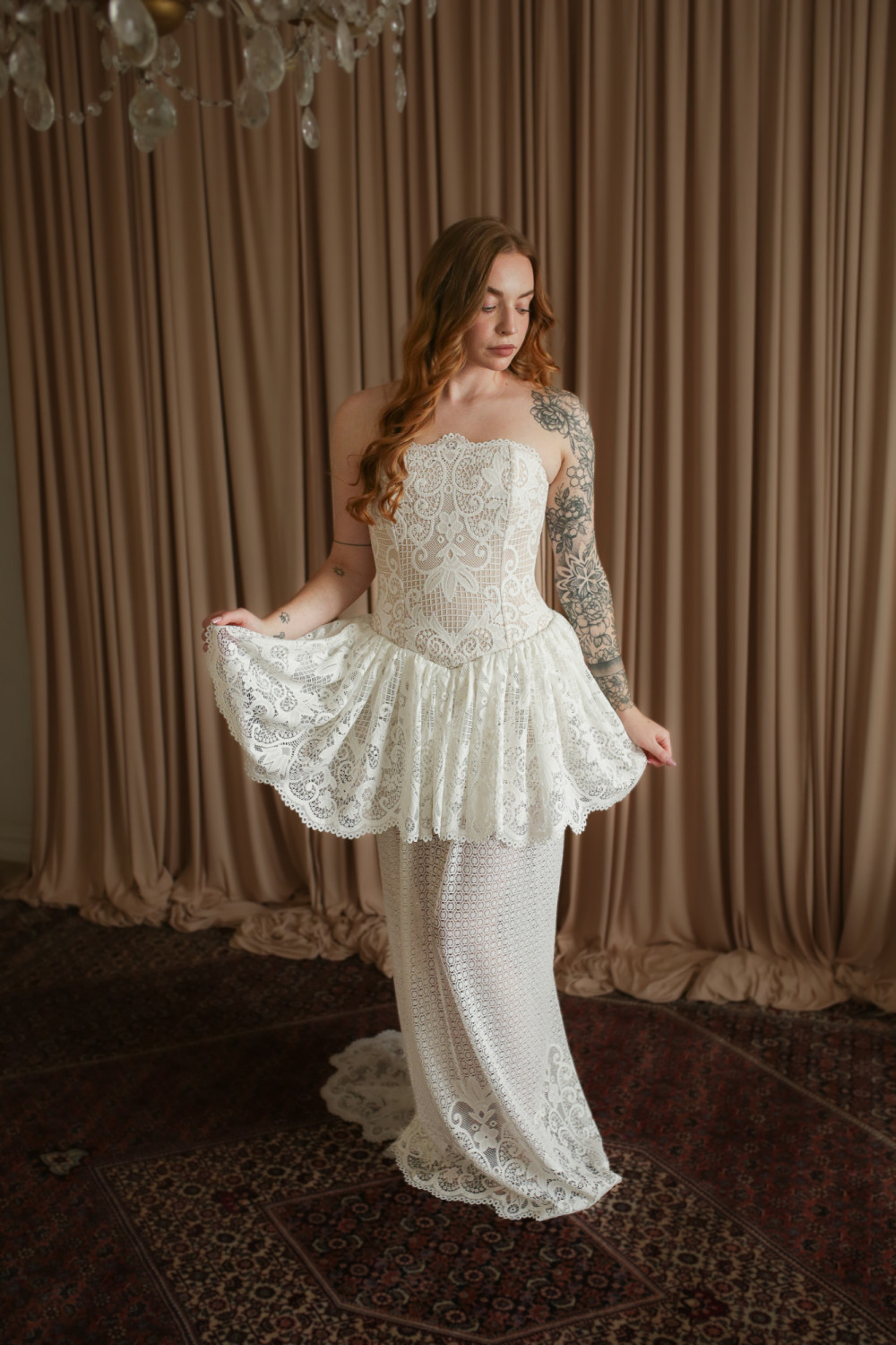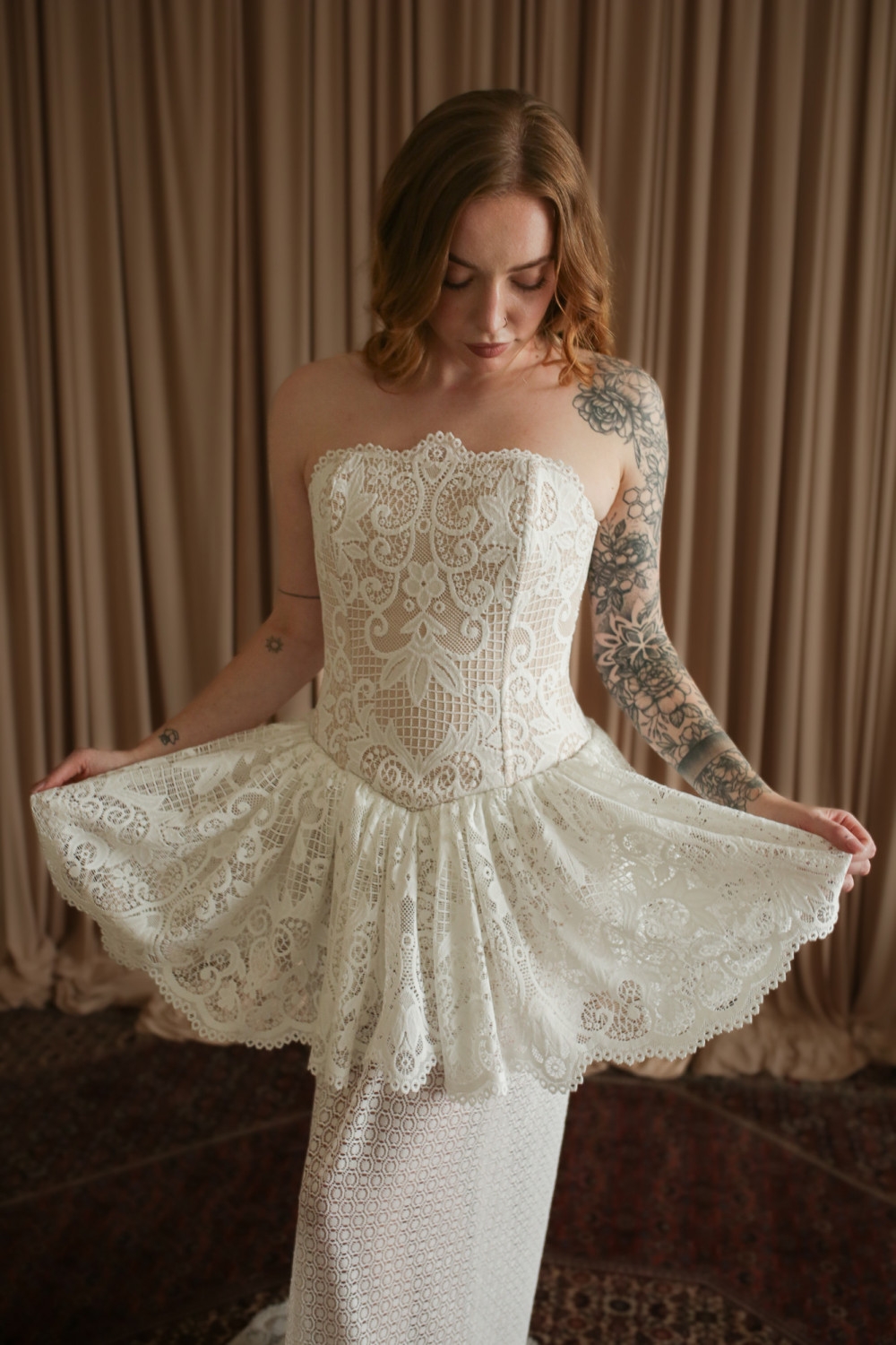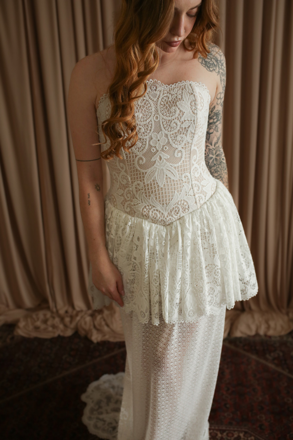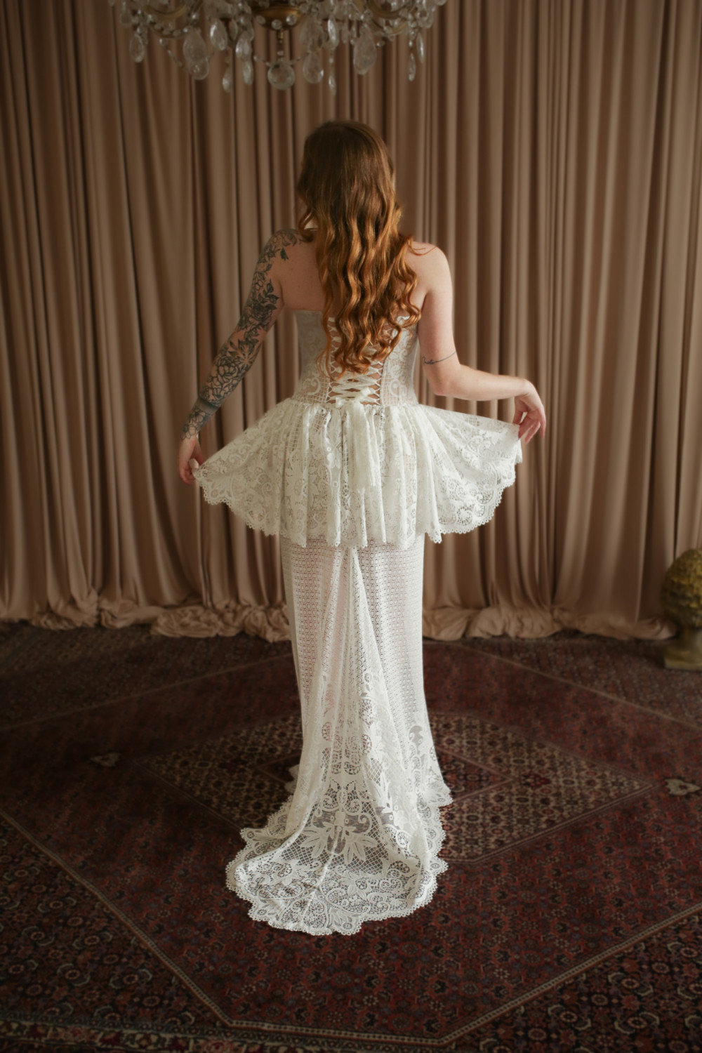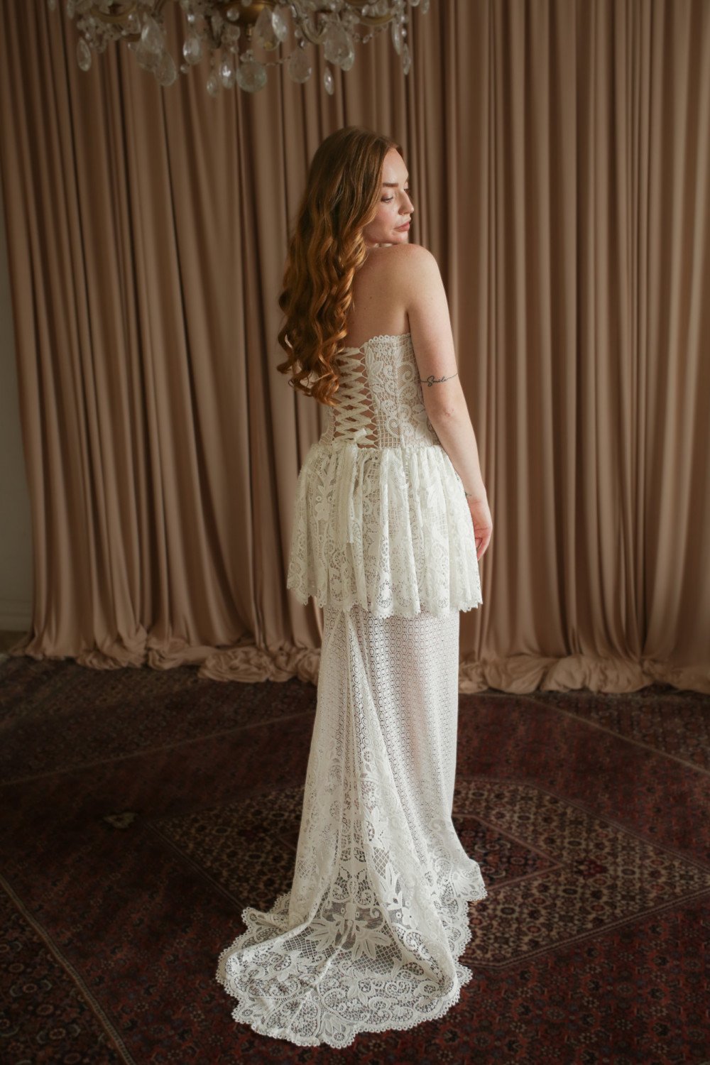 Gorsetowa góra z wyrazistym, koronkowym wzorem pięknie podkreśla sylwetkę, a wiązanie na plecach dodaje całości lekkości i romantycznego charakteru. Koronka, z której została wykonana suknia, zachwyca strukturą i głębią – tworząc efekt eleganckiego rzemiosła w nowoczesnym wydaniu.