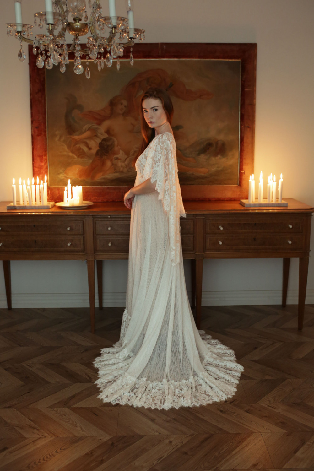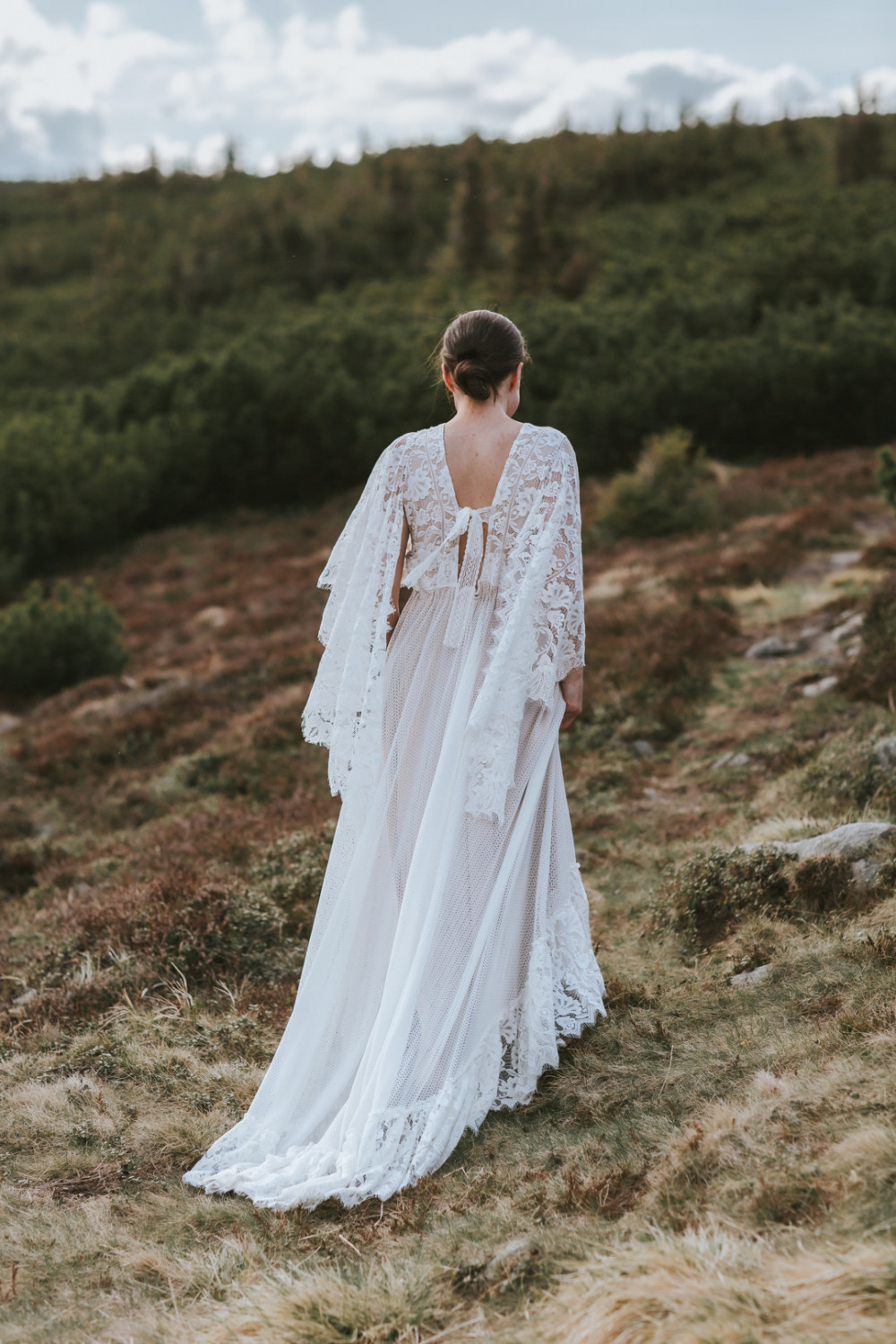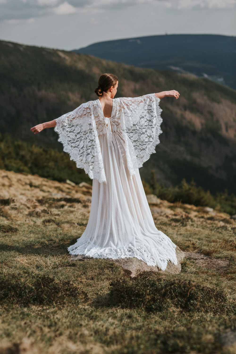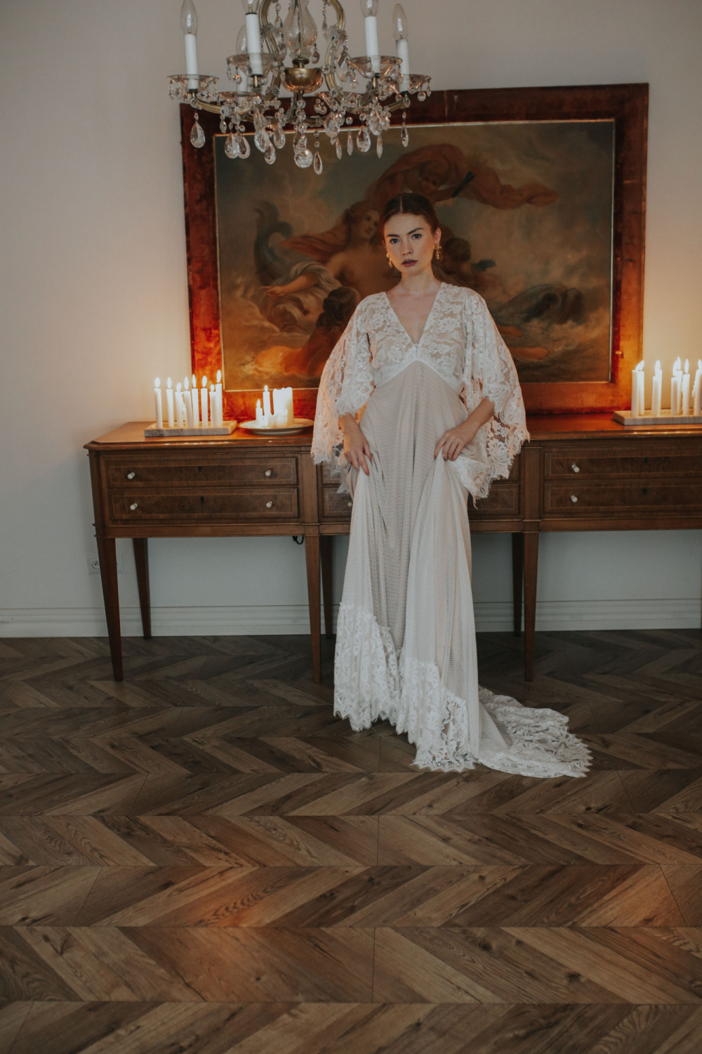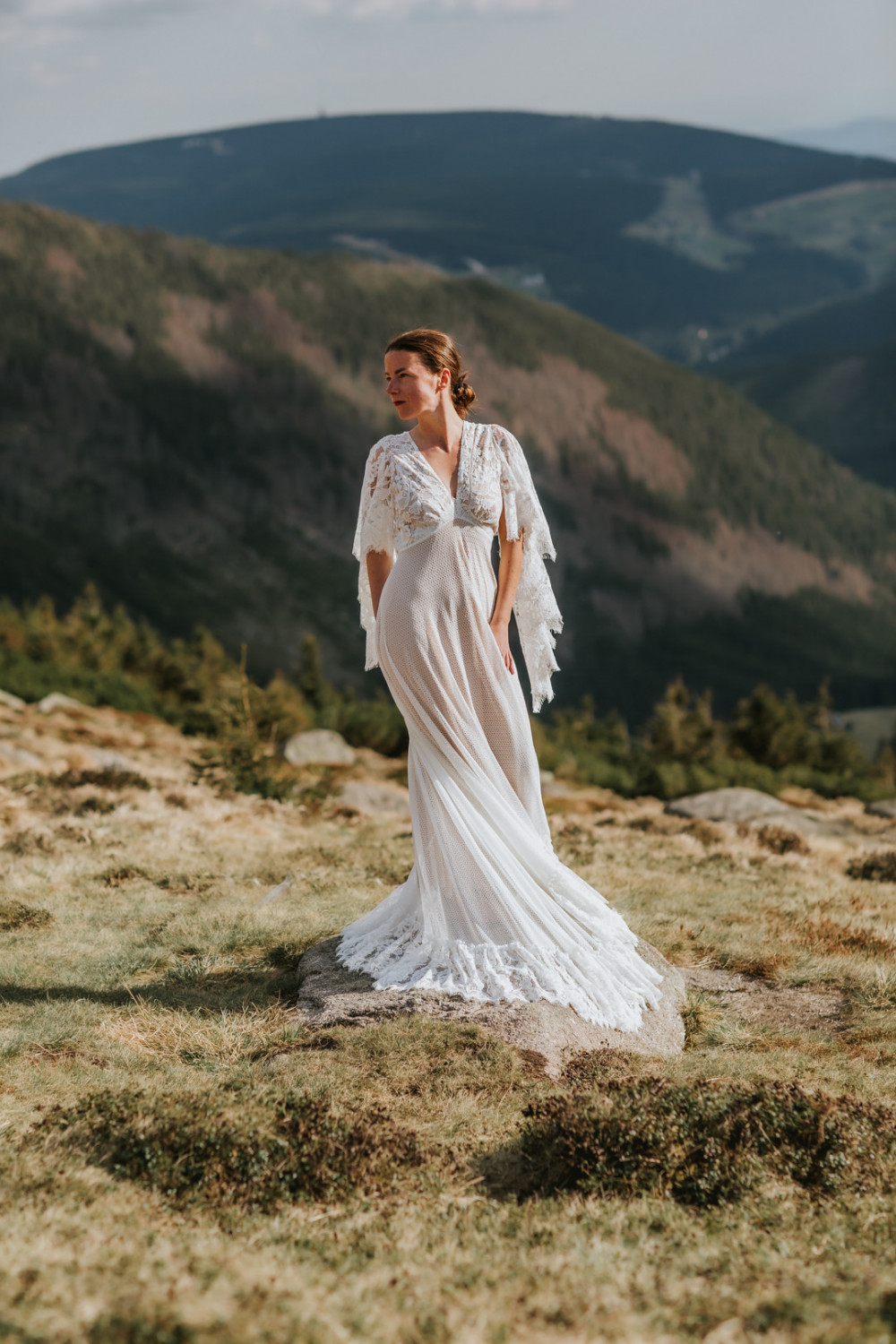 Suknia ślubna Julia to połączenie romantyzmu i artystycznej lekkości. Jej wyjątkowy krój z motylkowymi rękawamizachwyca subtelnym ruchem przy każdym geście, tworząc efekt niezwykłej miękkości i kobiecego wdzięku.