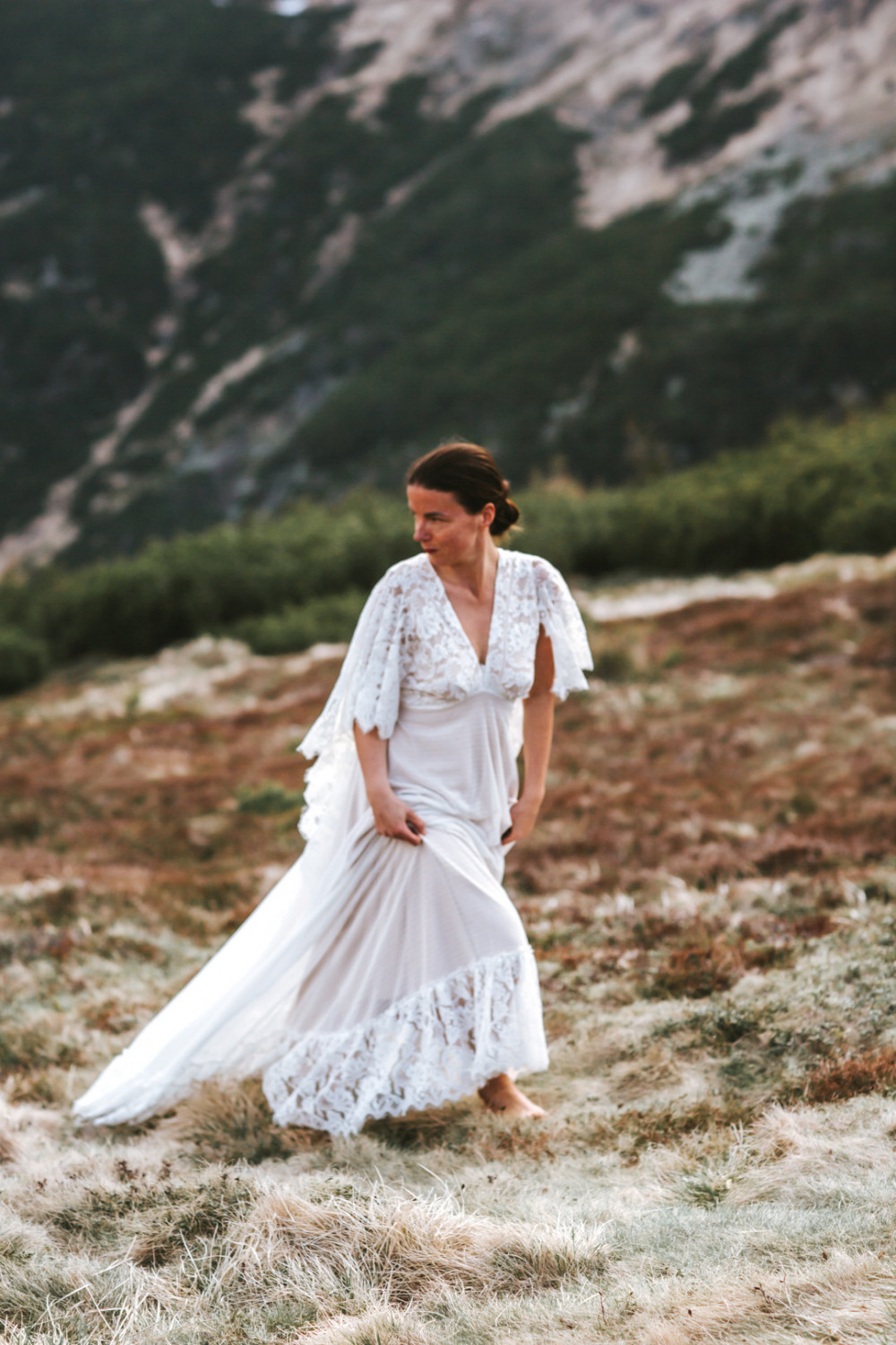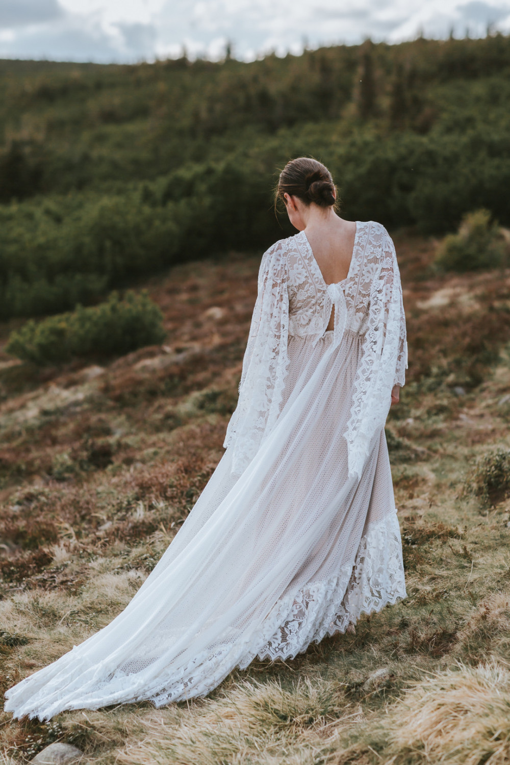 Korpus sukni został dopracowany tak, by pięknie układał się na sylwetce, podkreślając jej naturalne proporcje. Spódnica zakończona jest falbanką z tej samej, bogatej koronki, co rękawy, dzięki czemu całość tworzy harmonijną kompozycję.