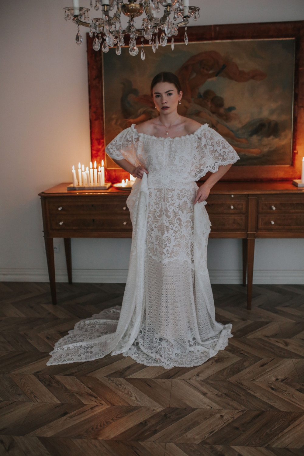 Dół sukni płynnie układa się w miękką spódnicę zakończoną koronkowym trenem, który nadaje całości elegancji i ponadczasowego uroku. To suknia dla kobiet pewnych siebie, eterycznych i pełnych wdzięku, które cenią połączenie klasyki z subtelną nutą hiszpańskiego temperamentu.