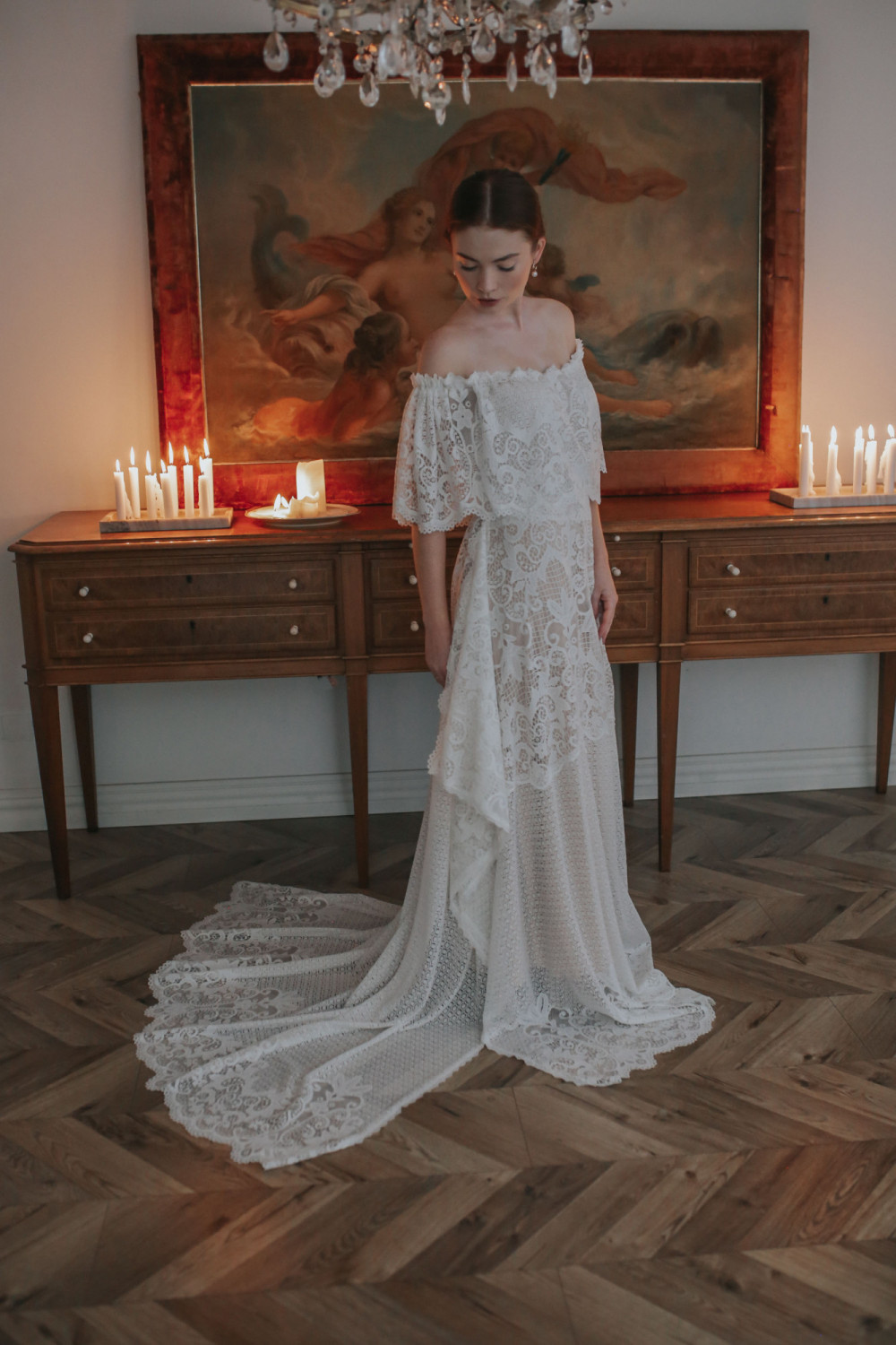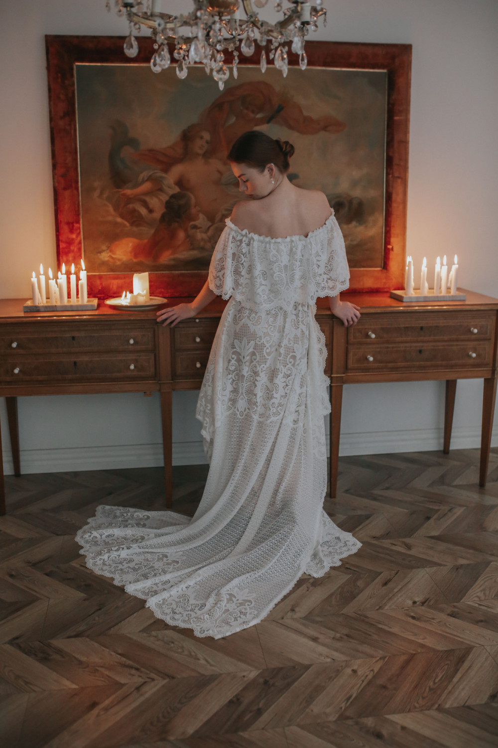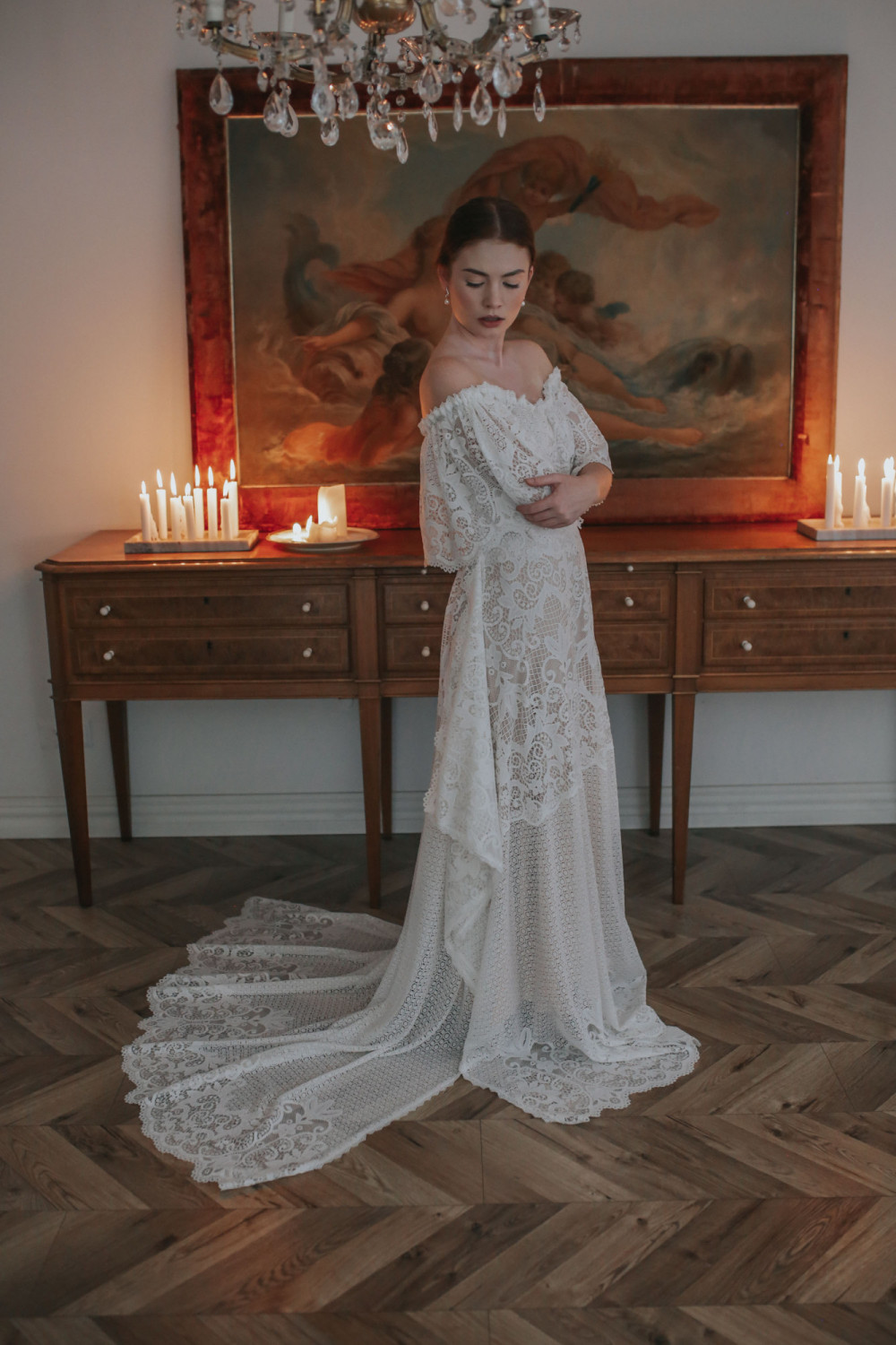 Luźne, koronkowe rękawy miękko opadają na ramiona, poruszając się lekko przy każdym ruchu. Ich swobodna forma nadaje kreacji lekkości i harmonii, tworząc spójną linię z całą sylwetką. Koronka o bogatym, roślinnym wzorzepodkreśla wyjątkowość tego projektu — łącząc tradycję z nowoczesnym wyrafinowaniem.