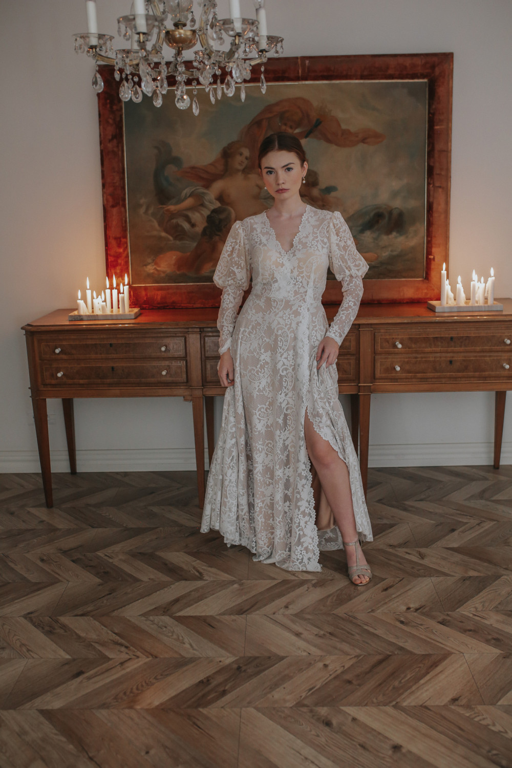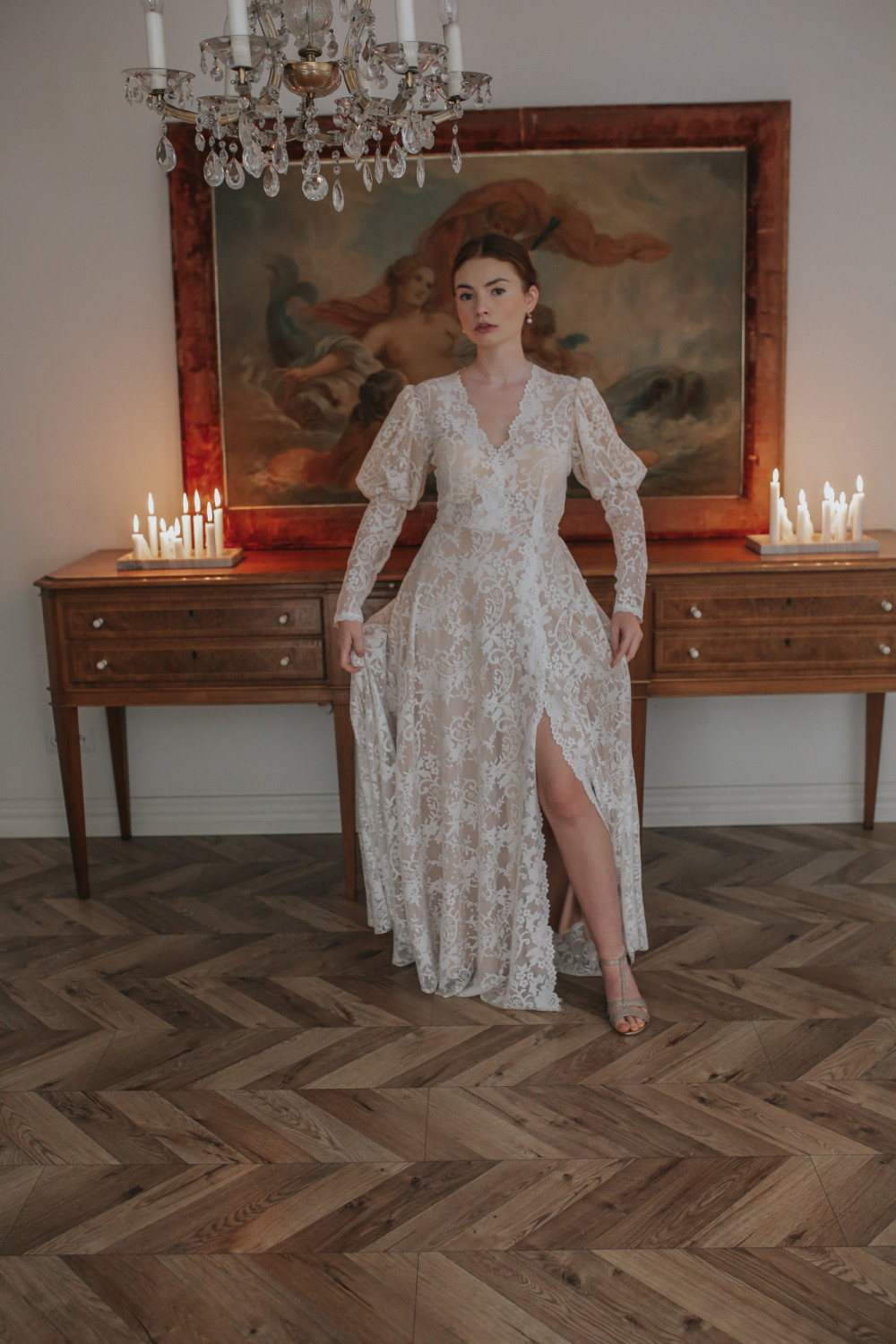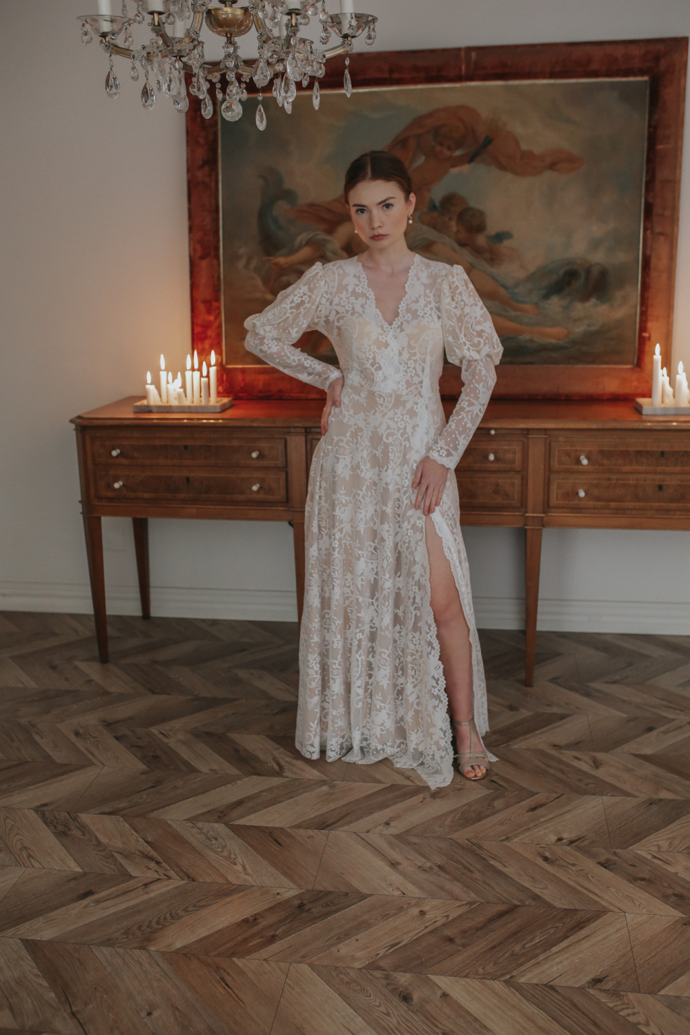 Dekolt w kształcie litery V pięknie wysmukla sylwetkę i podkreśla kobiecość, a rękawy z bufiastą górą i długimi mankietami tworzą efektowny, a zarazem harmonijny detal nadający sukni wyrafinowanego charakteru.