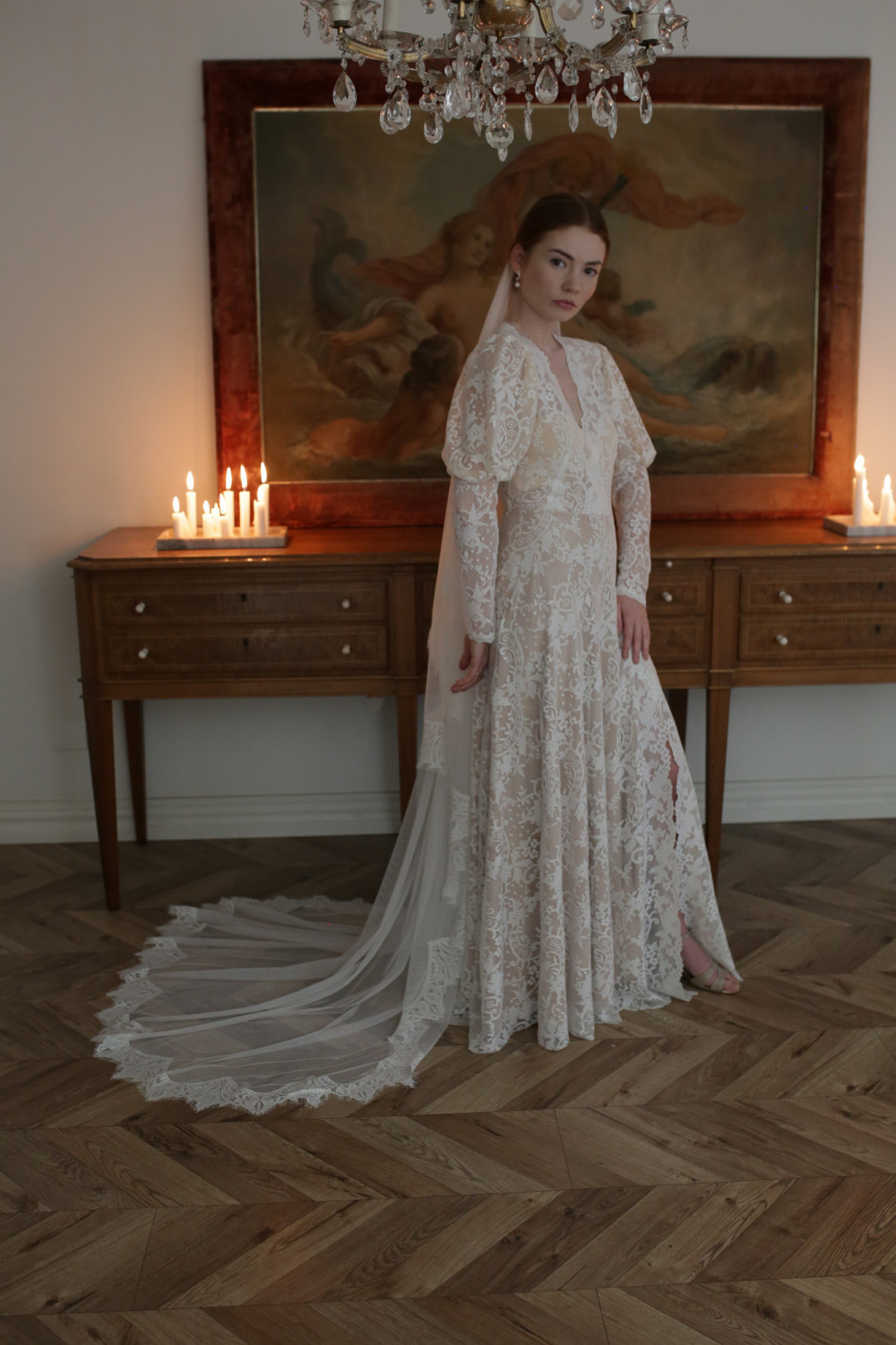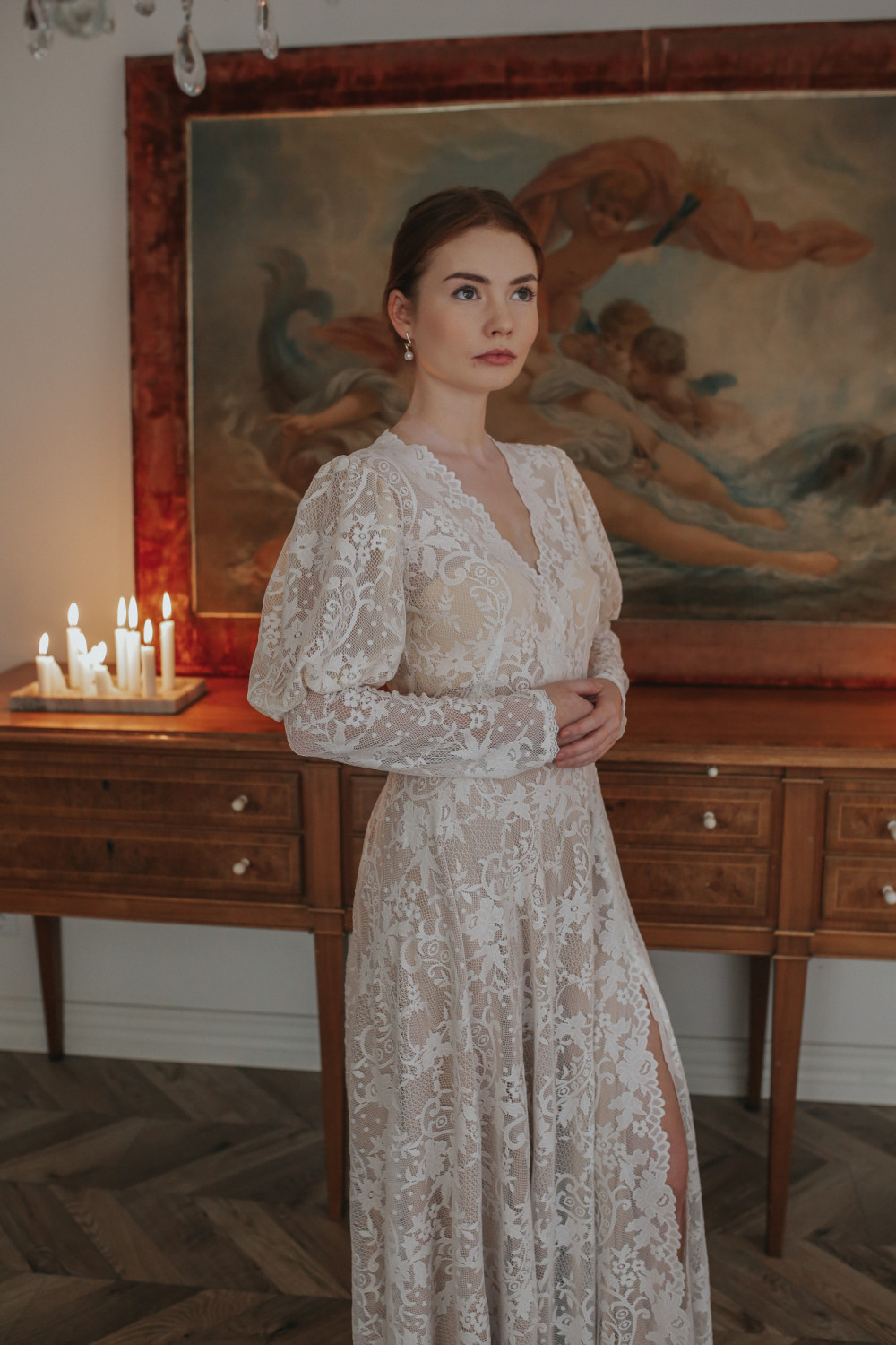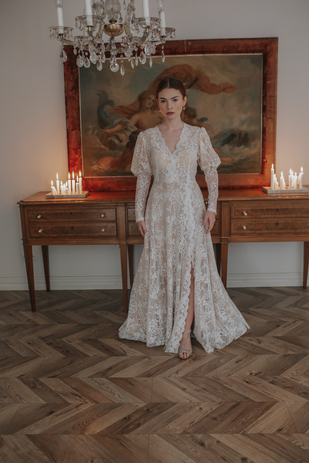 Dekolt w kształcie litery V pięknie wysmukla sylwetkę i podkreśla kobiecość, a rękawy z bufiastą górą i długimi mankietami tworzą efektowny, a zarazem harmonijny detal nadający sukni wyrafinowanego charakteru.