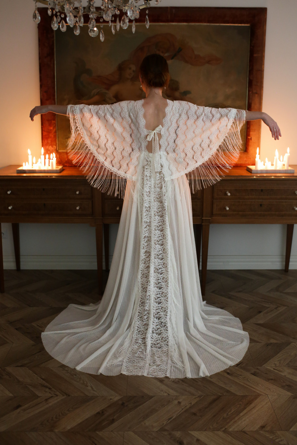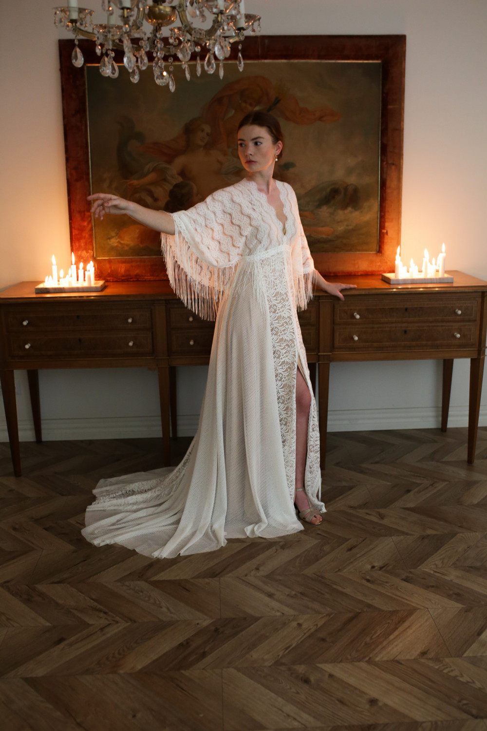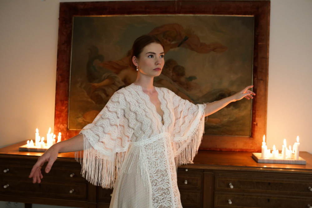 Najbardziej charakterystycznym elementem tej kreacji są rękawy o niespotykanym kształcie, ozdobione długimi frędzlami, które miękko poruszają się przy każdym ruchu, nadając sukni lekkości i ekspresji. Tworzą one niezwykły efekt — pełen swobody i naturalnego wdzięku.