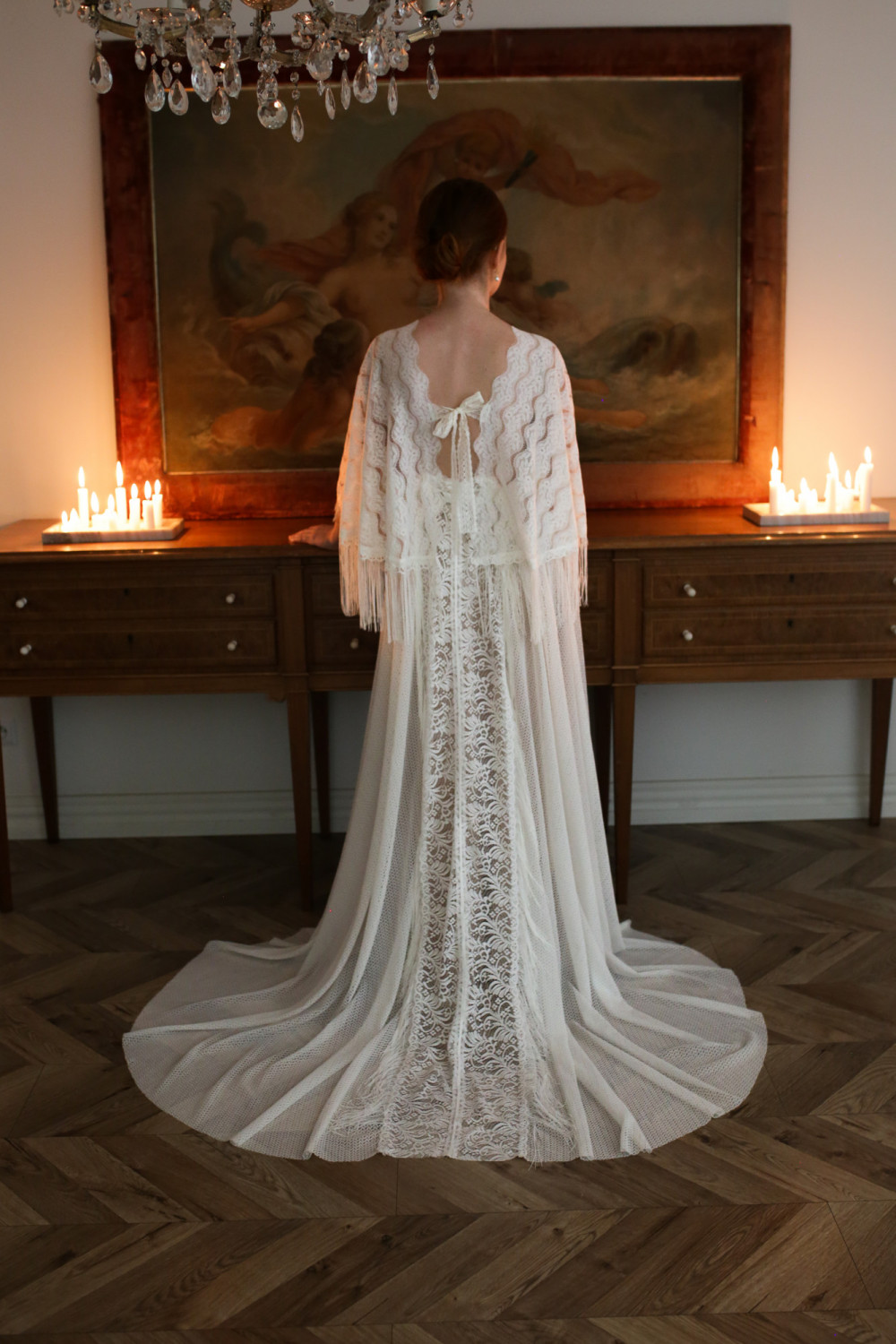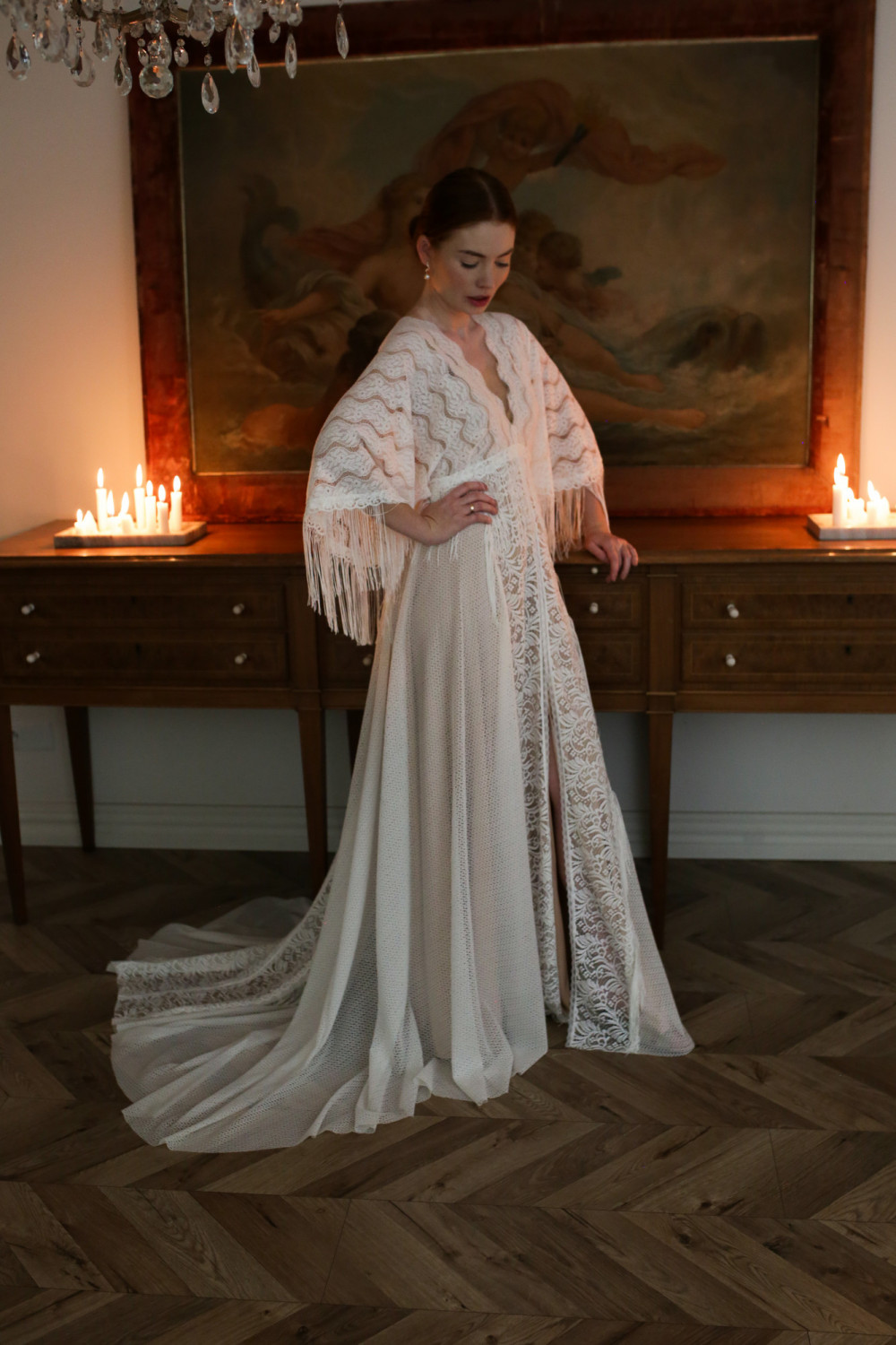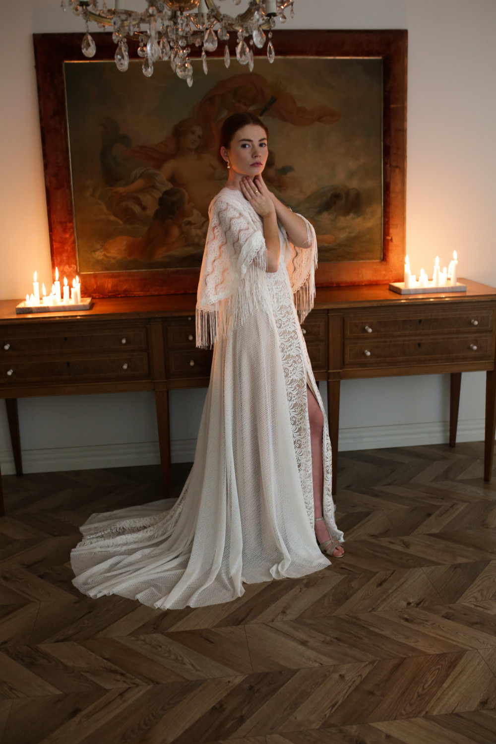 Najbardziej charakterystycznym elementem tej kreacji są rękawy o niespotykanym kształcie, ozdobione długimi frędzlami, które miękko poruszają się przy każdym ruchu, nadając sukni lekkości i ekspresji. Tworzą one niezwykły efekt — pełen swobody i naturalnego wdzięku.