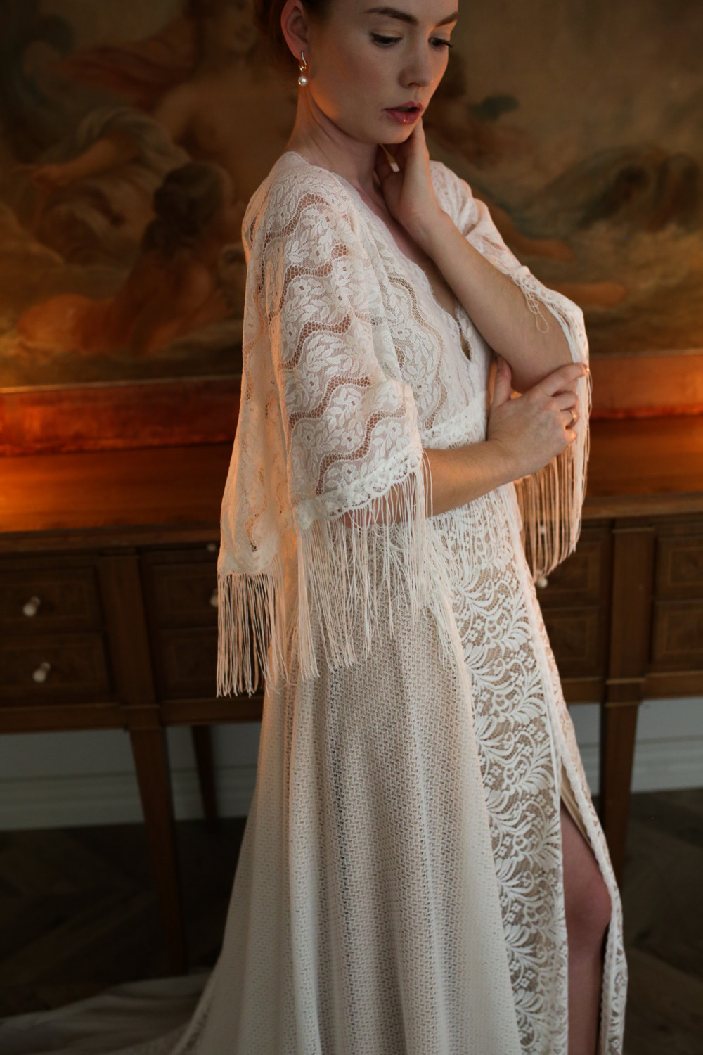 Wzdłuż rozcięcia spódnicy biegnie dekoracyjny pas koronki, który nie tylko podkreśla linię nogi, ale także optycznie wysmukla sylwetkę, dodając całości harmonii i elegancji. Dół sukni miękko spływa ku ziemi, układając się w delikatny tren, który podkreśla jej wytworny charakter.