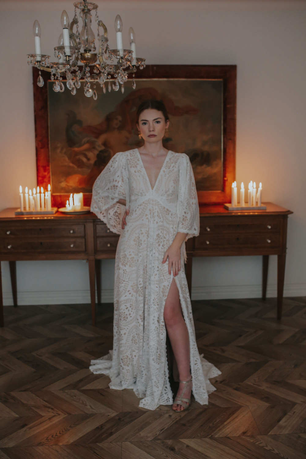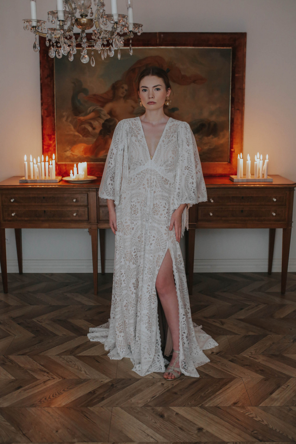 Suknia ślubna Frędzelki to wyjątkowe połączenie swobody stylu boho z nutą artystycznej elegancji. Wykonana z pięknej, ażurowej koronki, zachwyca swoim bogatym wzorem i wyjątkowym krojem, który podkreśla naturalne piękno sylwetki. Z przodu suknia urzeka głębokim dekoltem w kształcie litery V, nadając całości zmysłowości i lekkości.