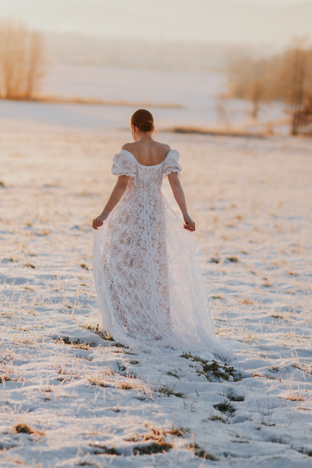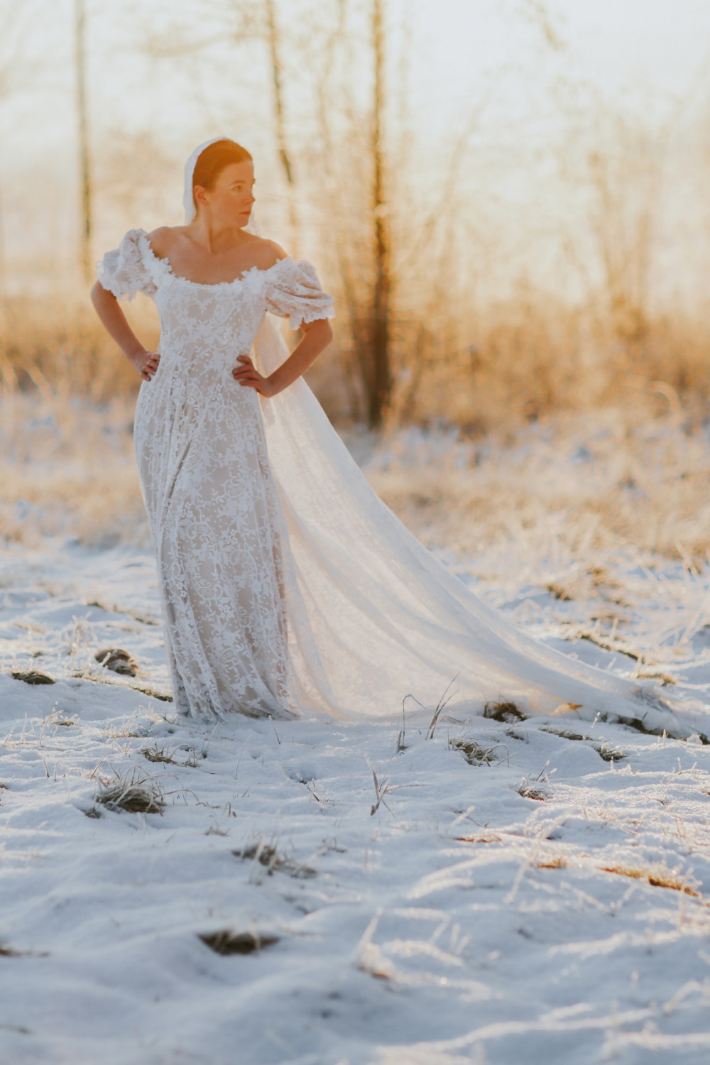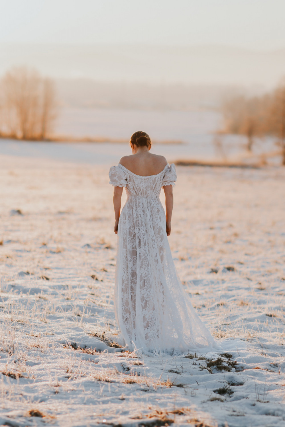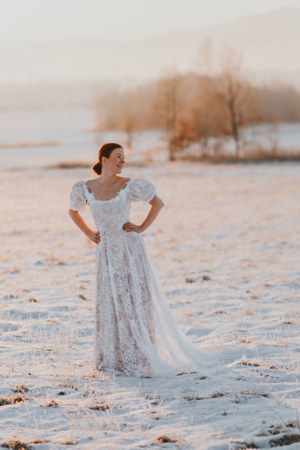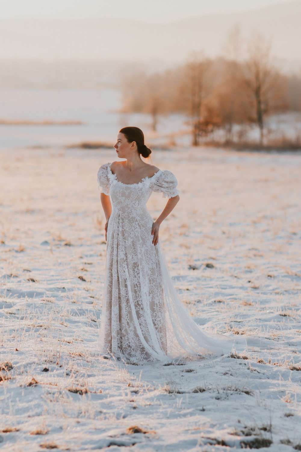 Suknia ślubna Wschód Słońca to hołd dla delikatności, światła i kobiecego wdzięku. Jej subtelna forma i romantyczny charakter sprawiają, że całość prezentuje się niezwykle lekko i harmonijnie — niczym poranny blask o wschodzie dnia.