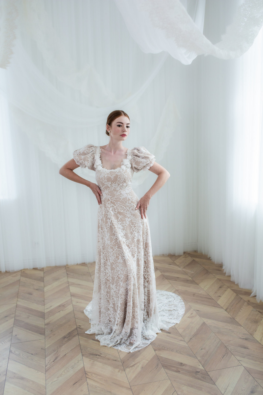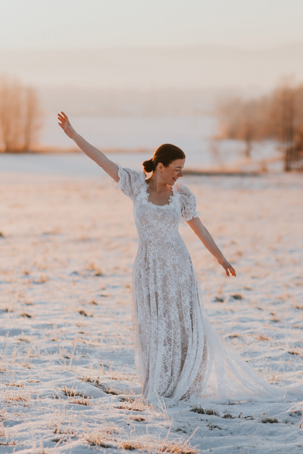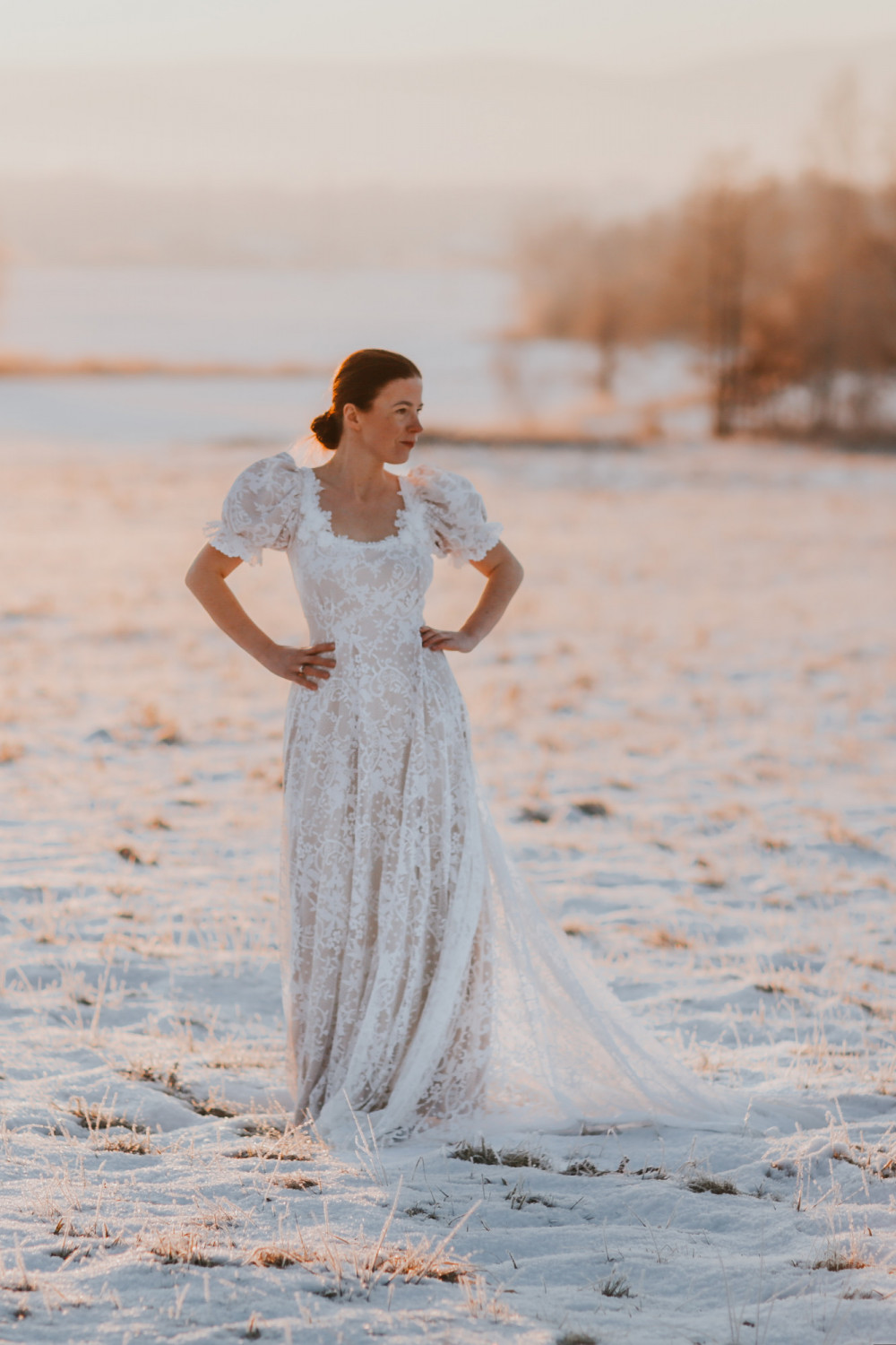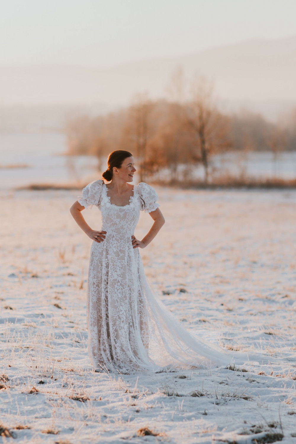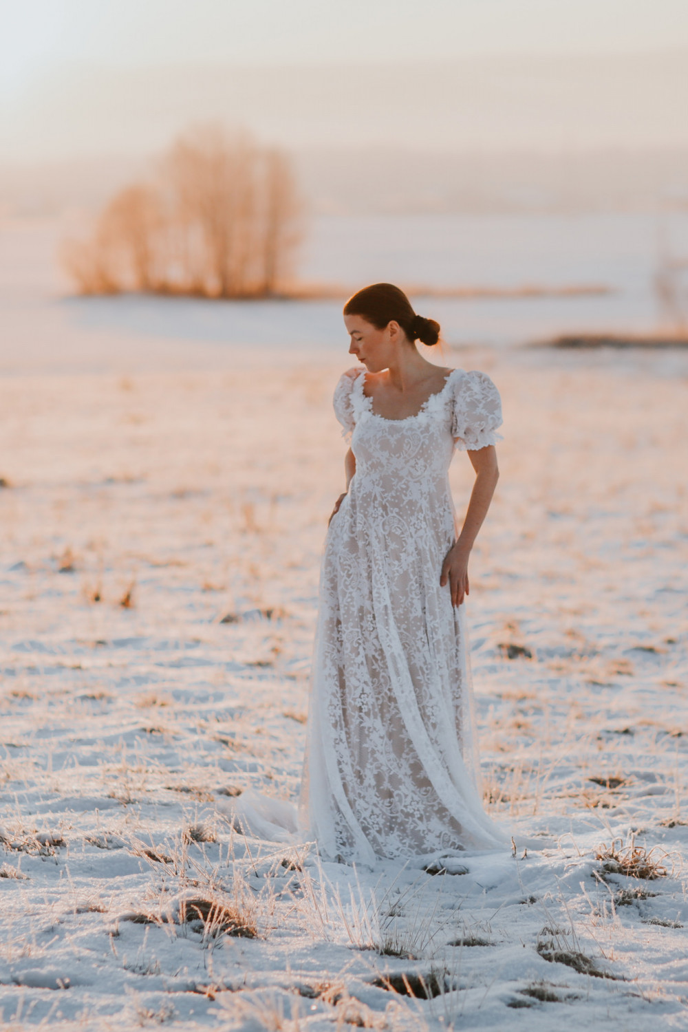 Suknia ślubna Wschód Słońca to hołd dla delikatności, światła i kobiecego wdzięku. Jej subtelna forma i romantyczny charakter sprawiają, że całość prezentuje się niezwykle lekko i harmonijnie — niczym poranny blask o wschodzie dnia.