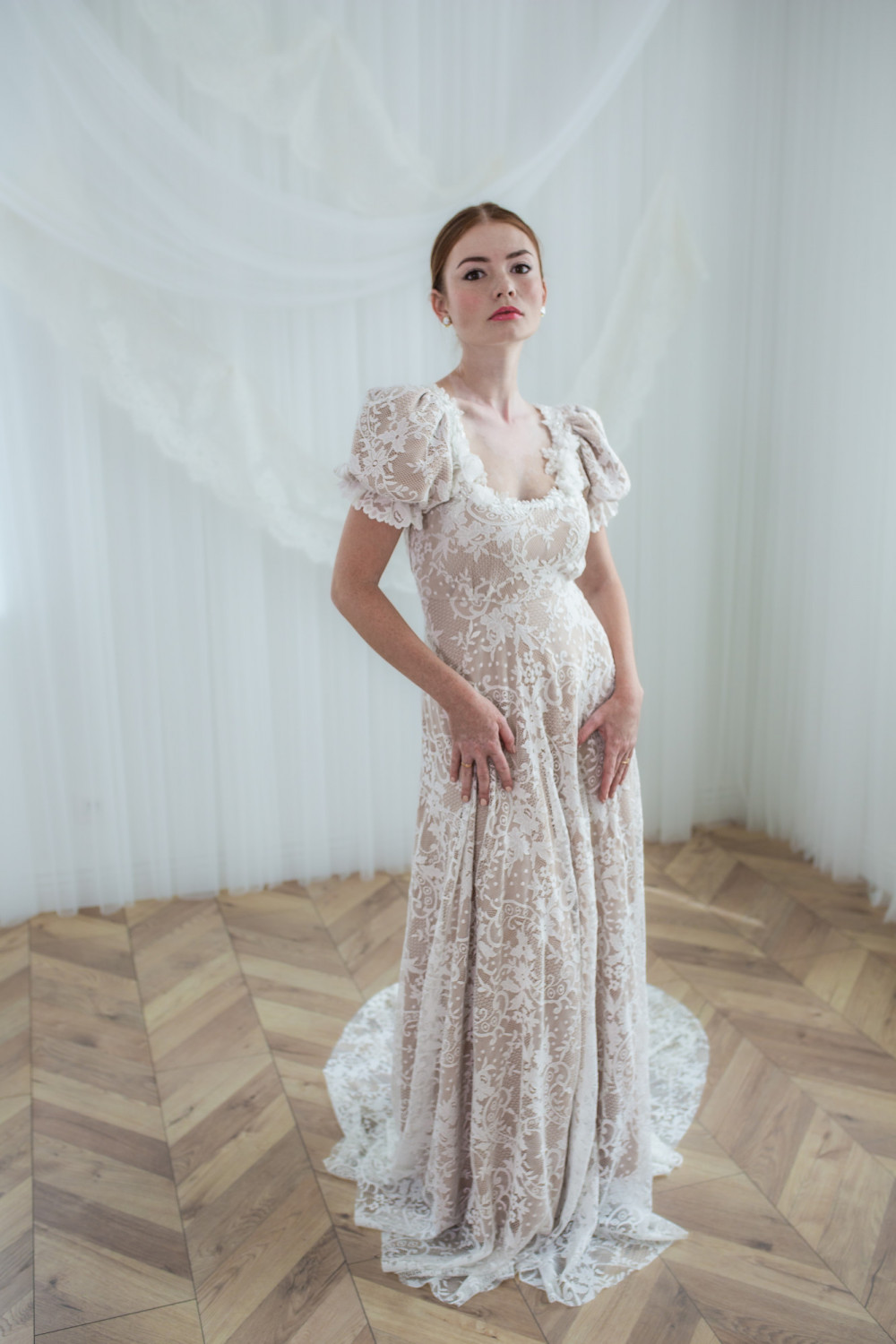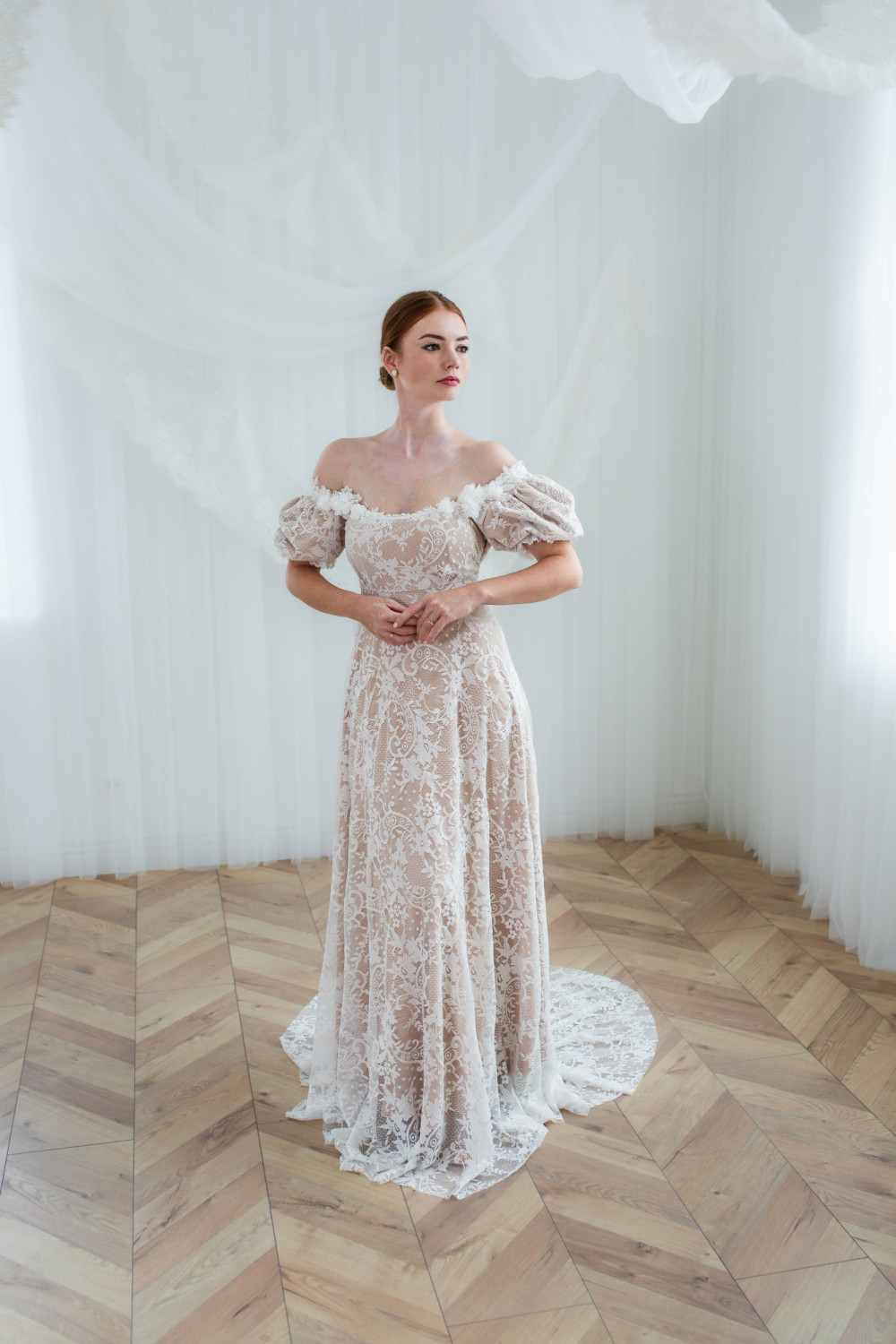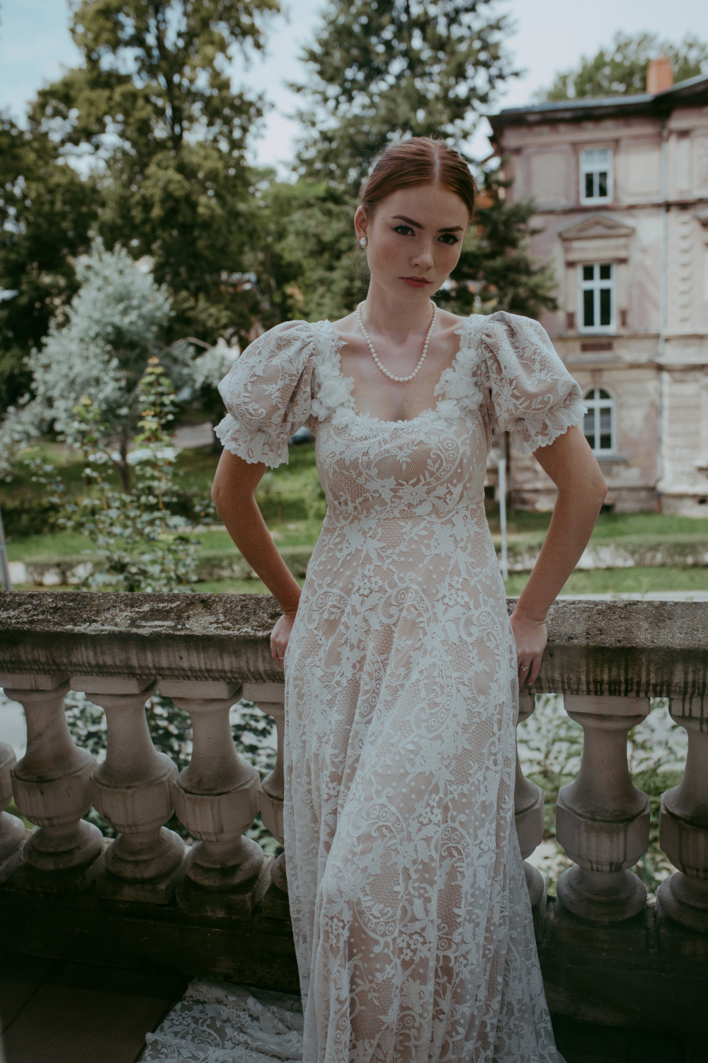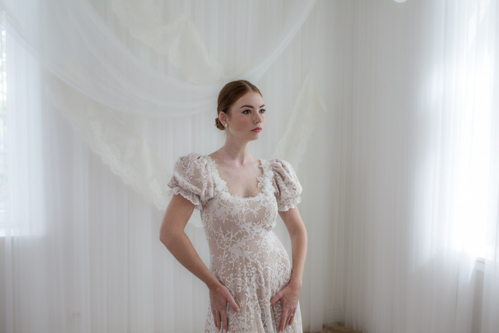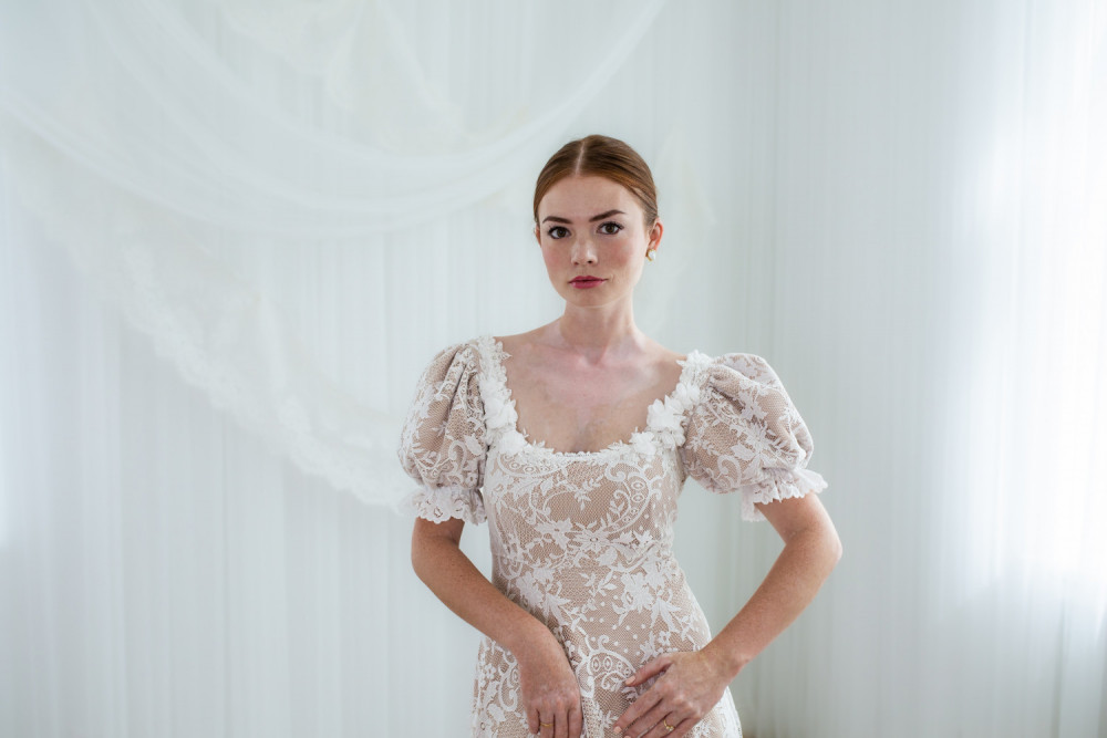 Góra sukni zachwyca kwadratowym dekoltem, ozdobionym aplikacjami kwiatowymi 3D, które pięknie podkreślają linię szyi i ramion. Bufiaste rękawy dodają sylwetce elegancji i szlachetności, tworząc subtelne nawiązanie do stylu vintage.