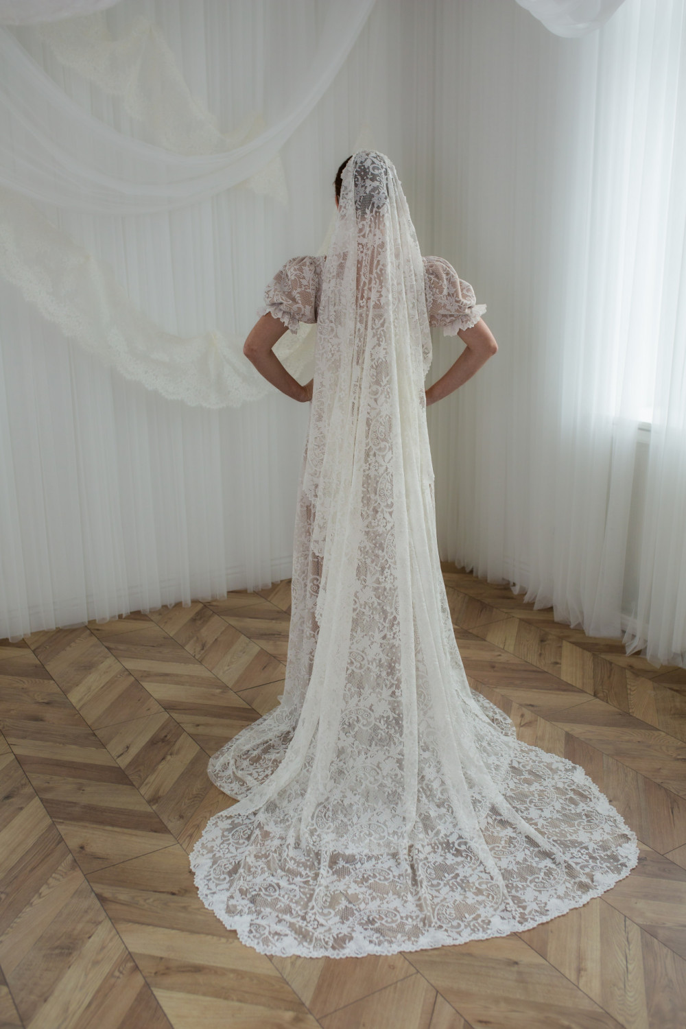 Do sukni ślubnej Wschód Słońca dostępny jest pasujący welon, który możesz znaleźć w zakładce Dodatki. Razem tworzą pełną wdzięku stylizację o ponadczasowym uroku.