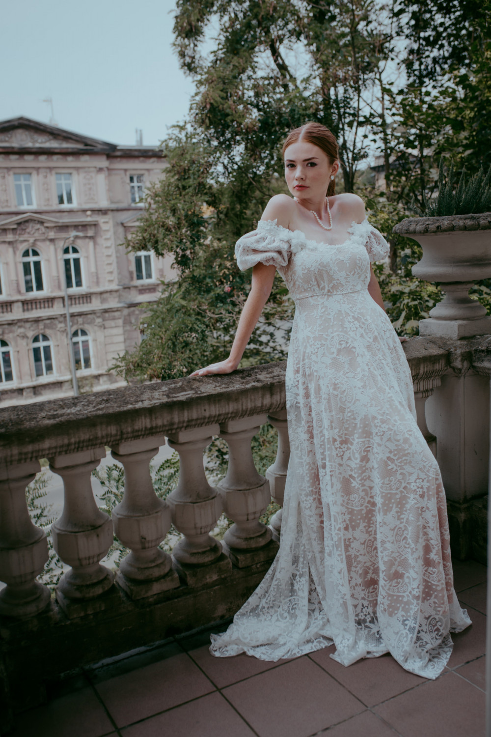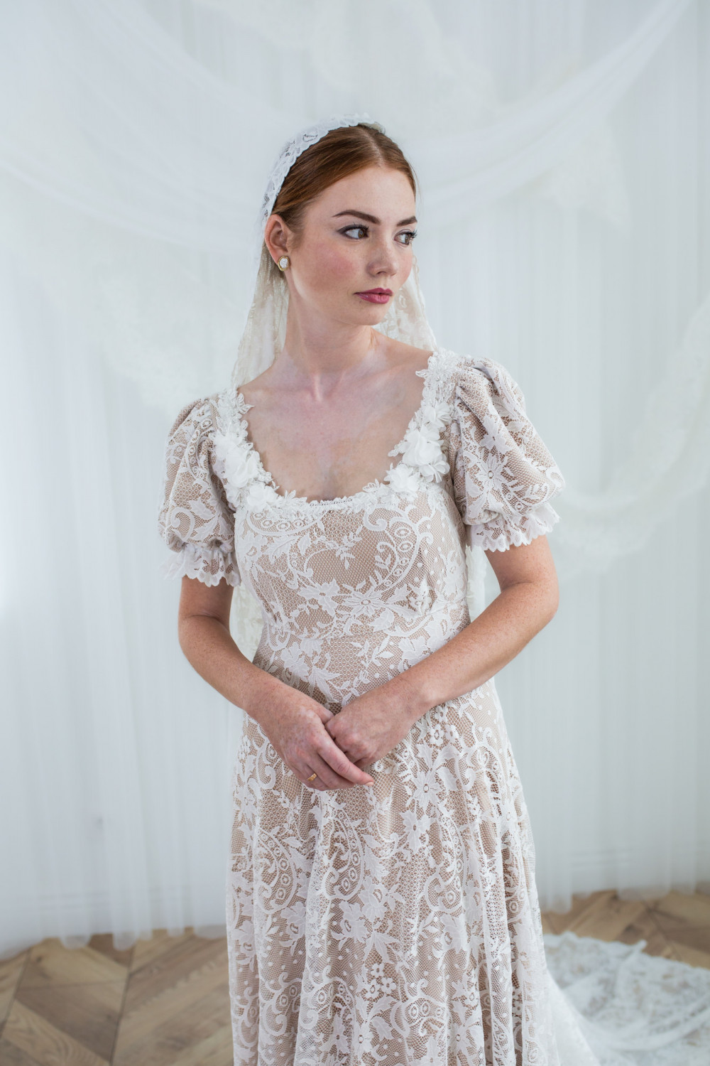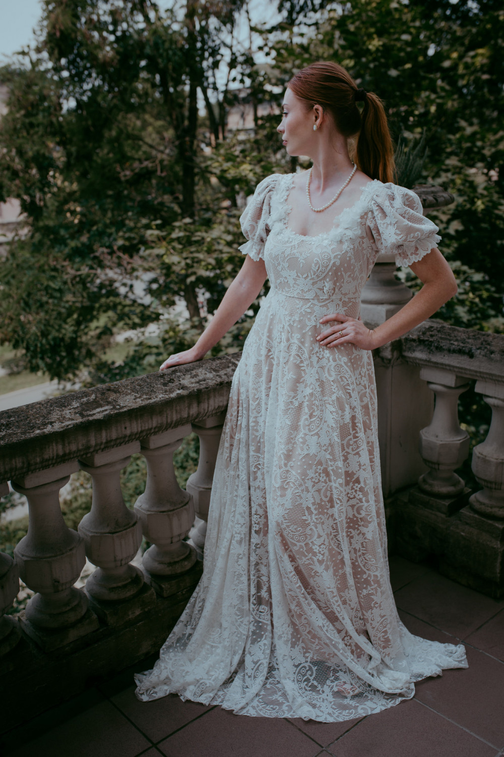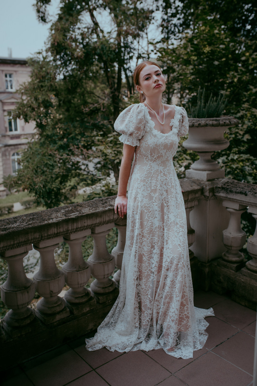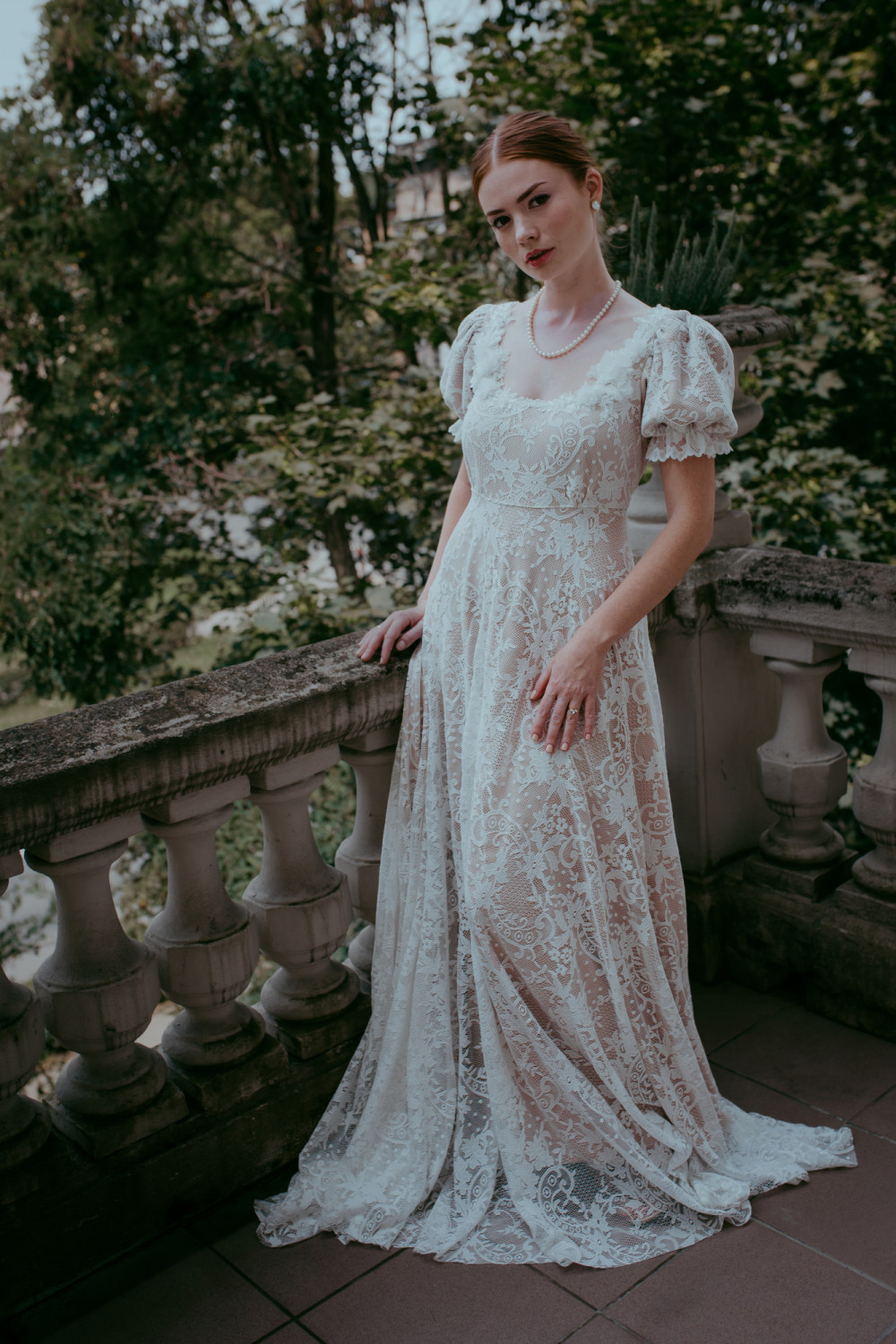 Całość wykonana została z delikatnej koronki w kwiatowy wzór, która miękko układa się na sylwetce, tworząc efekt lekkości i naturalnego ruchu. Spódnica o klasycznej linii A spływa ku ziemi z gracją, dopełniając romantycznego charakteru projektu.