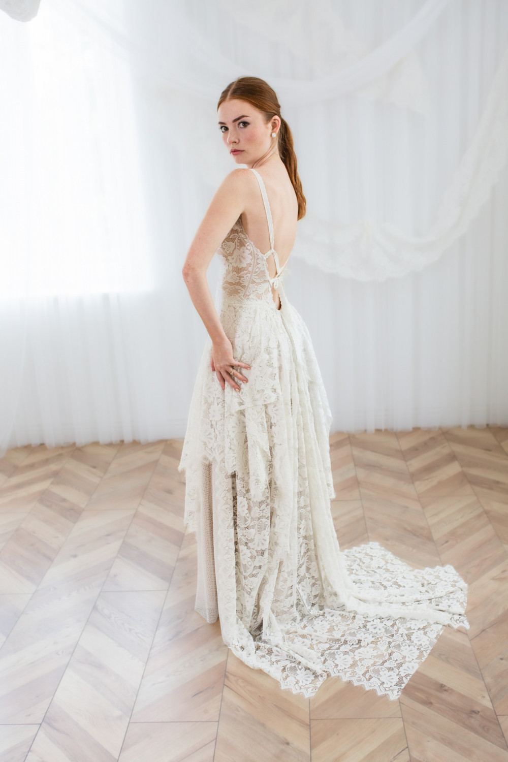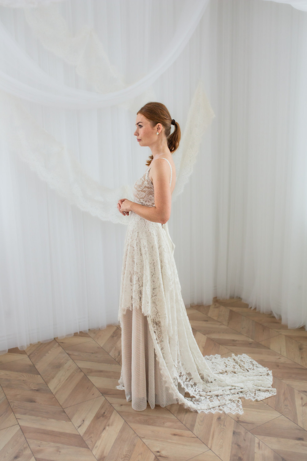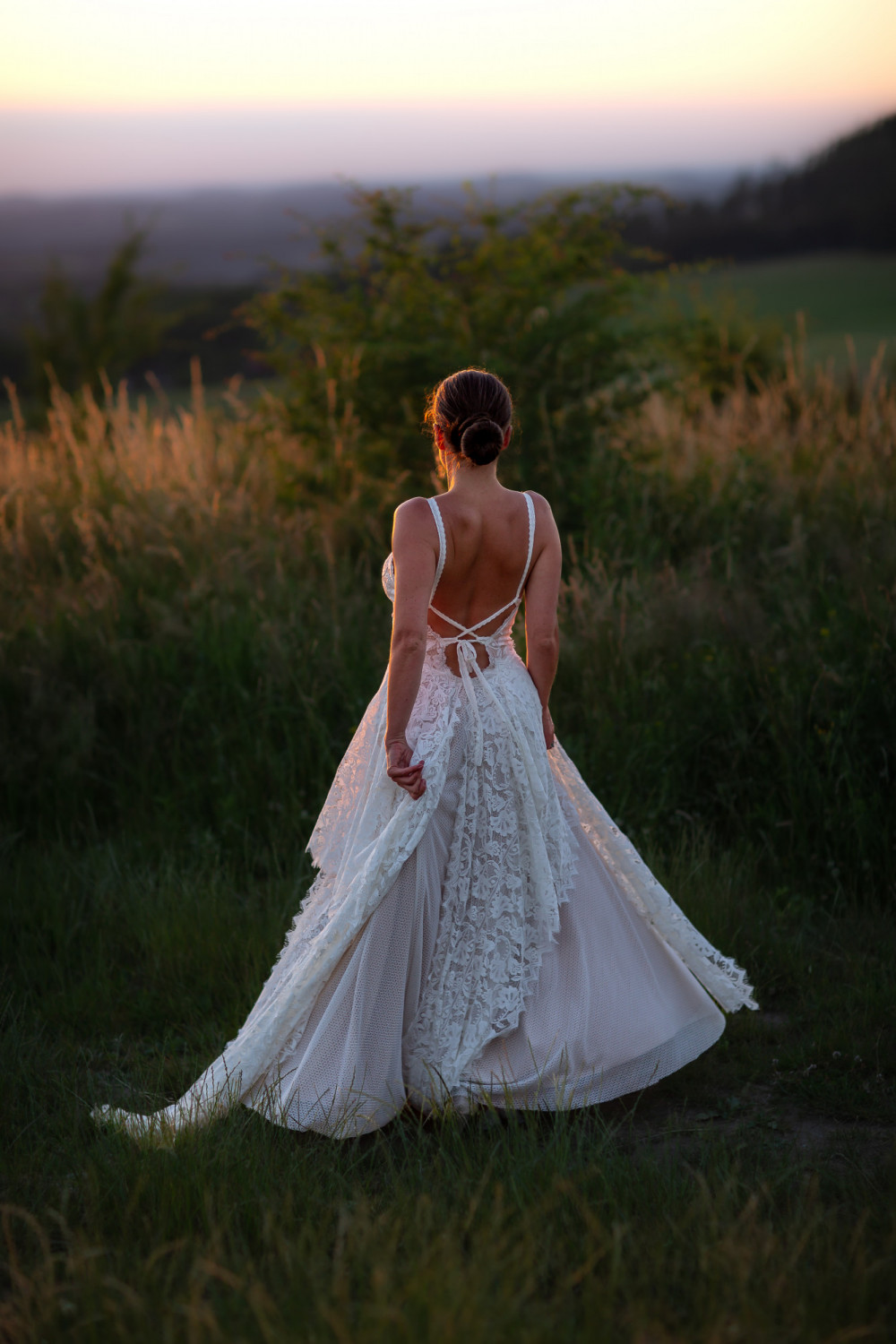 Dół sukni tworzy zwiewna spódnica z delikatnym, kwiatowym wzorem koronki, zakończona unikatowym trenem, który miękko spływa ku ziemi, poruszając się z każdym krokiem niczym powiew ciepłego letniego wiatru. Całość zachwyca subtelnym blaskiem i niezwykłą lekkością ruchu.