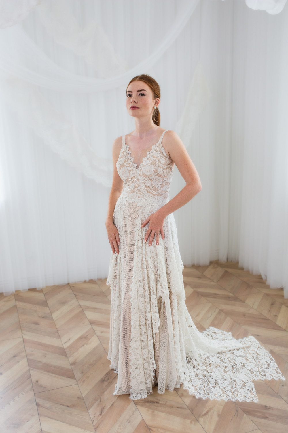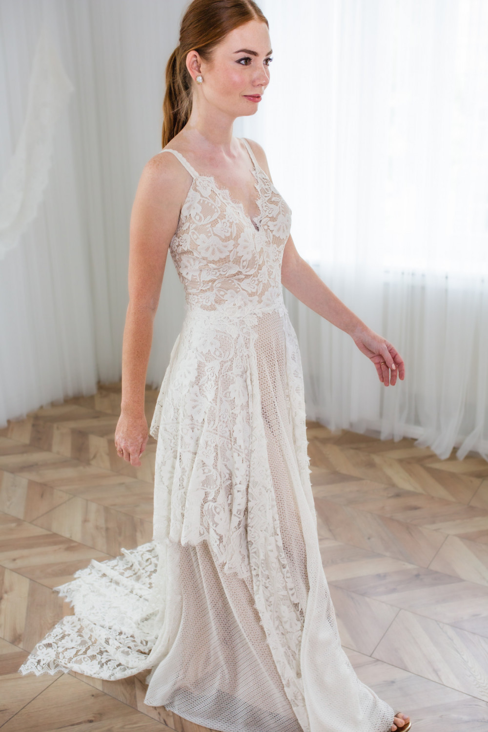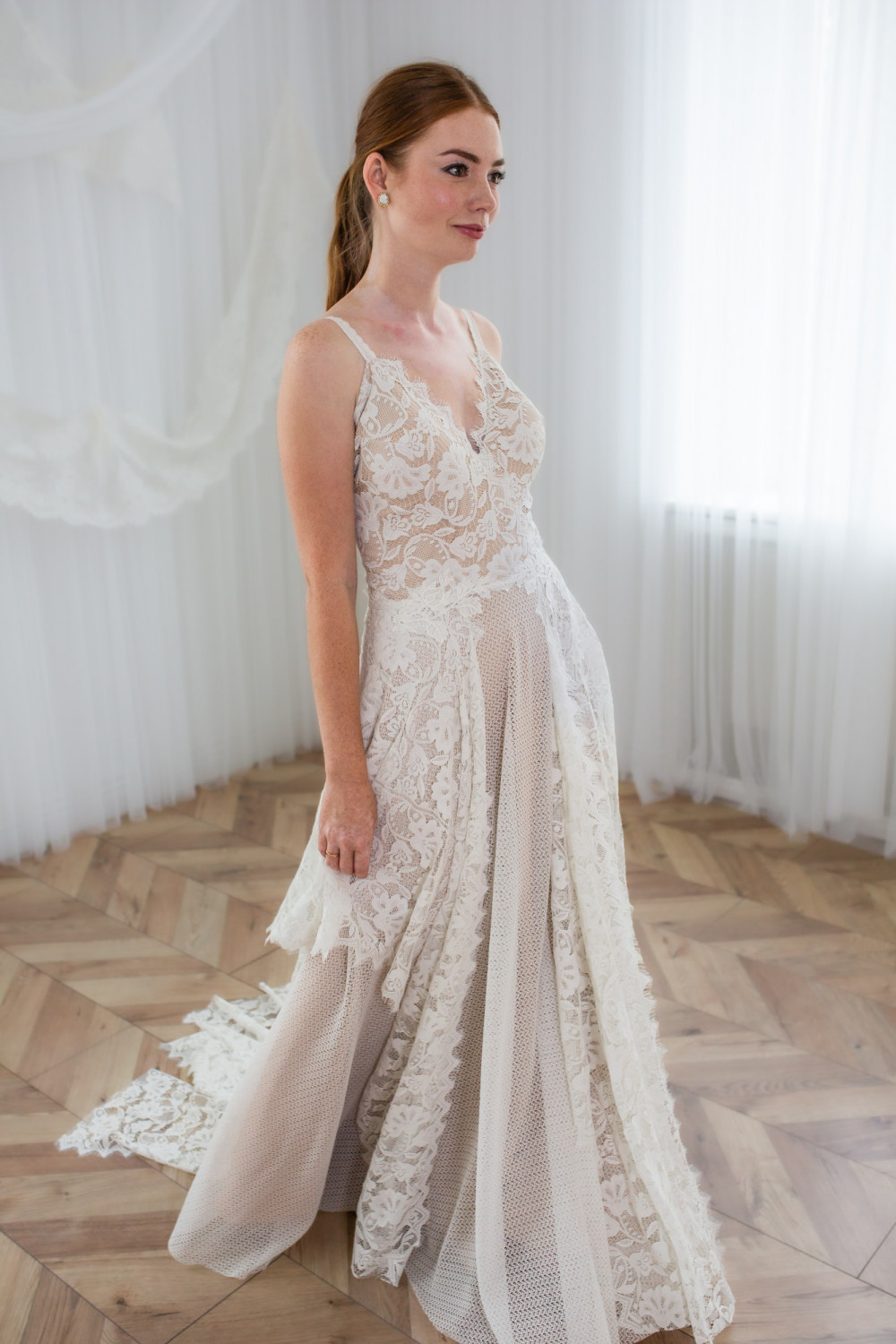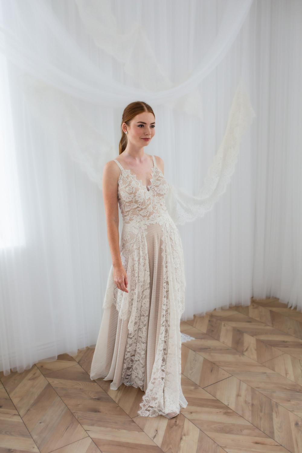 Dół sukni tworzy zwiewna spódnica z delikatnym, kwiatowym wzorem koronki, zakończona unikatowym trenem, który miękko spływa ku ziemi, poruszając się z każdym krokiem niczym powiew ciepłego letniego wiatru. Całość zachwyca subtelnym blaskiem i niezwykłą lekkością ruchu.