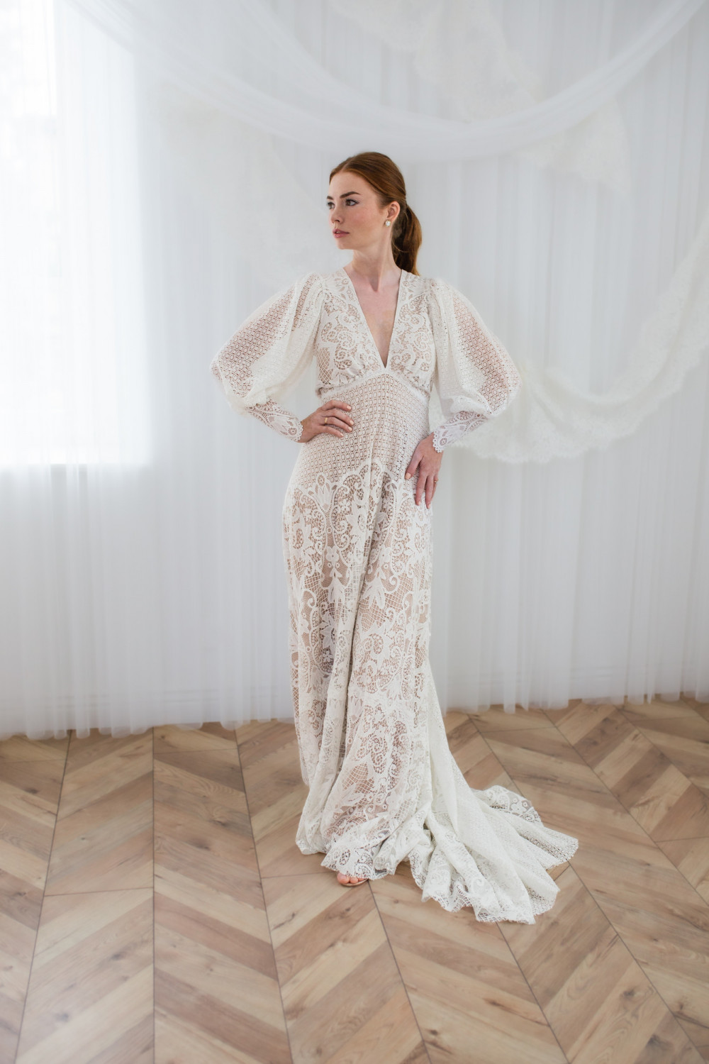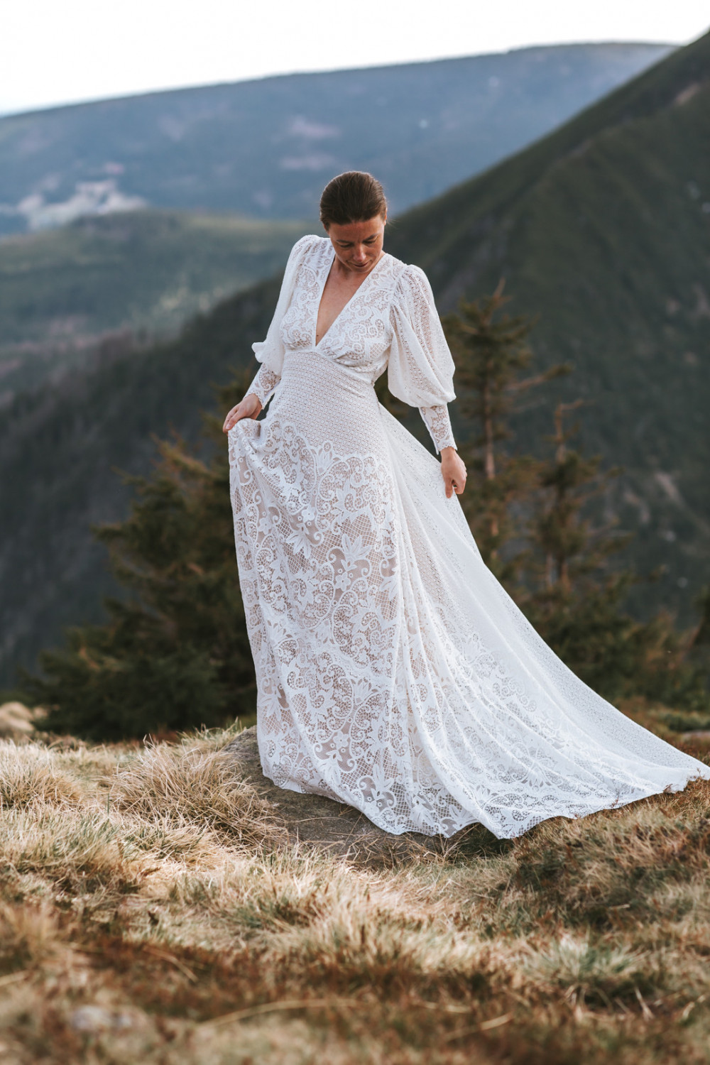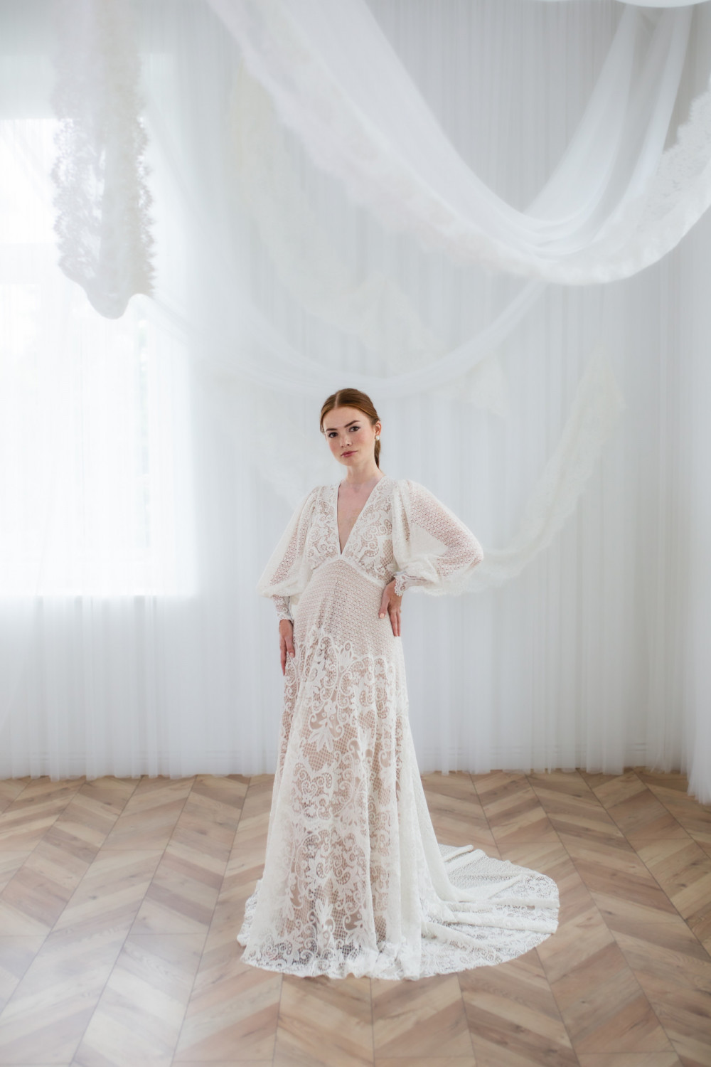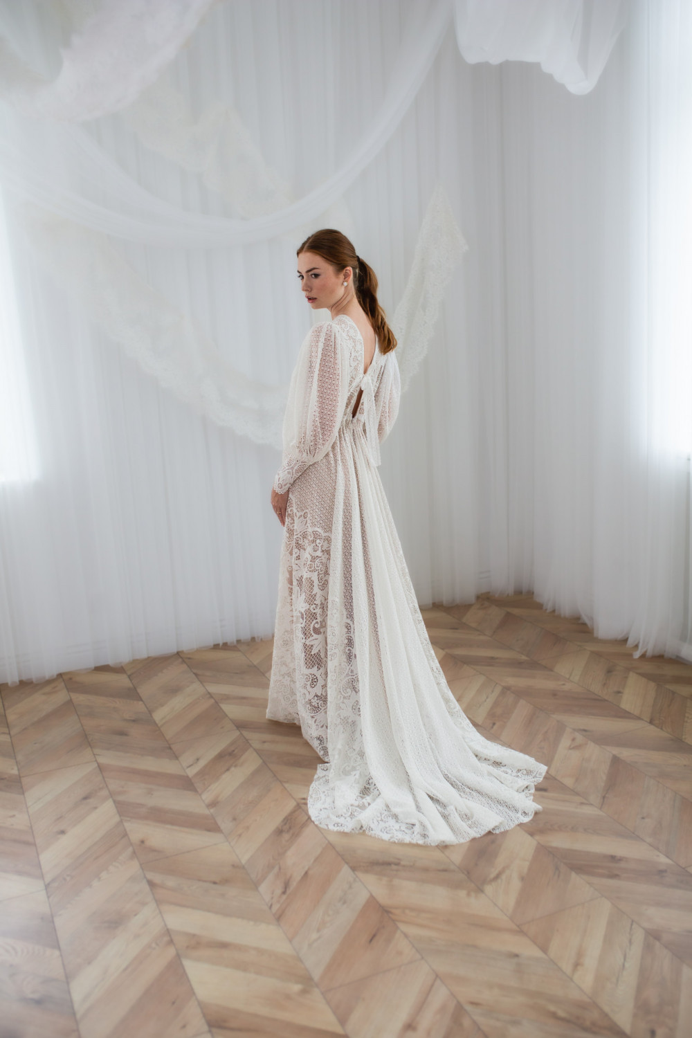 Suknia ślubna wykonana z koronki o wyraźnym wzorze w stylu boho. Fason prosty, swobodnie opływający sylwetkę, z odcięciem pod biustem. Góra z dekoltem w kształcie litery V oraz długimi, lekko bufistymi rękawami zakończonymi mankietem. Talia delikatnie zaznaczona, bez usztywnień. Tył sukni z wycięciem oraz subtelnym wiązaniem z koronki, które pozwala na lekką regulację i podkreśla plecy. Spódnica długa, miękko układająca się, przechodząca w przepiękny tren. Całość lekka, naturalna w formie, z naciskiem na fakturę koronki i komfort noszenia. Model idealny również dla panien młodych plus size.