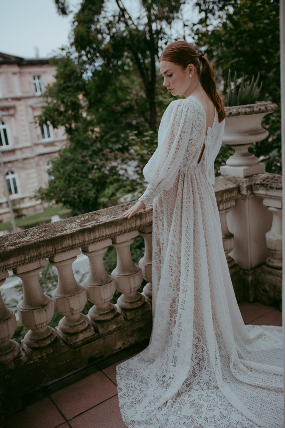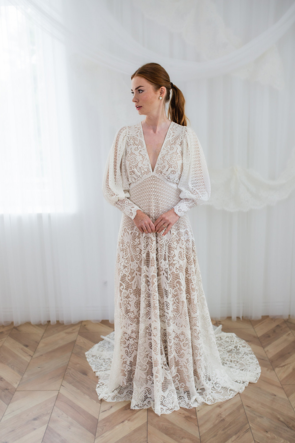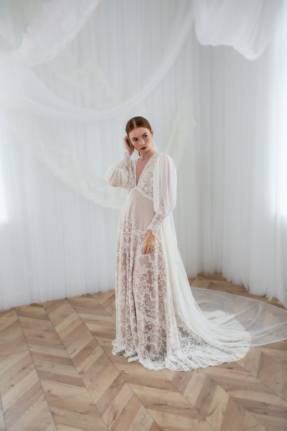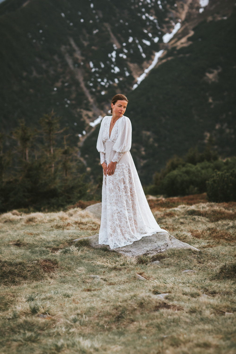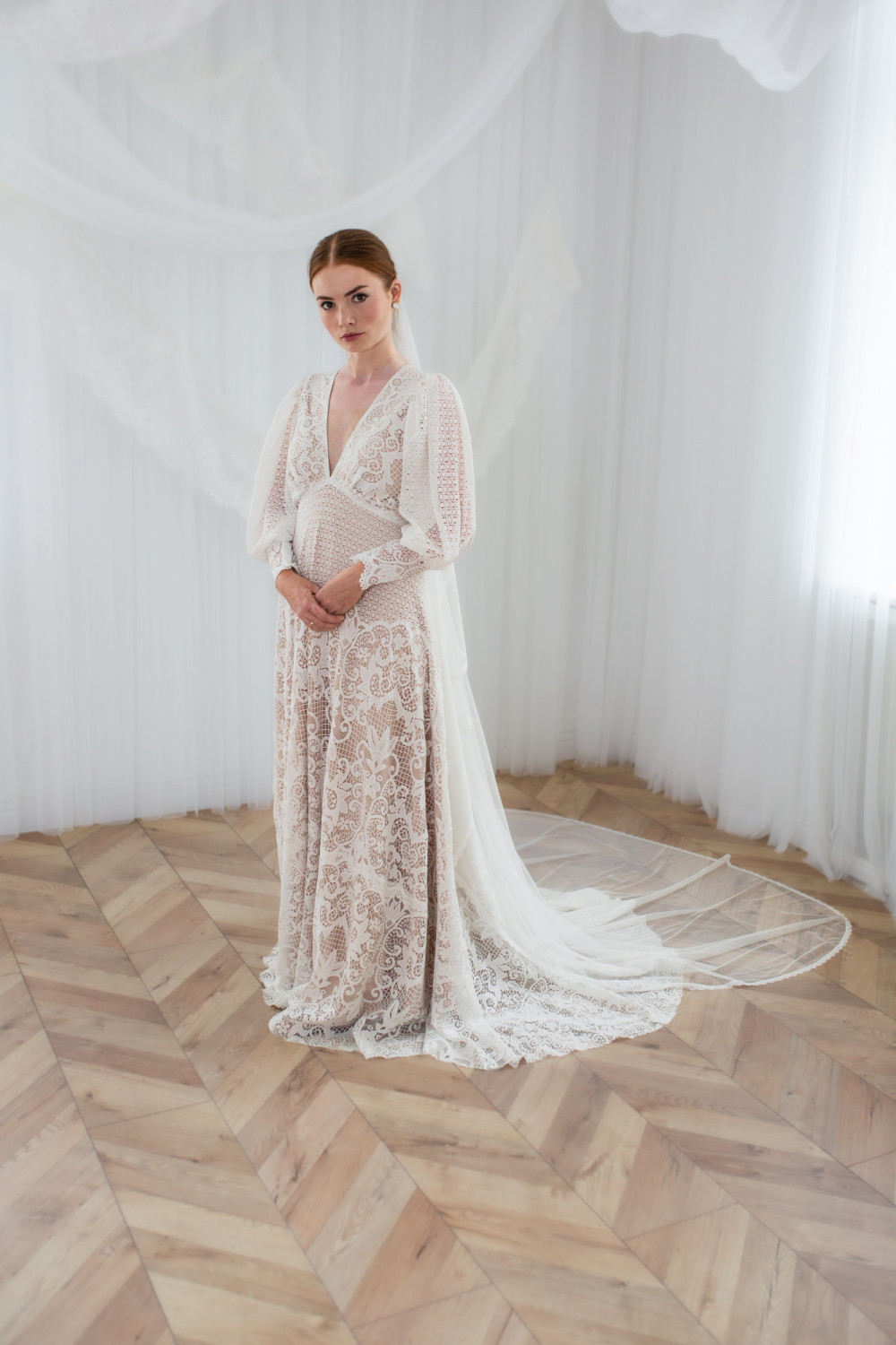 Suknia ślubna wykonana z koronki o wyraźnym wzorze w stylu boho. Fason prosty, swobodnie opływający sylwetkę, z odcięciem pod biustem. Góra z dekoltem w kształcie litery V oraz długimi, lekko bufistymi rękawami zakończonymi mankietem. Talia delikatnie zaznaczona, bez usztywnień. Tył sukni z wycięciem oraz subtelnym wiązaniem z koronki, które pozwala na lekką regulację i podkreśla plecy. Spódnica długa, miękko układająca się, przechodząca w przepiękny tren. Całość lekka, naturalna w formie, z naciskiem na fakturę koronki i komfort noszenia. Model idealny również dla panien młodych plus size.
