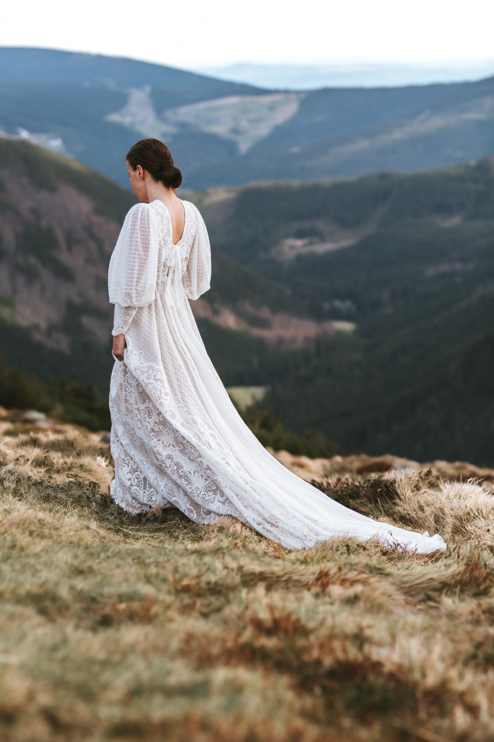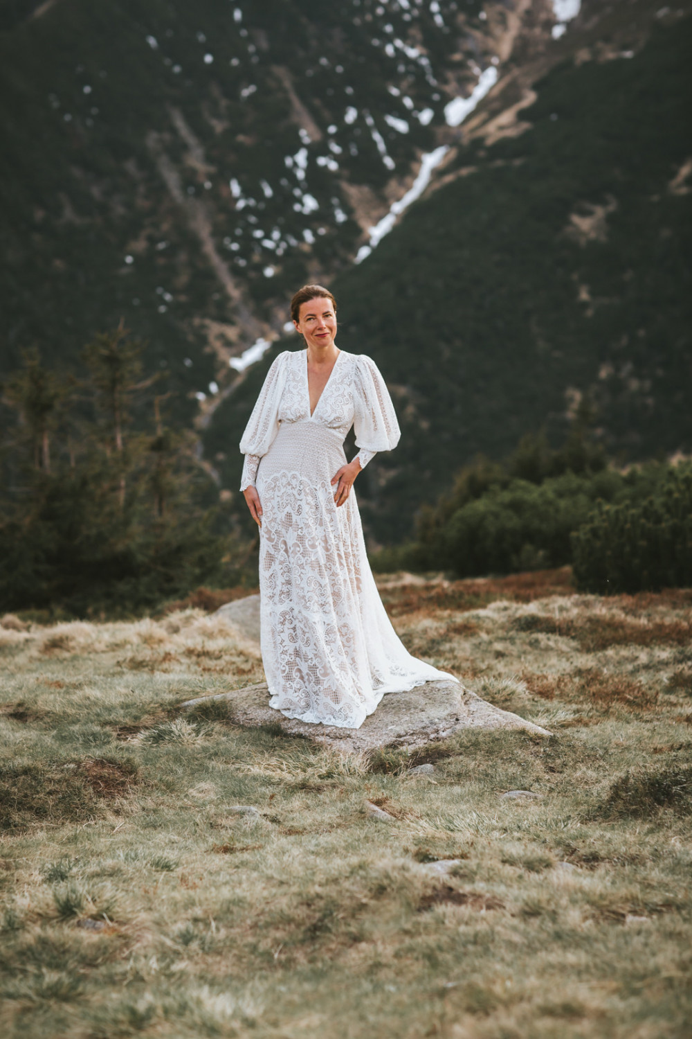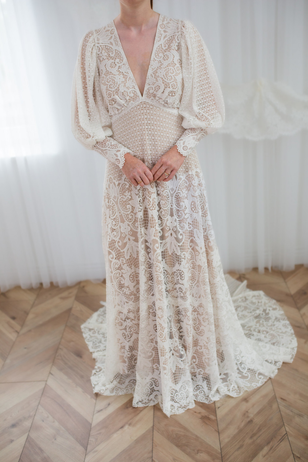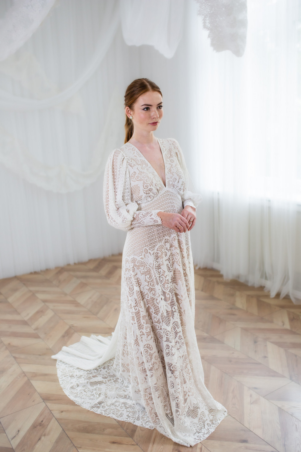 Suknia ślubna wykonana z koronki o wyraźnym wzorze w stylu boho. Fason prosty, swobodnie opływający sylwetkę, z odcięciem pod biustem. Góra z dekoltem w kształcie litery V oraz długimi, lekko bufistymi rękawami zakończonymi mankietem. Talia delikatnie zaznaczona, bez usztywnień. Tył sukni z wycięciem oraz subtelnym wiązaniem z koronki, które pozwala na lekką regulację i podkreśla plecy. Spódnica długa, miękko układająca się, przechodząca w przepiękny tren. Całość lekka, naturalna w formie, z naciskiem na fakturę koronki i komfort noszenia. Model idealny również dla panien młodych plus size.