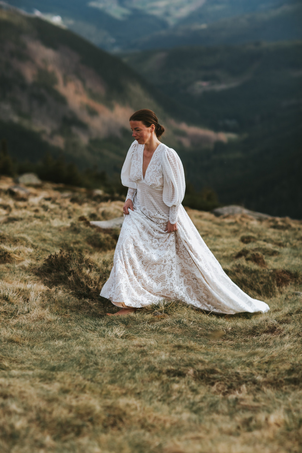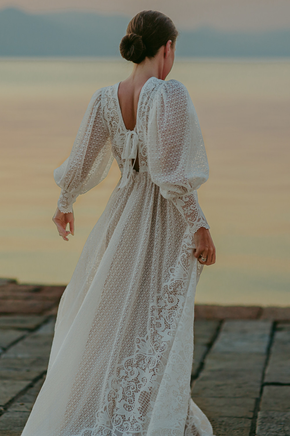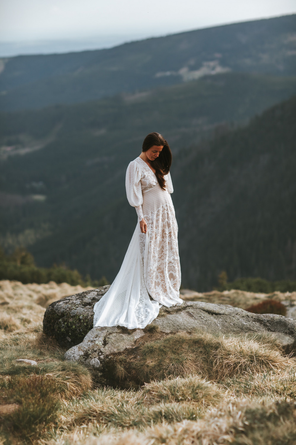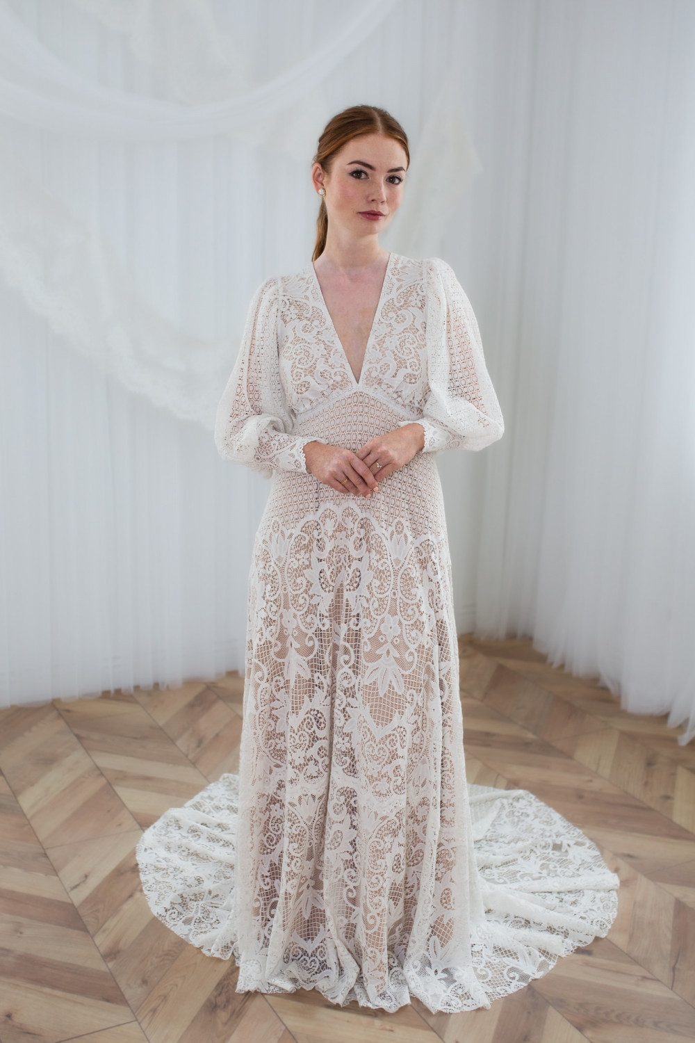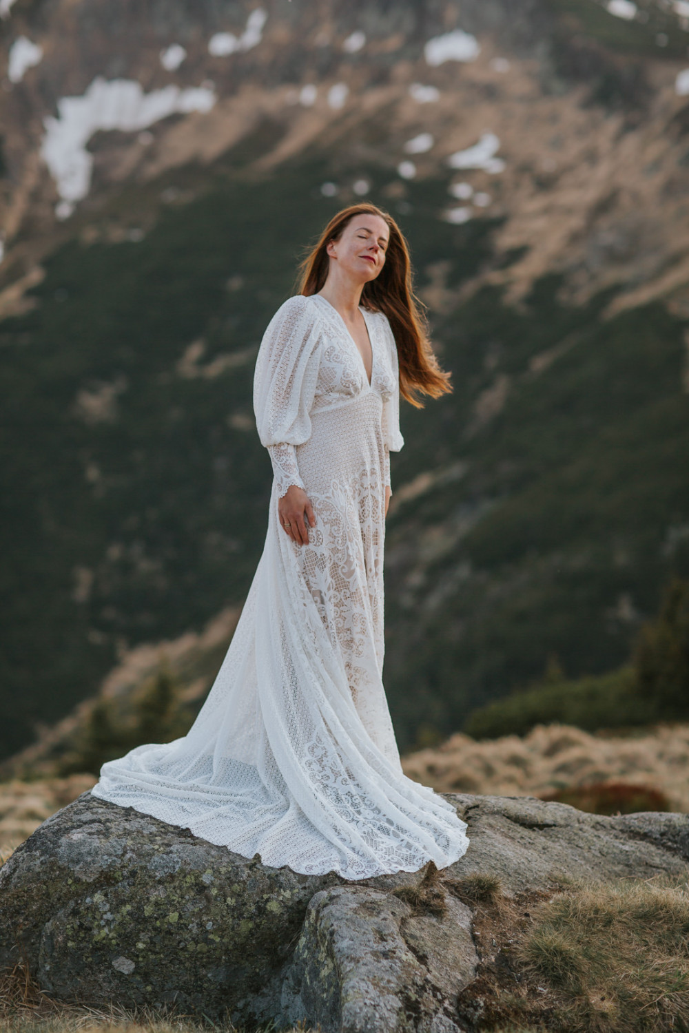 Suknia ślubna wykonana z koronki o wyraźnym wzorze w stylu boho. Fason prosty, swobodnie opływający sylwetkę, z odcięciem pod biustem. Góra z dekoltem w kształcie litery V oraz długimi, lekko bufistymi rękawami zakończonymi mankietem. Talia delikatnie zaznaczona, bez usztywnień. Tył sukni z wycięciem oraz subtelnym wiązaniem z koronki, które pozwala na lekką regulację i podkreśla plecy. Spódnica długa, miękko układająca się, przechodząca w przepiękny tren. Całość lekka, naturalna w formie, z naciskiem na fakturę koronki i komfort noszenia. Model idealny również dla panien młodych plus size.