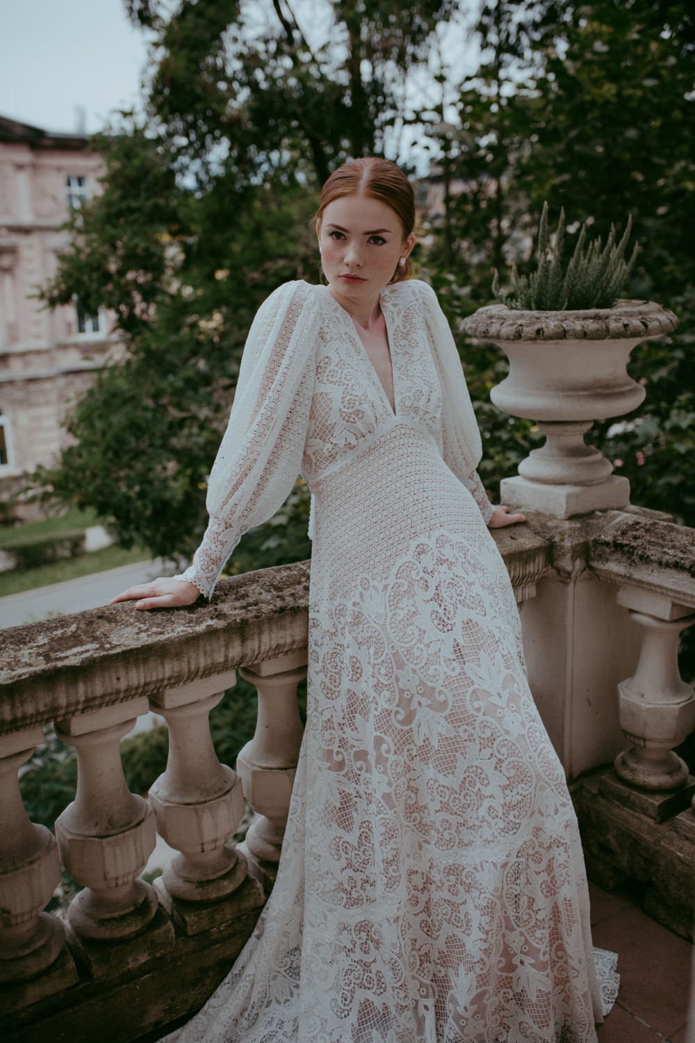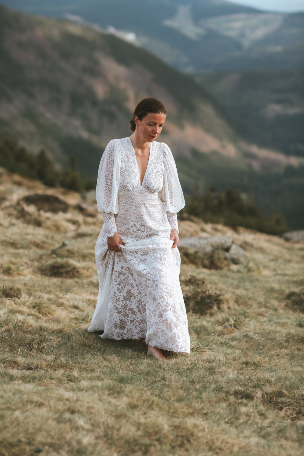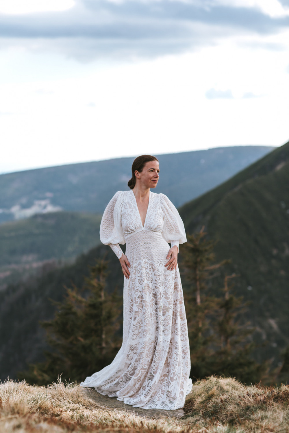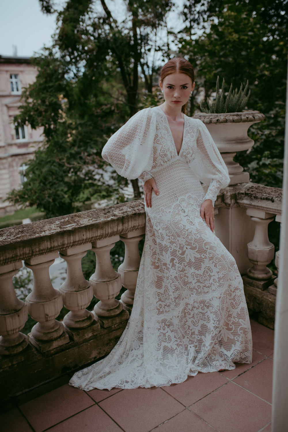 Suknia ślubna wykonana z koronki o wyraźnym wzorze w stylu boho. Fason prosty, swobodnie opływający sylwetkę, z odcięciem pod biustem. Góra z dekoltem w kształcie litery V oraz długimi, lekko bufistymi rękawami zakończonymi mankietem. Talia delikatnie zaznaczona, bez usztywnień. Tył sukni z wycięciem oraz subtelnym wiązaniem z koronki, które pozwala na lekką regulację i podkreśla plecy. Spódnica długa, miękko układająca się, przechodząca w przepiękny tren. Całość lekka, naturalna w formie, z naciskiem na fakturę koronki i komfort noszenia. Model idealny również dla panien młodych plus size.