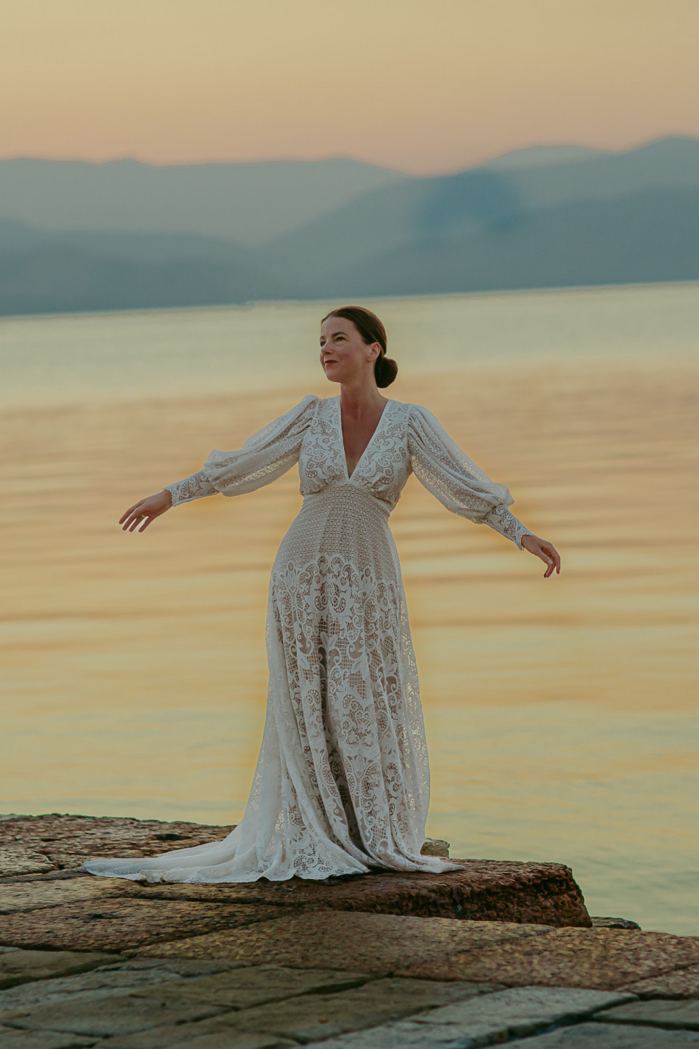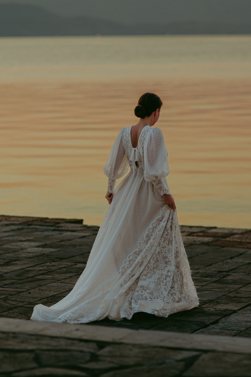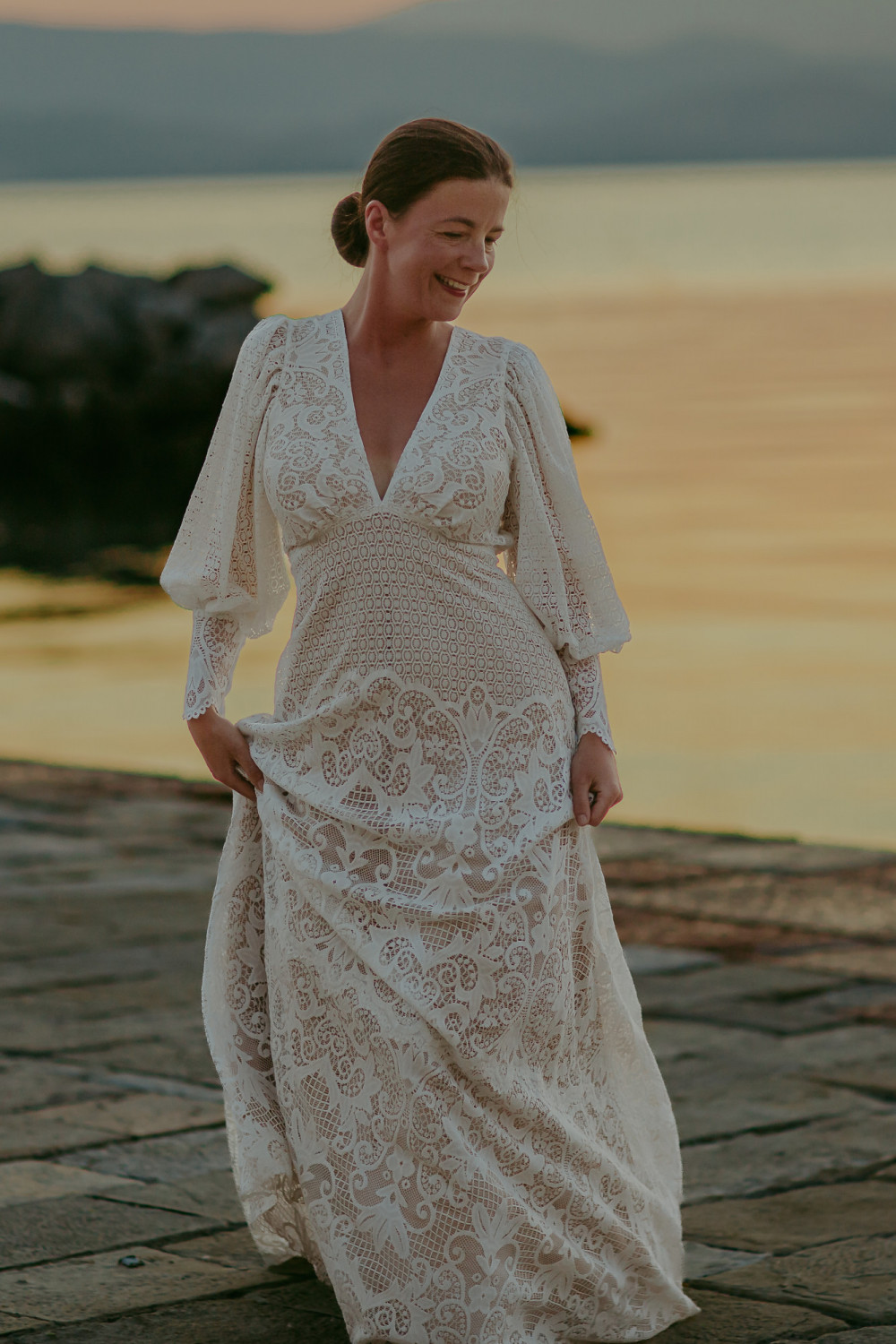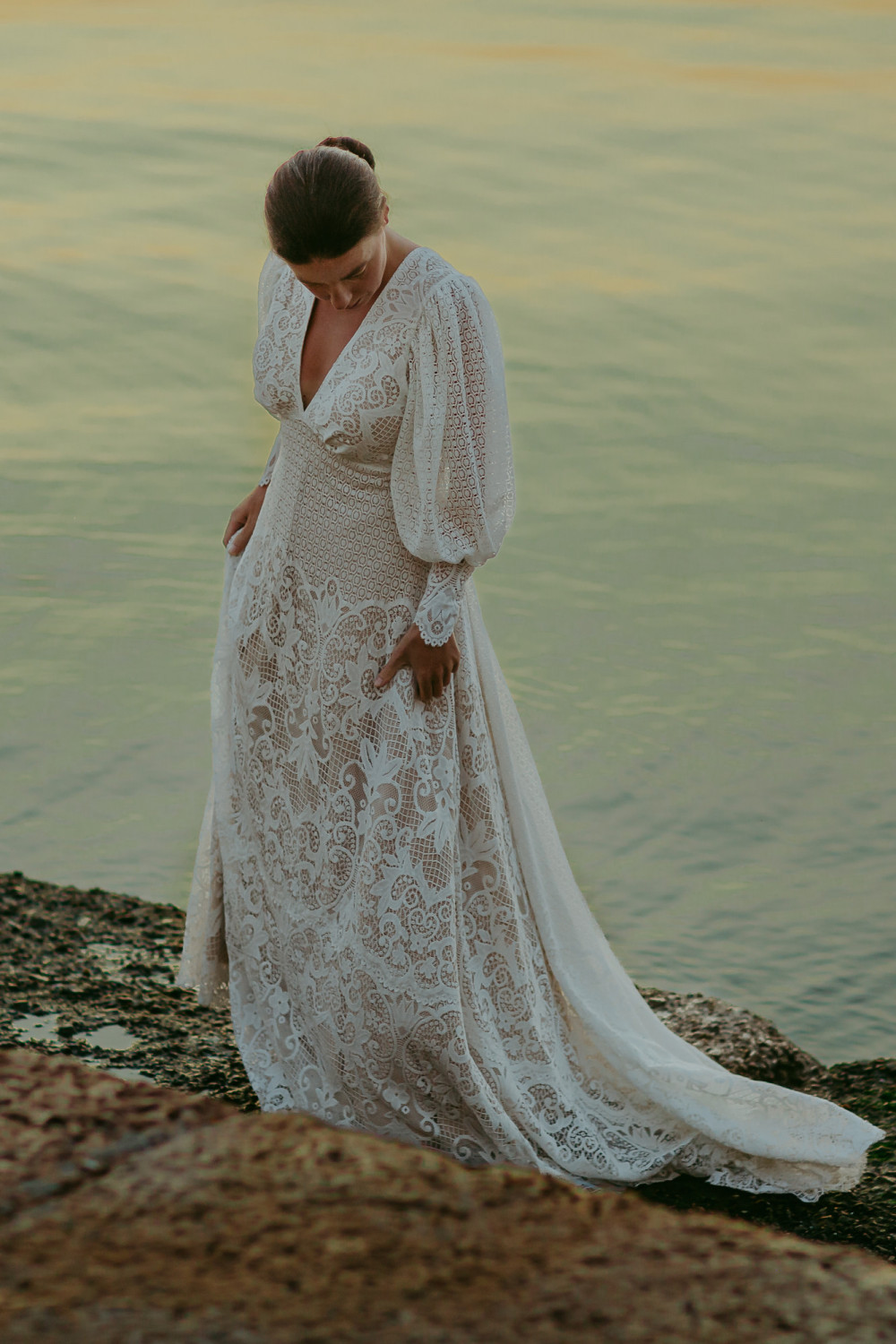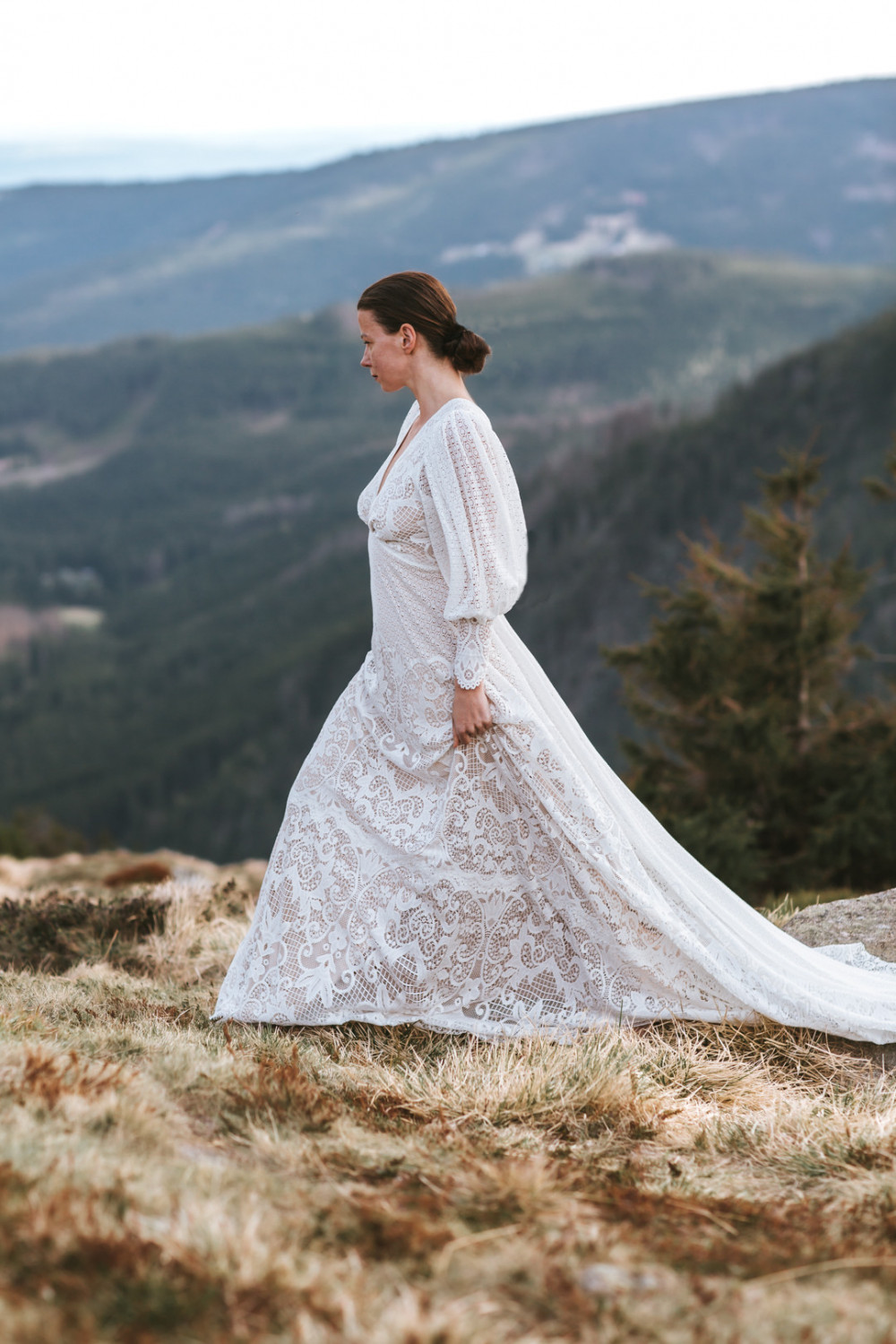 Suknia ślubna wykonana z koronki o wyraźnym wzorze w stylu boho. Fason prosty, swobodnie opływający sylwetkę, z odcięciem pod biustem. Góra z dekoltem w kształcie litery V oraz długimi, lekko bufistymi rękawami zakończonymi mankietem. Talia delikatnie zaznaczona, bez usztywnień. Tył sukni z wycięciem oraz subtelnym wiązaniem z koronki, które pozwala na lekką regulację i podkreśla plecy. Spódnica długa, miękko układająca się, przechodząca w przepiękny tren. Całość lekka, naturalna w formie, z naciskiem na fakturę koronki i komfort noszenia. Model idealny również dla panien młodych plus size.