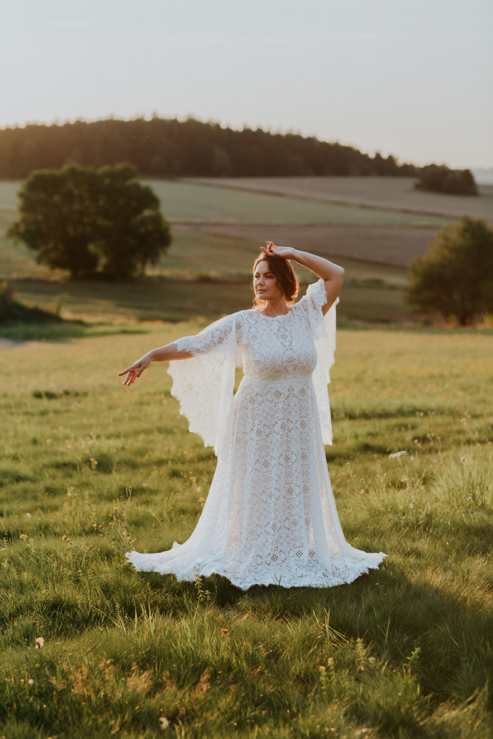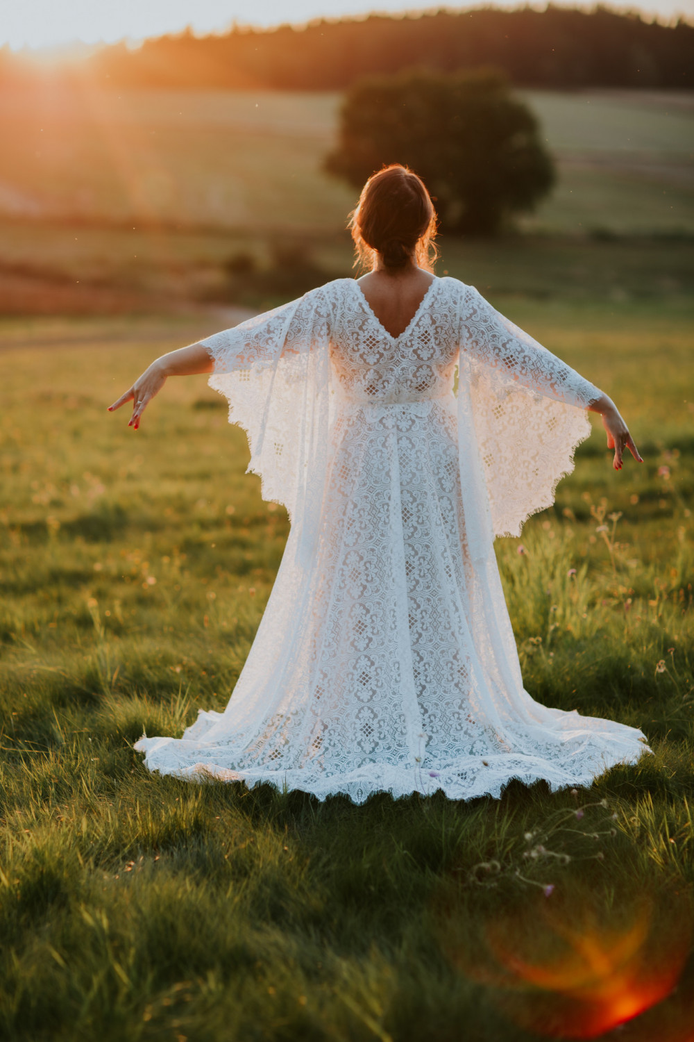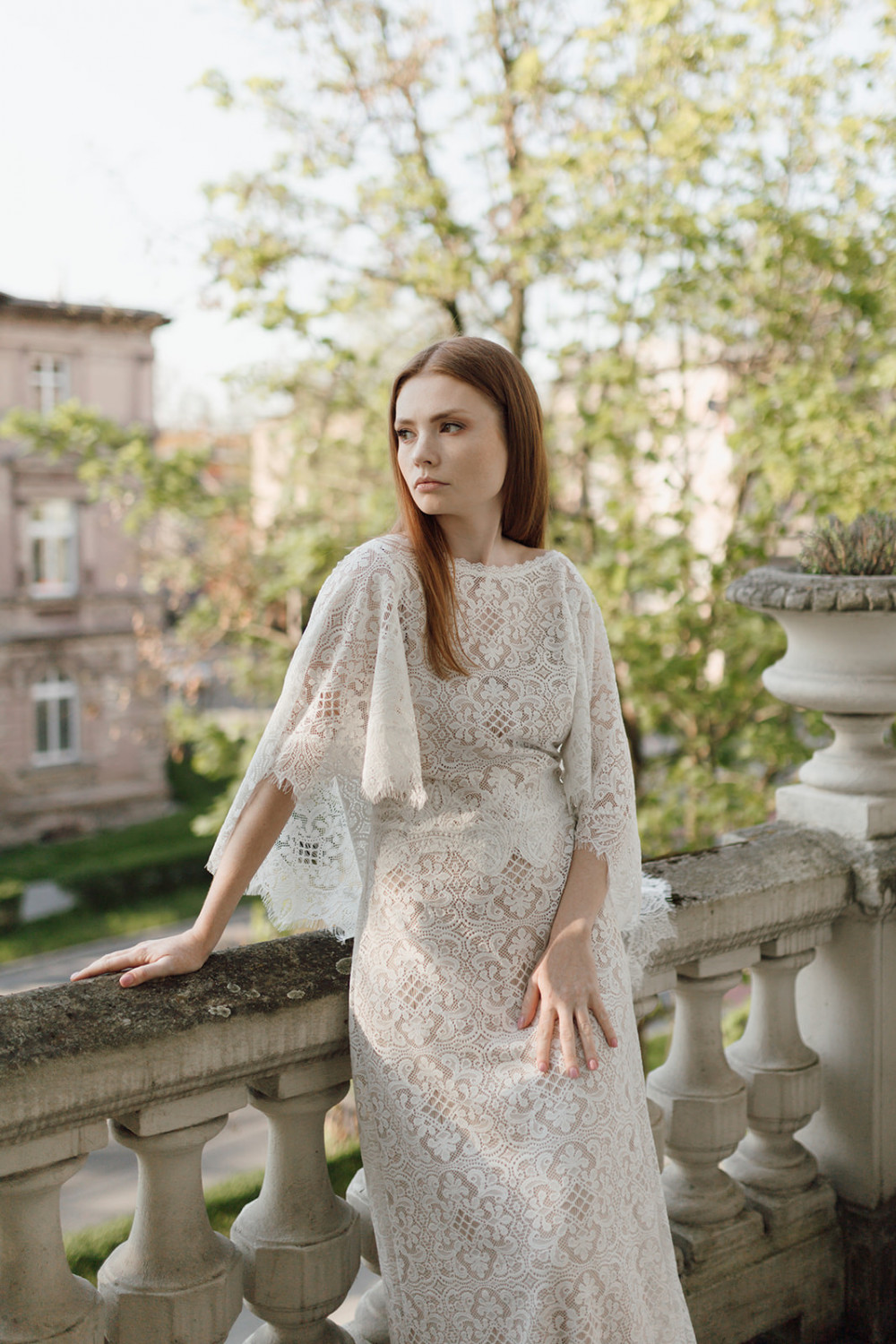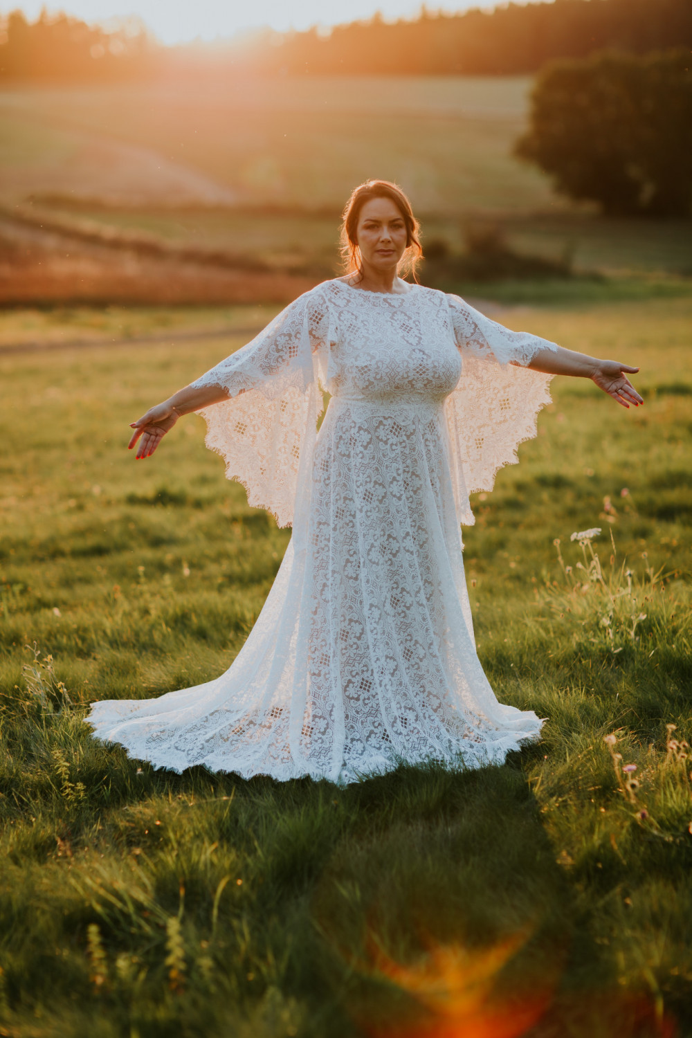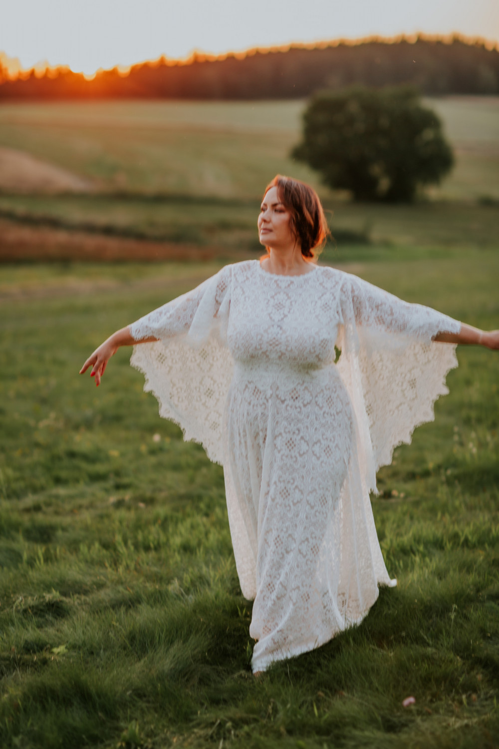 Uszyta w całości z efektownej, mięsistej koronki o geometryczno-kwiatowym wzorze, pięknie układa się na sylwetce, podkreślając jej naturalny kształt. Luźno opadające rękawy o kroju przypominającym pelerynę są kluczowym elementem tej sukni – nadają jej charakteru, a w ruchu poruszają się z niezwykłą lekkością i wdziękiem. Dekolt w kształcie litery V na plecach subtelnie odsłania skórę, dodając całości elegancji i zmysłowości.