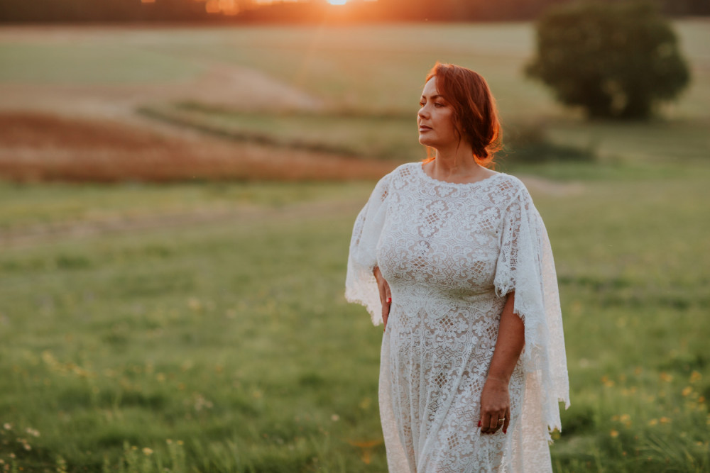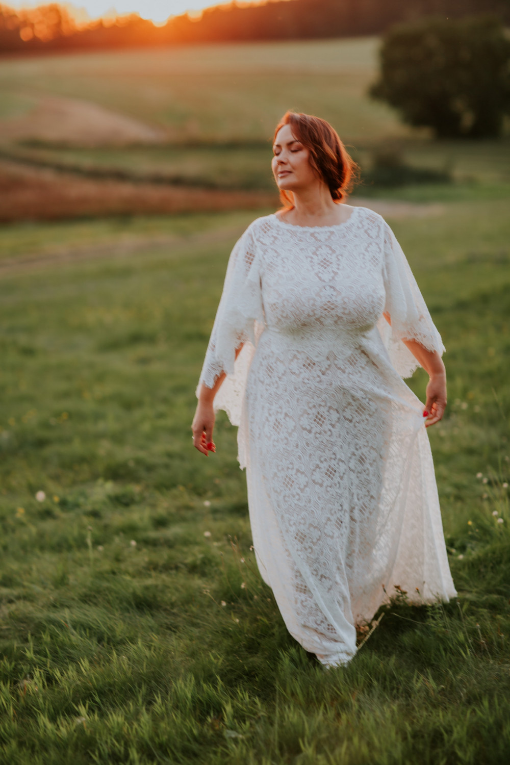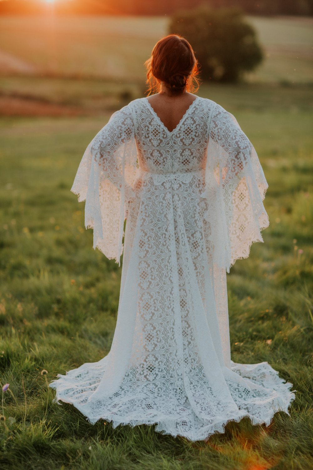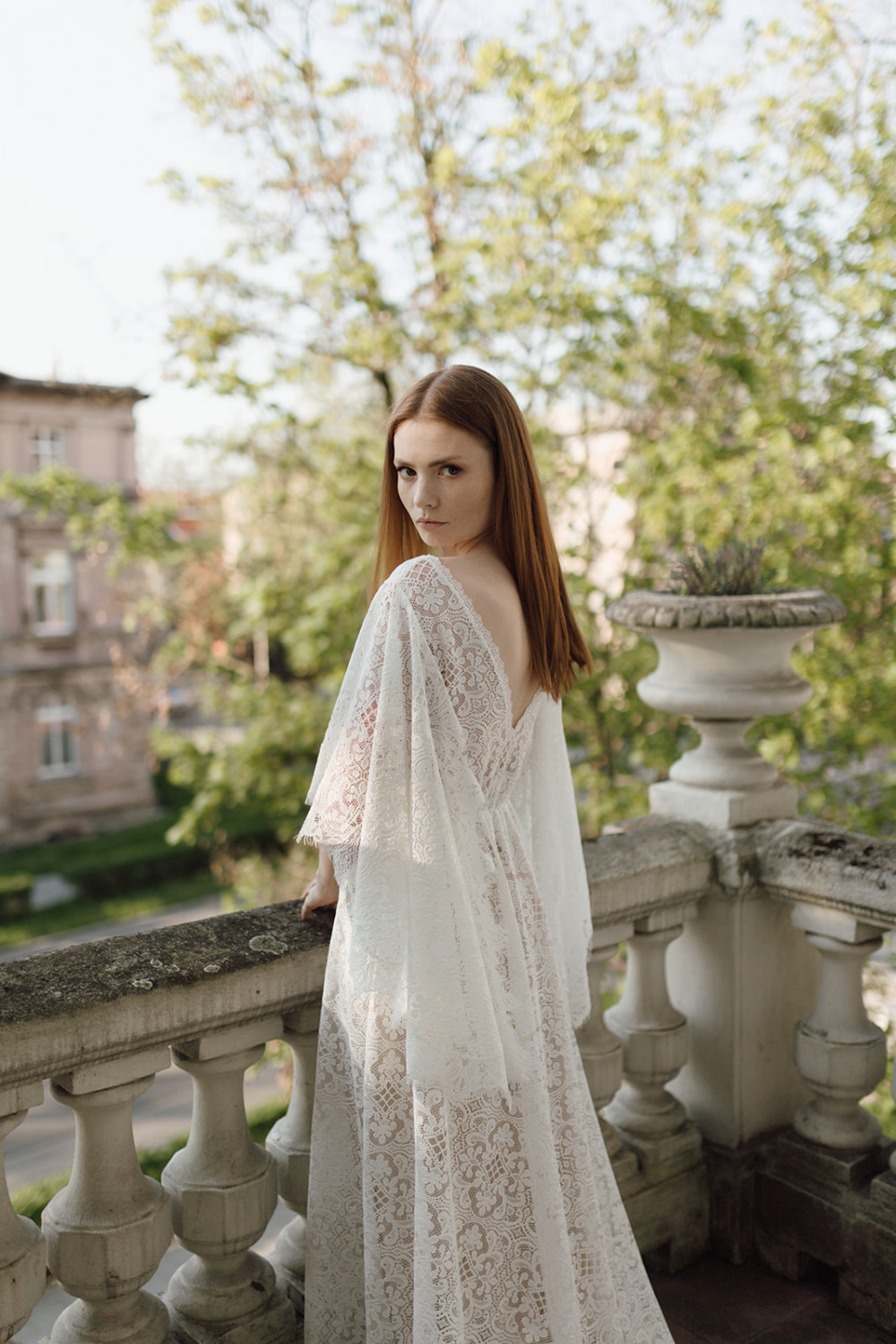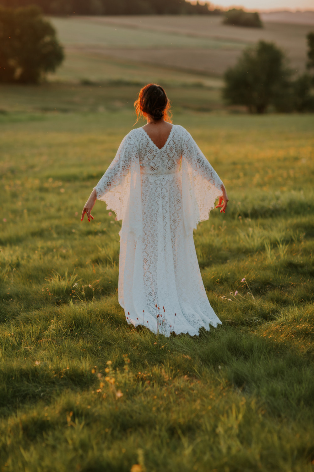 Uszyta w całości z efektownej, mięsistej koronki o geometryczno-kwiatowym wzorze, pięknie układa się na sylwetce, podkreślając jej naturalny kształt. Luźno opadające rękawy o kroju przypominającym pelerynę są kluczowym elementem tej sukni – nadają jej charakteru, a w ruchu poruszają się z niezwykłą lekkością i wdziękiem. Dekolt w kształcie litery V na plecach subtelnie odsłania skórę, dodając całości elegancji i zmysłowości.