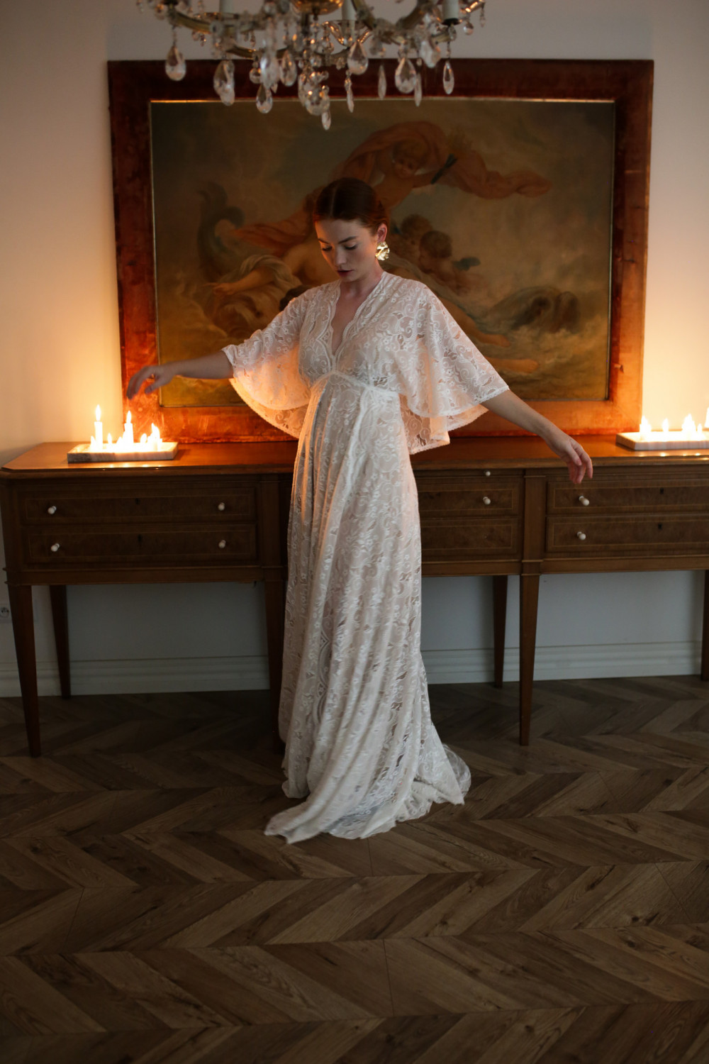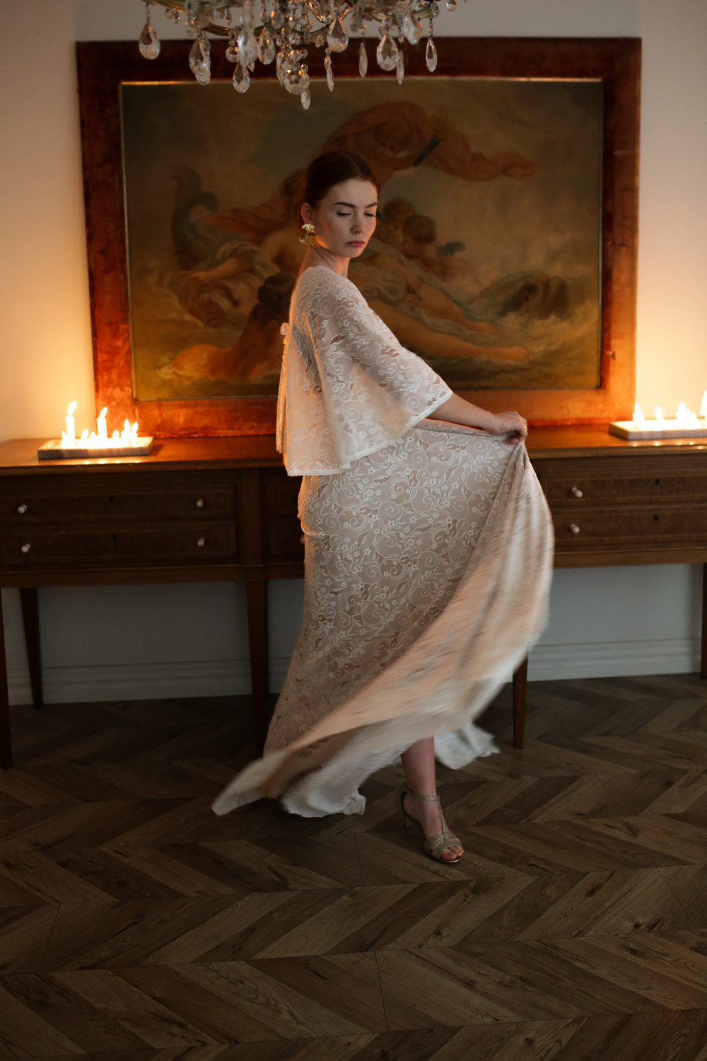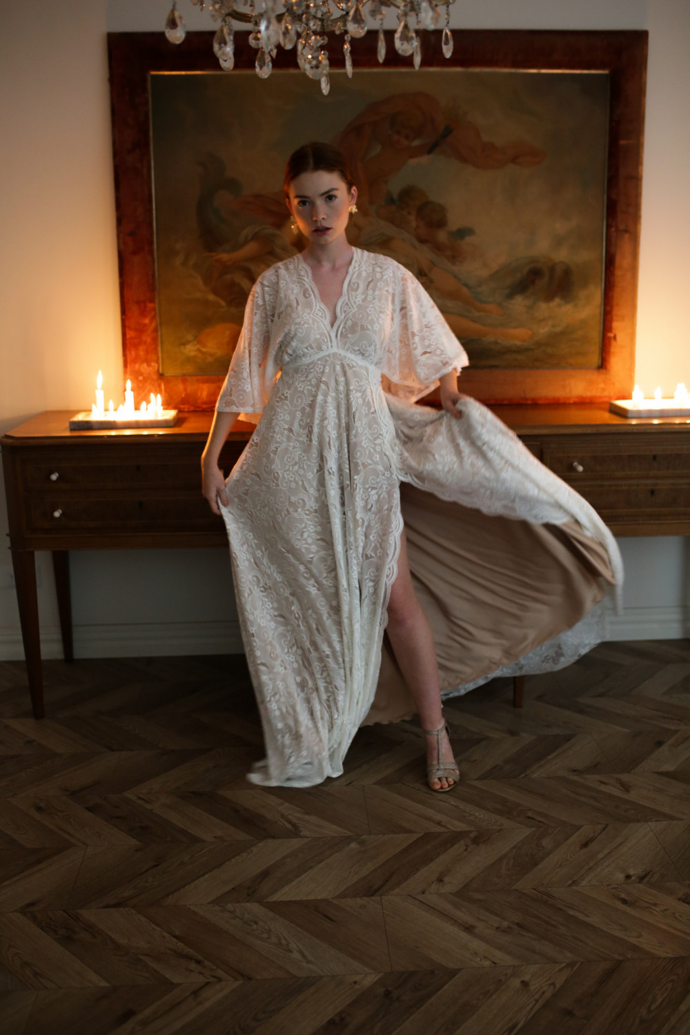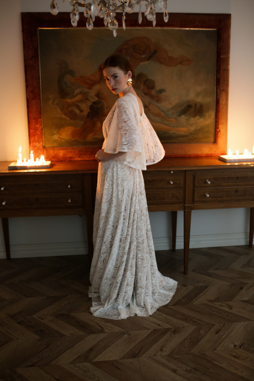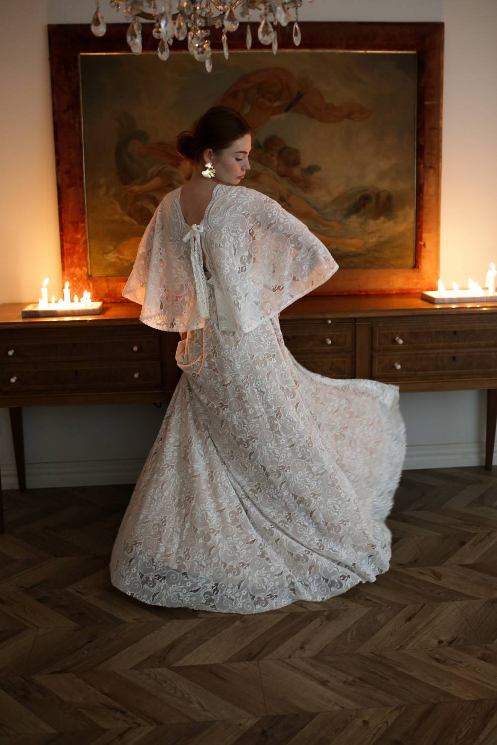 Górna część sukni to korpus w formie pelerynki z krótkimi, zwiewnymi rękawkami, które delikatnie poruszają się przy każdym kroku. Plecy są lekko odkryte, z ozdobnym koronkowym wiązaniem, które nadaje subtelny, romantyczny charakter.