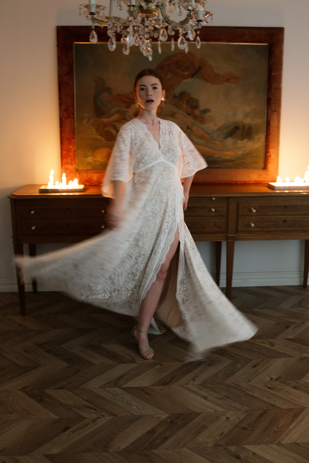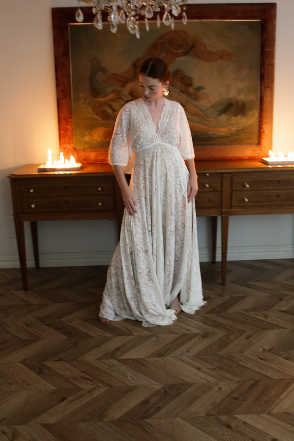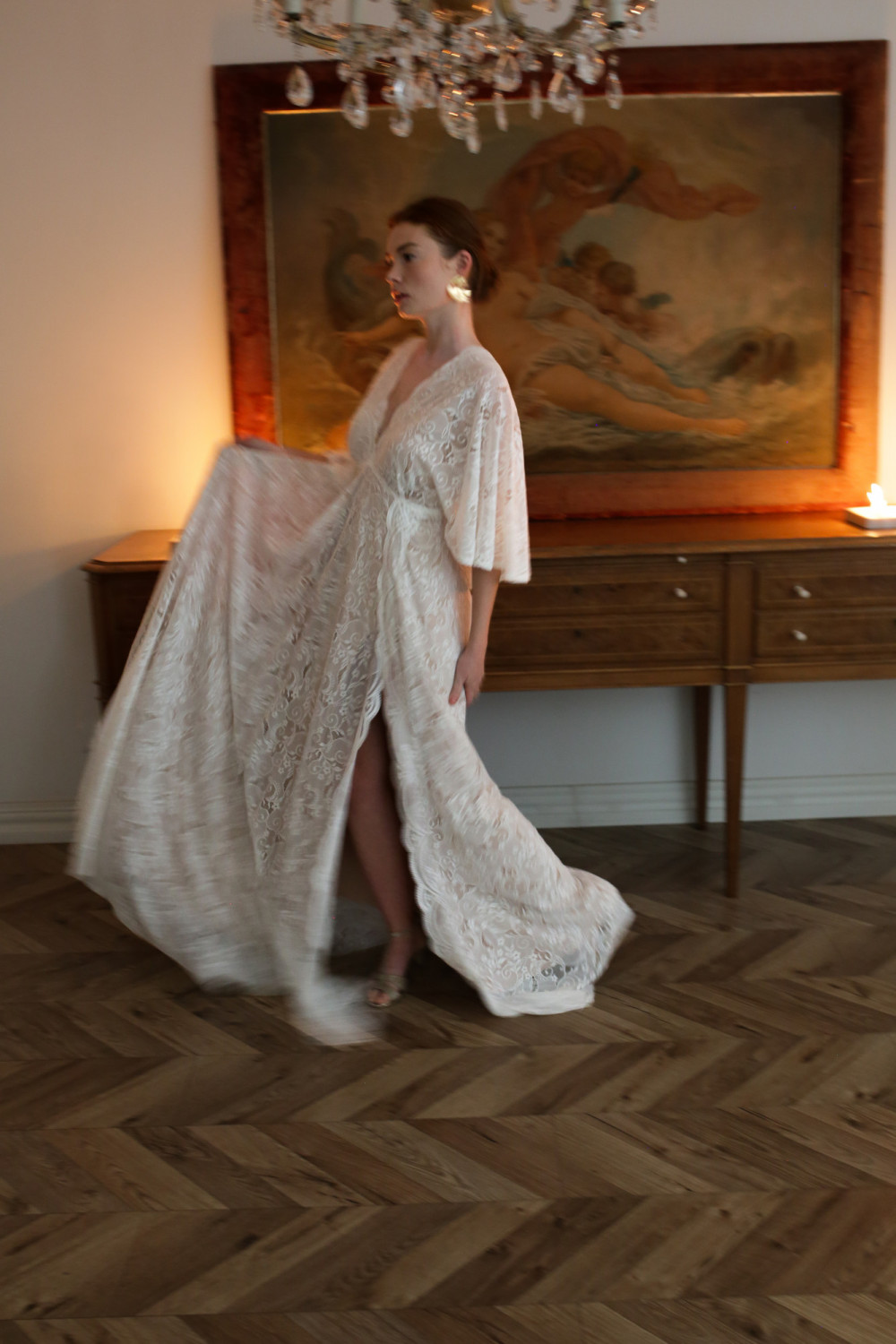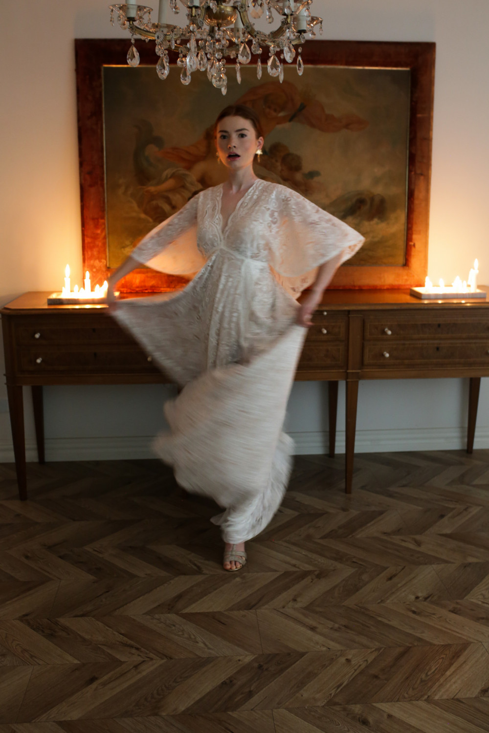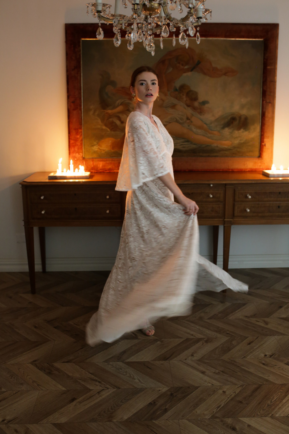 Górna część sukni to korpus w formie pelerynki z krótkimi, zwiewnymi rękawkami, które delikatnie poruszają się przy każdym kroku. Plecy są lekko odkryte, z ozdobnym koronkowym wiązaniem, które nadaje subtelny, romantyczny charakter.
