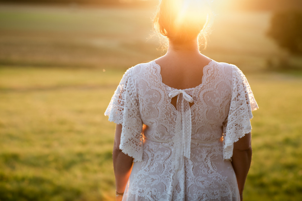 Dekolt w kształcie litery V pięknie eksponuje szyję i obojczyki, a krótkie, szerokie rękawy dodają sylwetce lekkości i swobody. Plecy są delikatnie odkryte i ozdobione subtelnym wiązaniem z koronki, które nadaje sukni wyjątkowego charakteru.