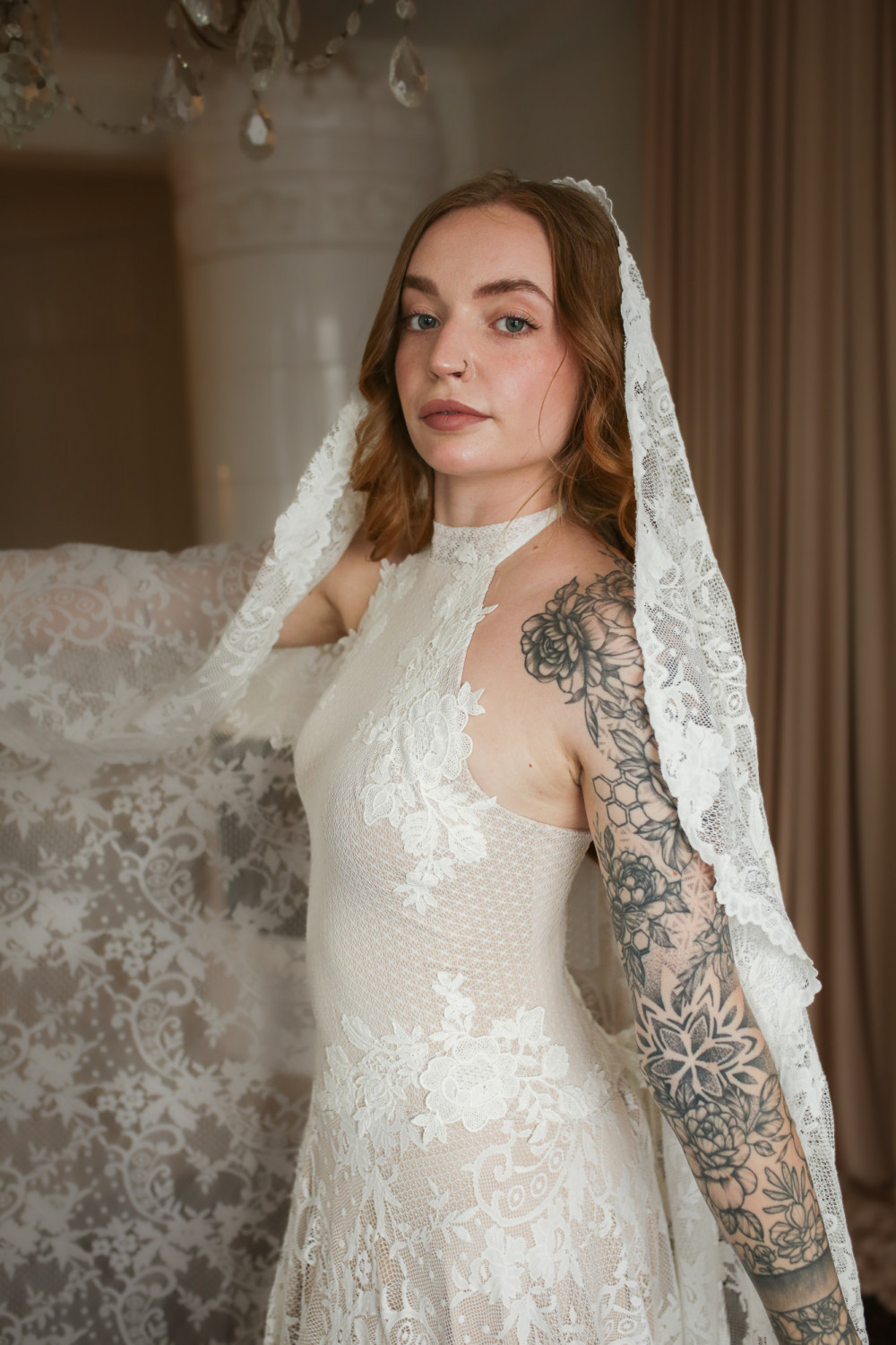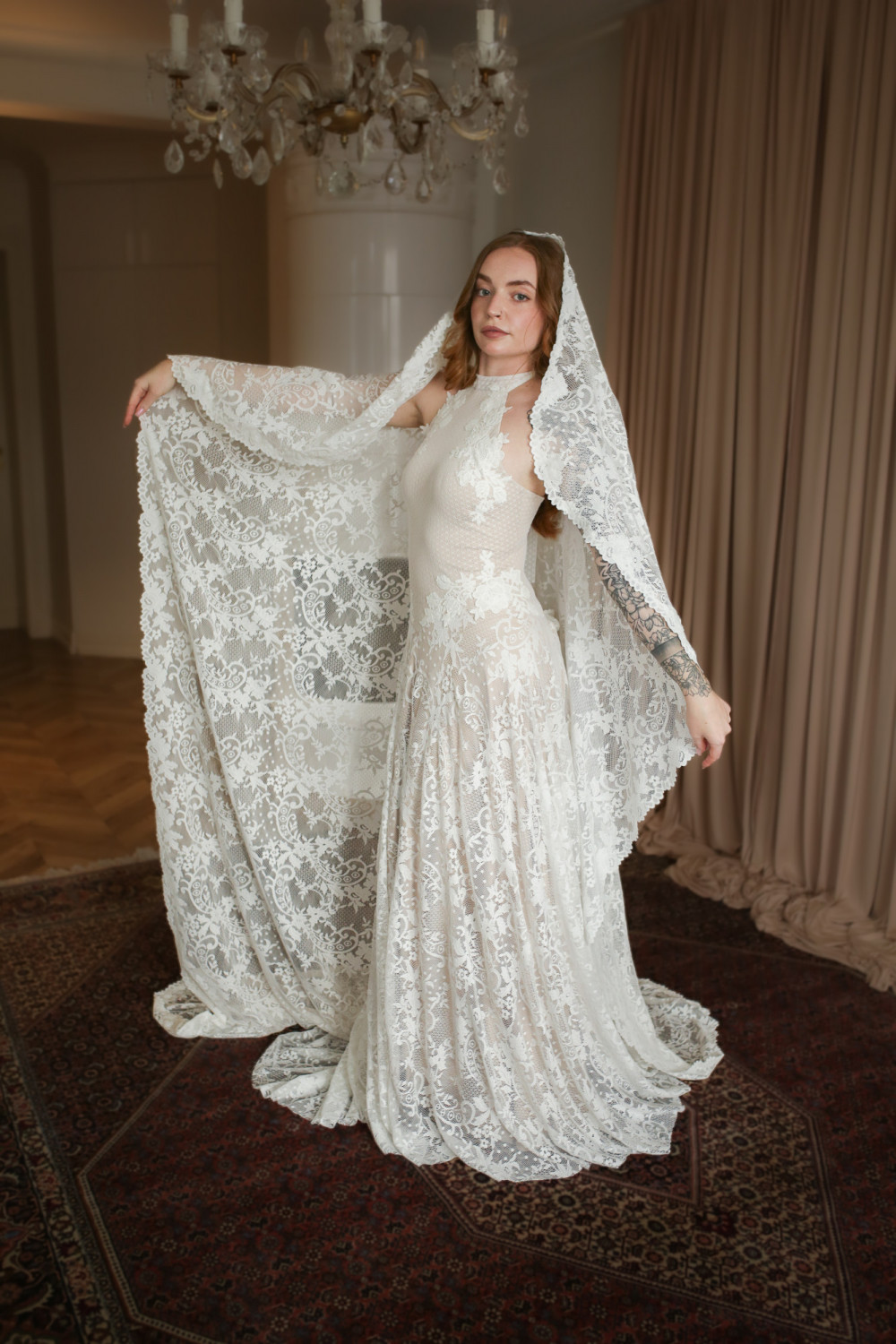 Ten wyjątkowy welon został uszyty w całości z miękkiej, delikatnej koronki o subtelnym kwiatowym wzorze, który nadaje całości niezwykle romantycznego charakteru. Brzegi welonu zostały ozdobione dekoracyjnym wykończeniem w kształcie kwiatów, co podkreśla jego lekkość i elegancję.