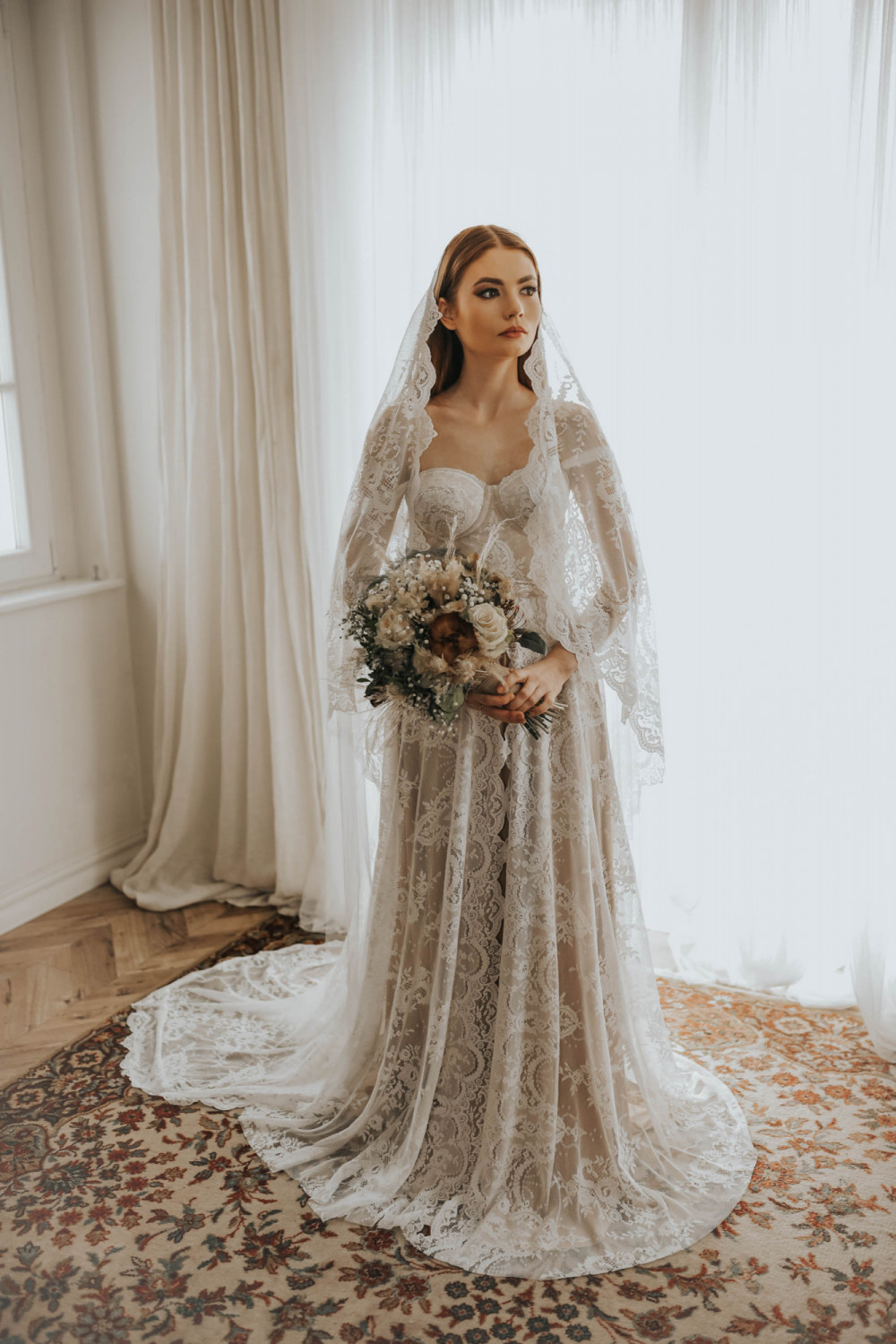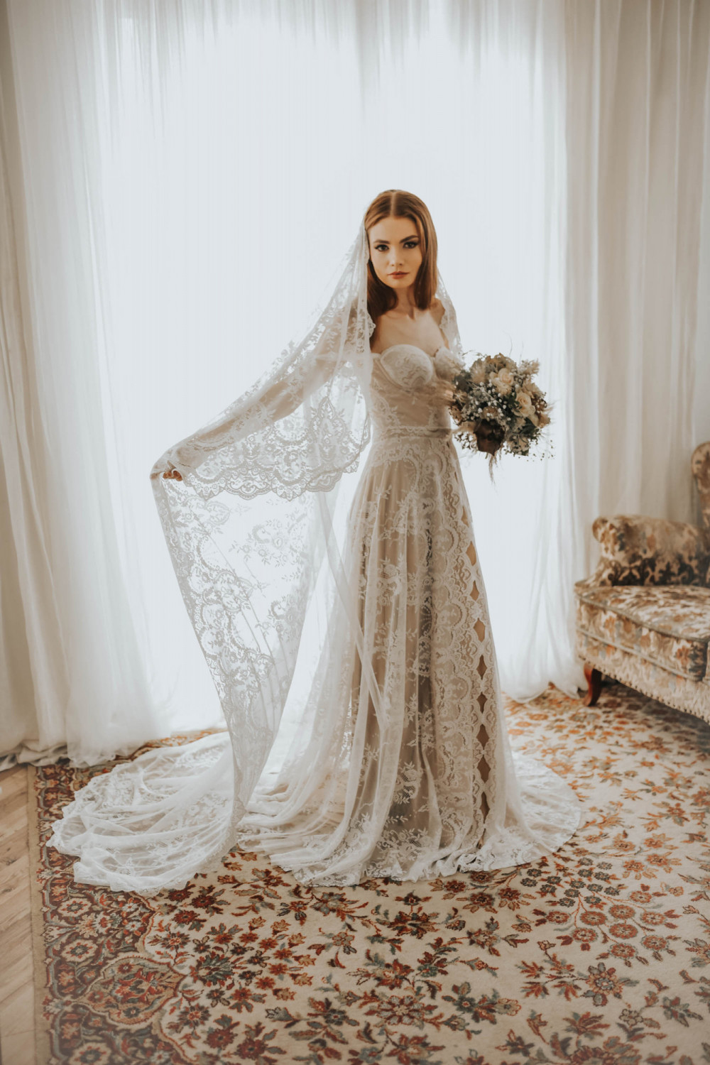 Ten niezwykle elegancki welon został wykonany z wyjątkowo delikatnej, francuskiej koronki o misternym wzorze. Brzegi koronki wykończone są dekoracyjnym, subtelnym brzegiem, który nadaje całości romantycznego charakteru.
