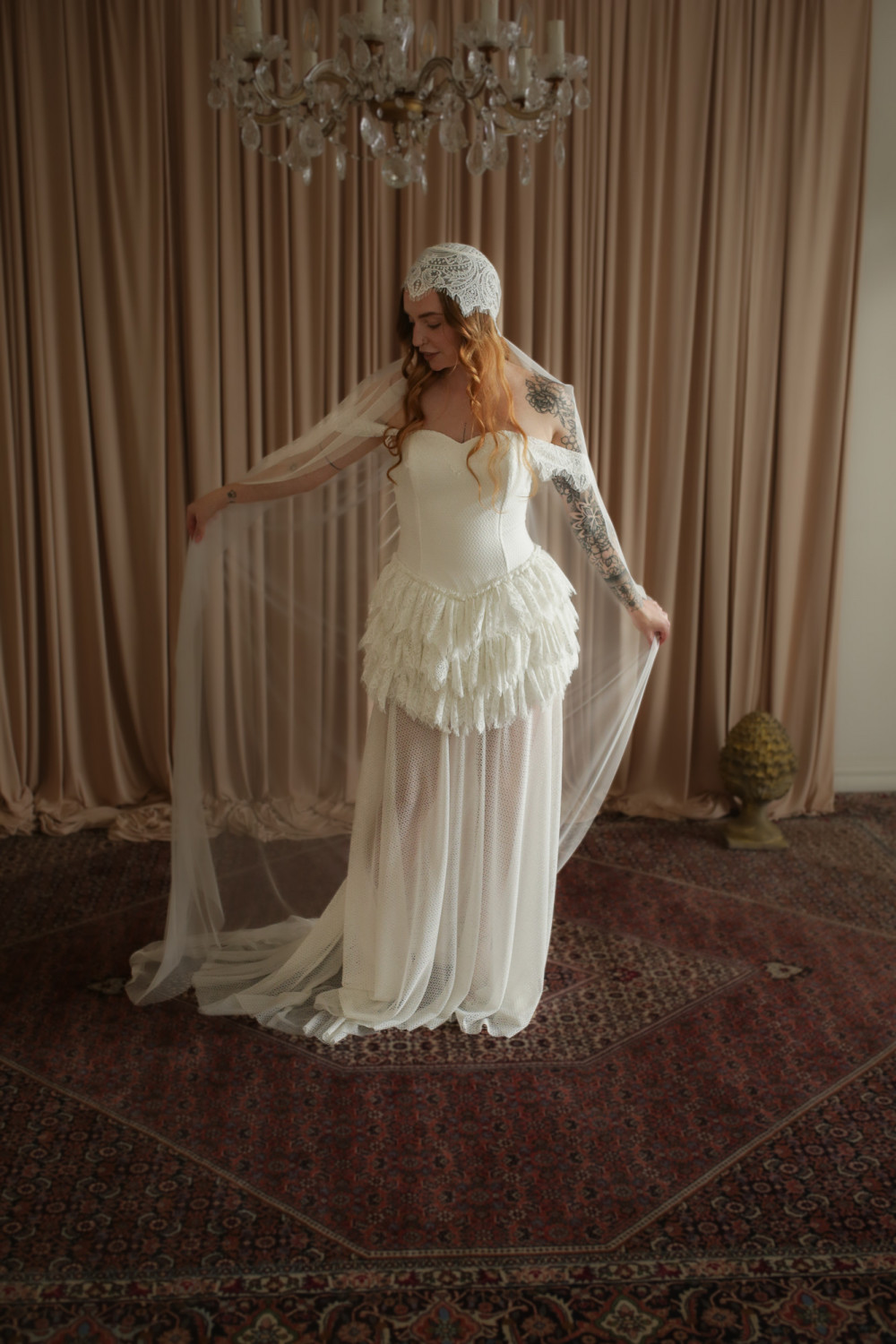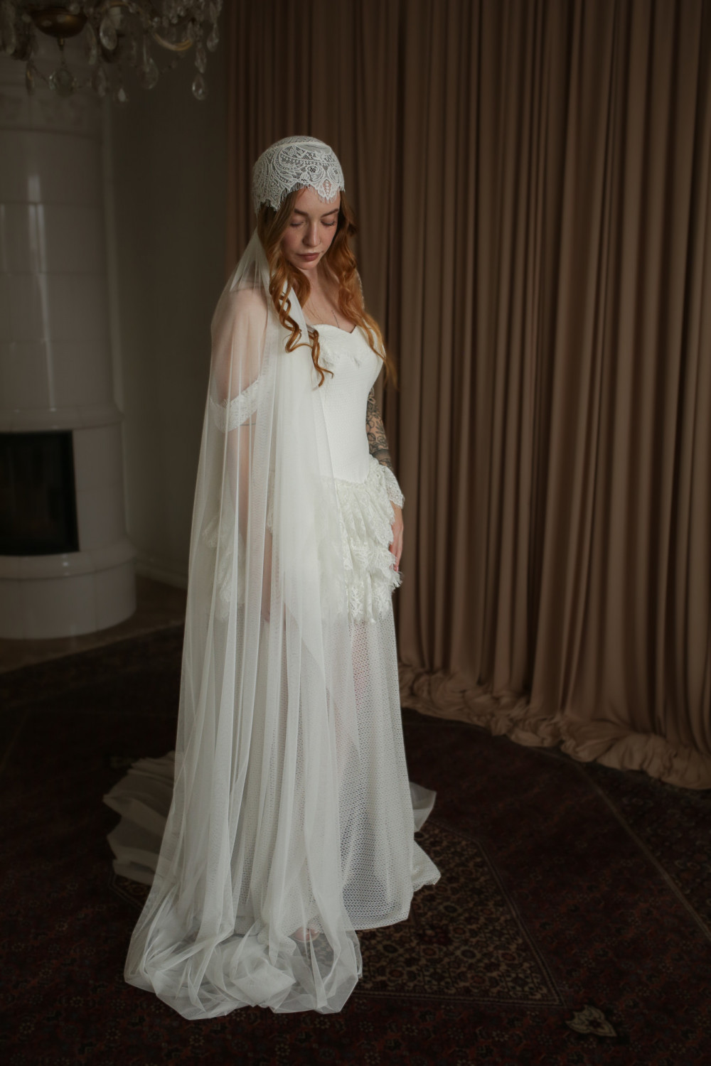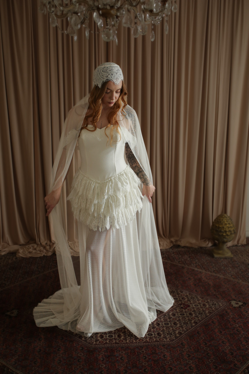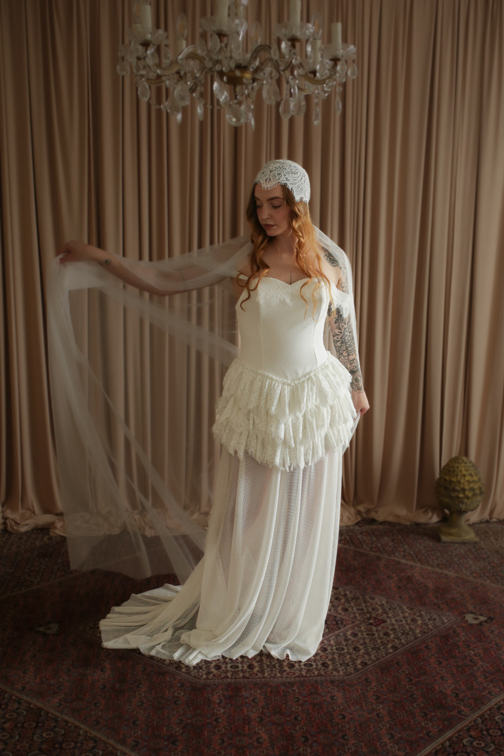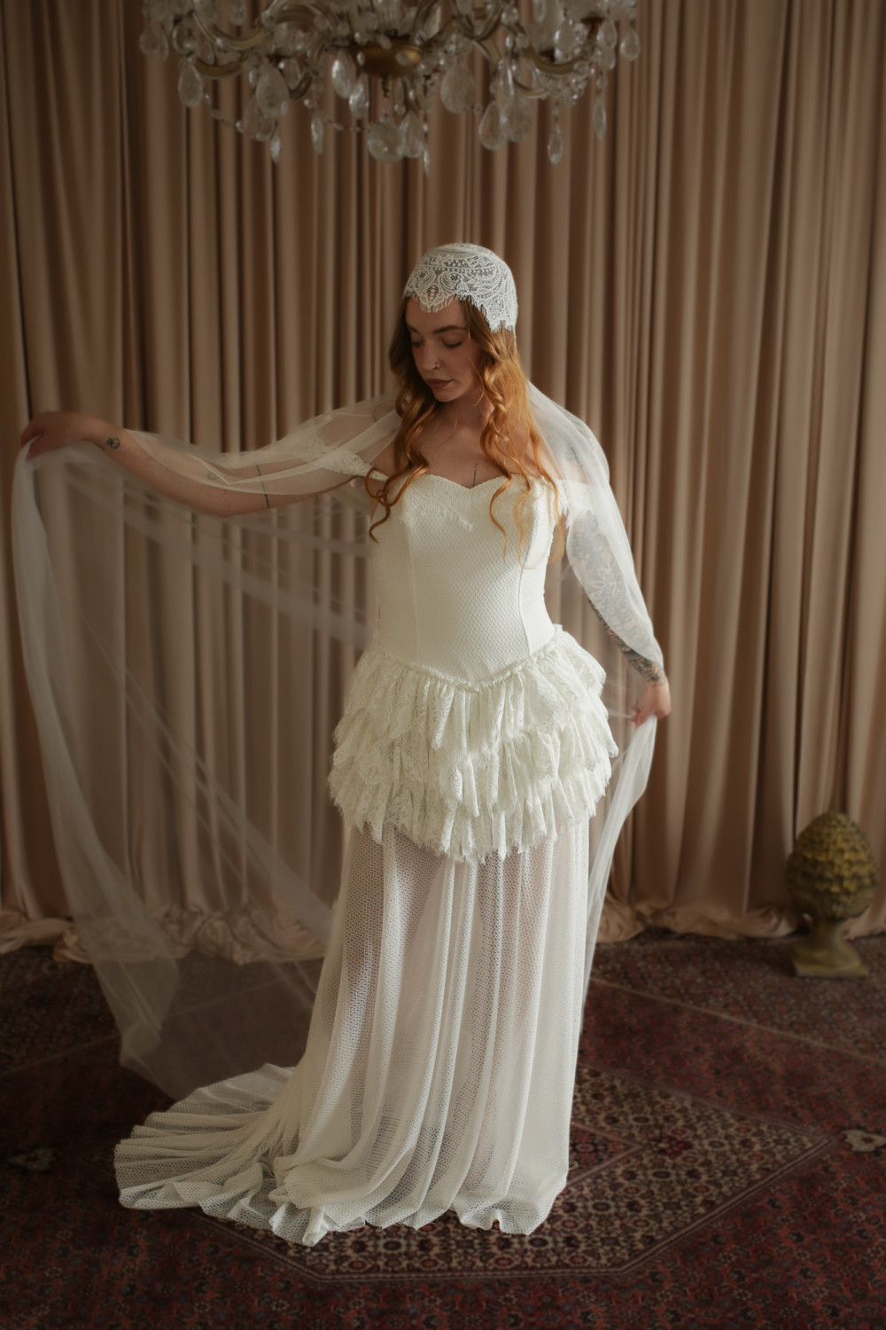 Wyjątkowy welon retro inspirowany modą lat 20. XX wieku, stworzony z myślą o pannach młodych ceniących niepowtarzalny styl i elegancję z nutą vintage. Górna część welonu ma formę delikatnego koronkowego czepka, który miękko otula głowę, tworząc subtelną i bardzo kobiecą linię.