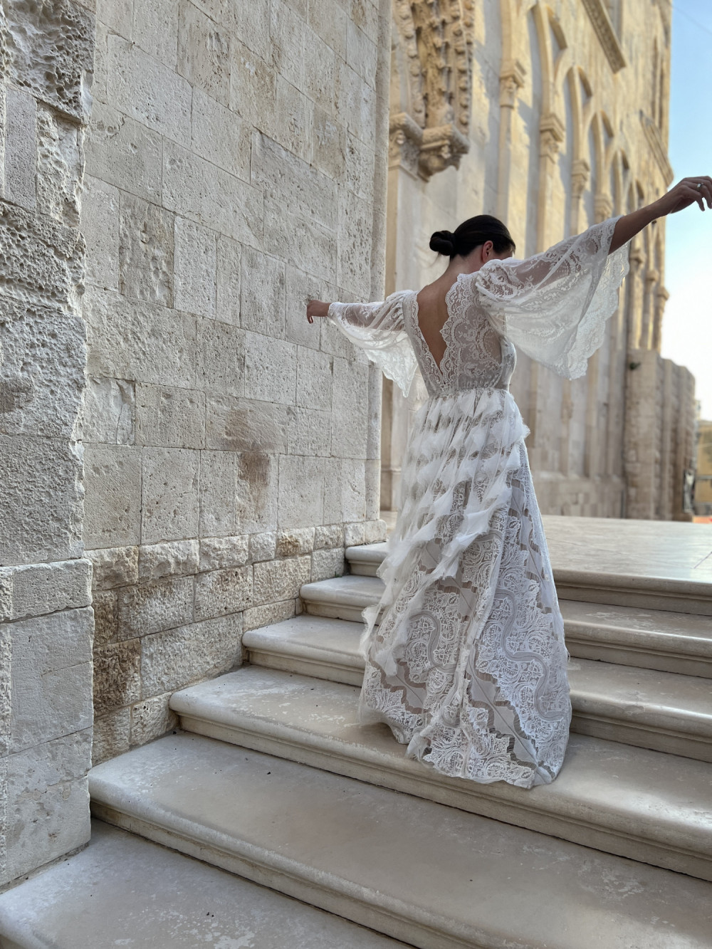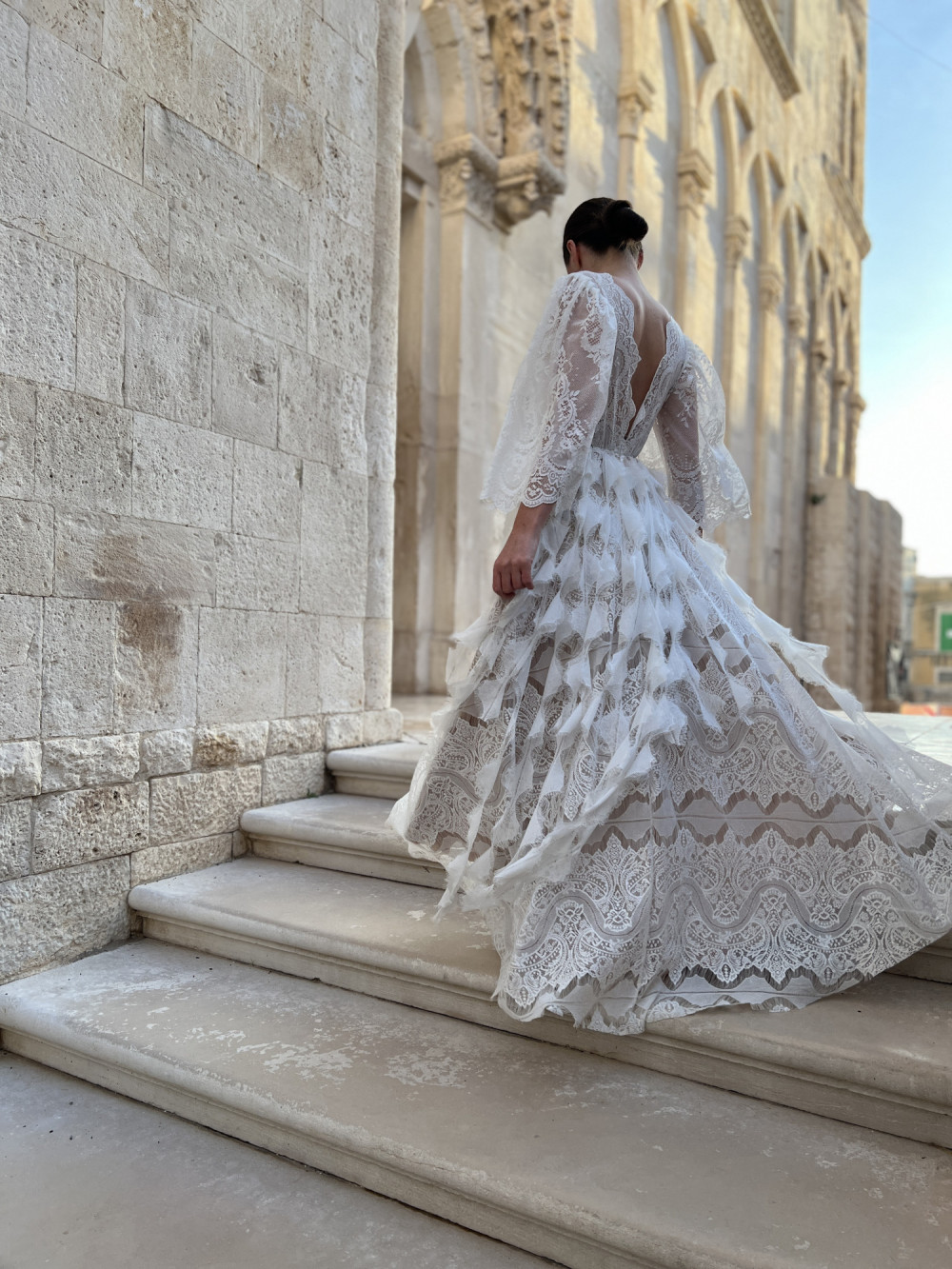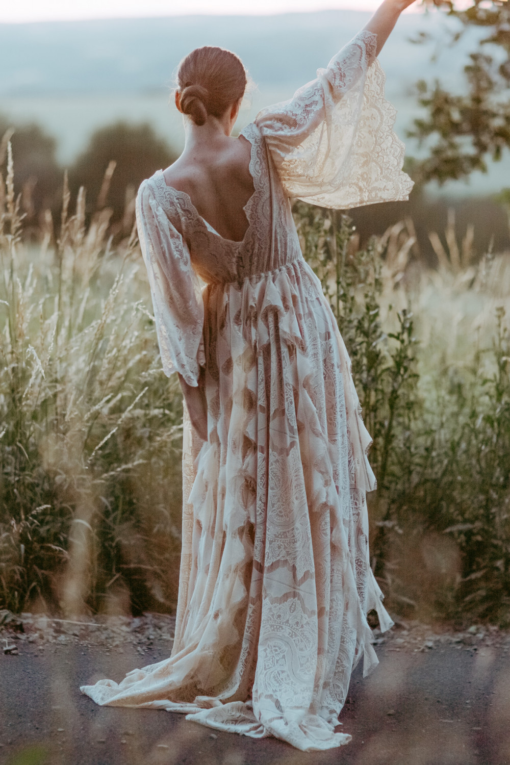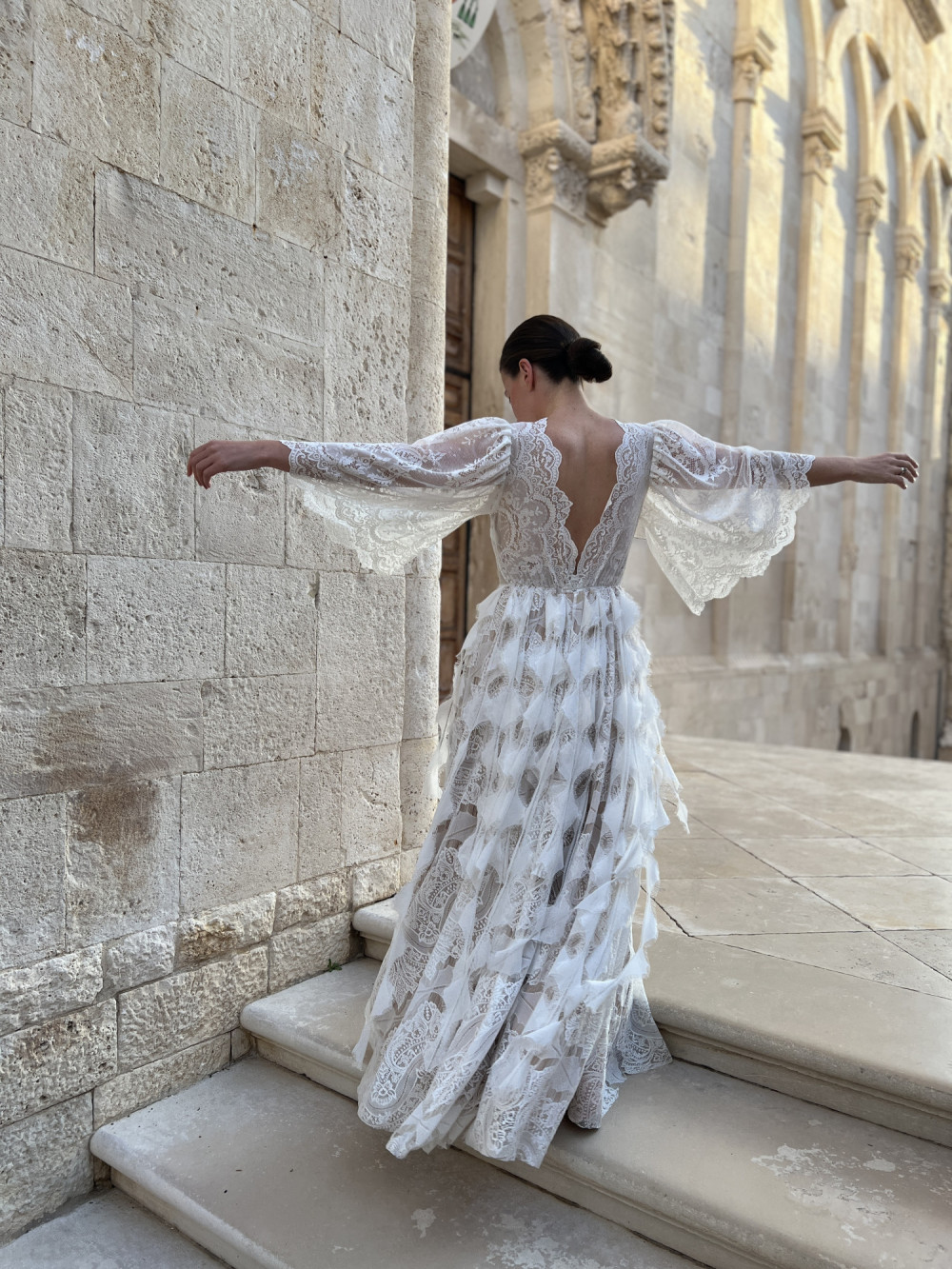 Spódnica w kształcie litery A została ozdobiona koronkowymi paseczkami w kształcie piórek, które poruszają się na wietrze razem z panną młodą, tworząc niezwykle efektowny, pełen ruchu detal. Całość prezentuje się lekko, miękko i naturalnie – idealnie wpisując się w ducha stylu boho.