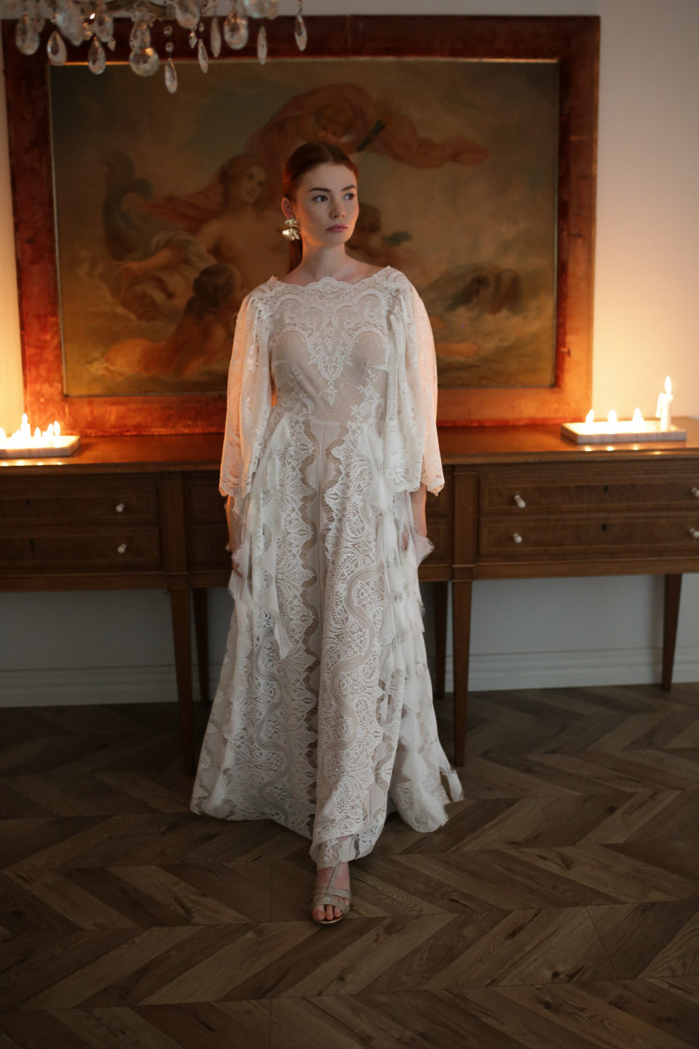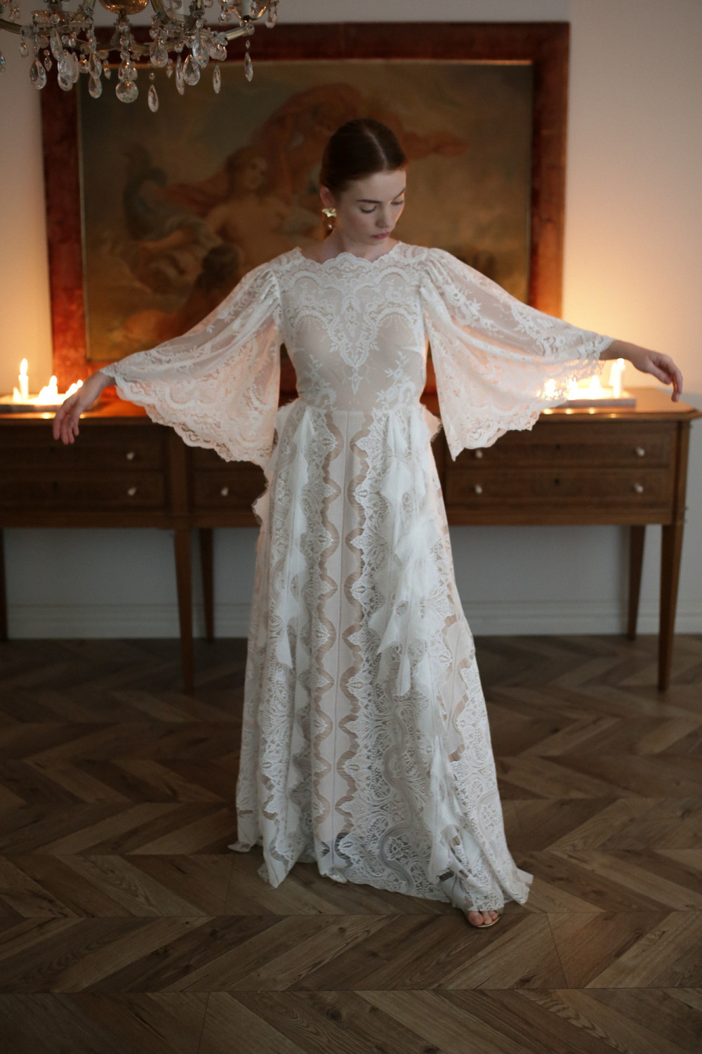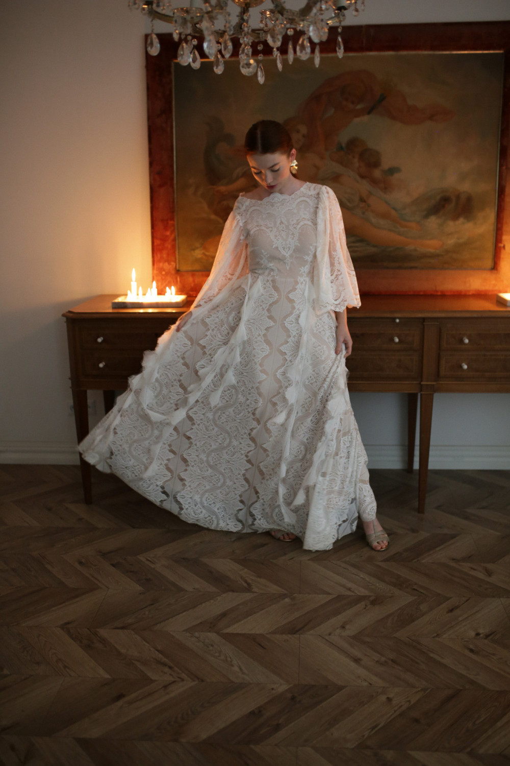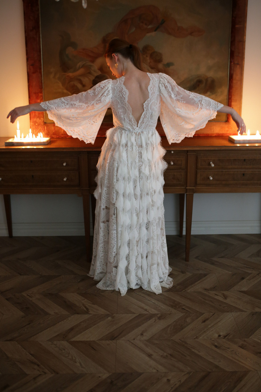 Spódnica w kształcie litery A została ozdobiona koronkowymi paseczkami w kształcie piórek, które poruszają się na wietrze razem z panną młodą, tworząc niezwykle efektowny, pełen ruchu detal. Całość prezentuje się lekko, miękko i naturalnie – idealnie wpisując się w ducha stylu boho.