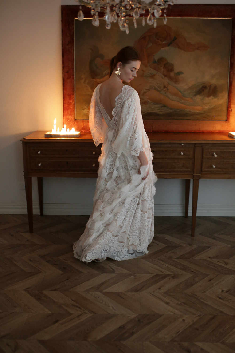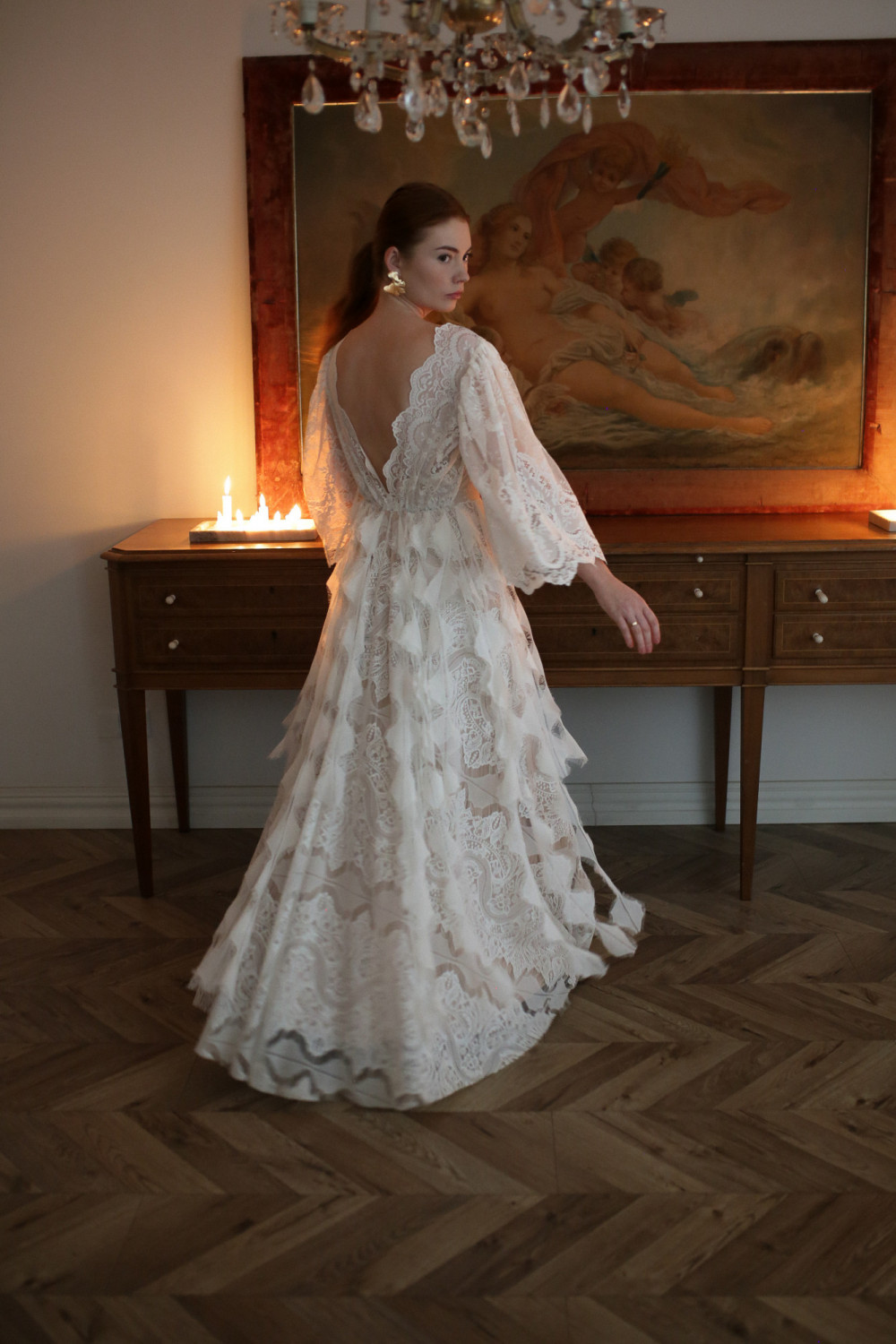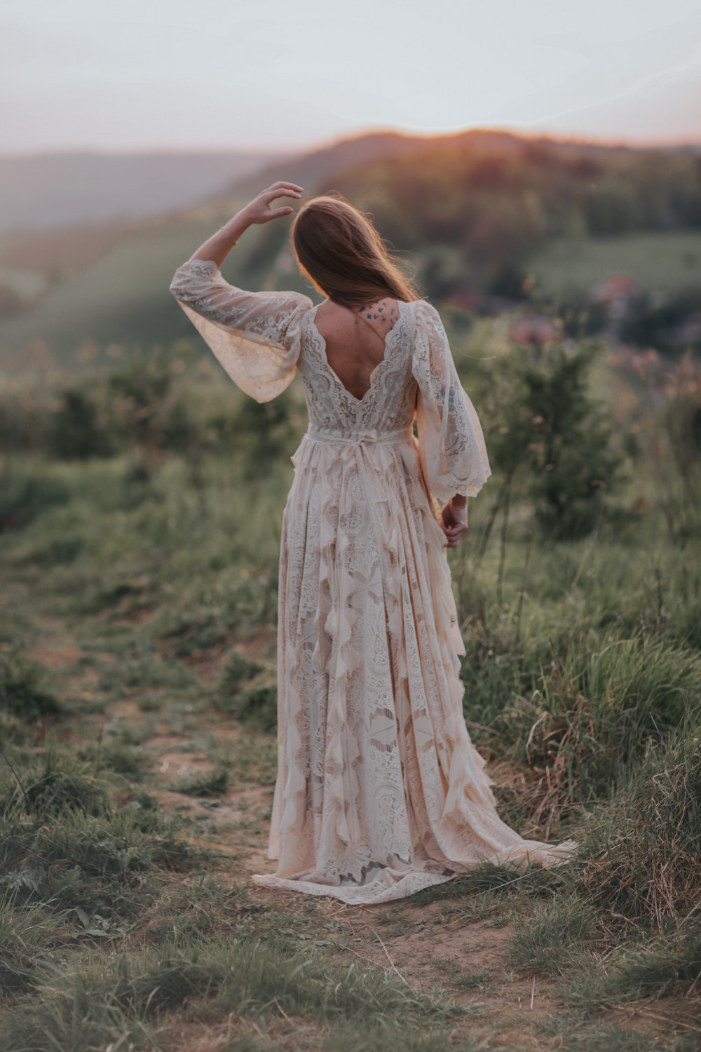 Tył sukni zachwyca otwartymi plecami, które dodają zmysłowości i lekkości całej stylizacji. Koronkowe rękawy o długości trzy czwarte nadają kreacji romantycznego charakteru i delikatnej elegancji.
