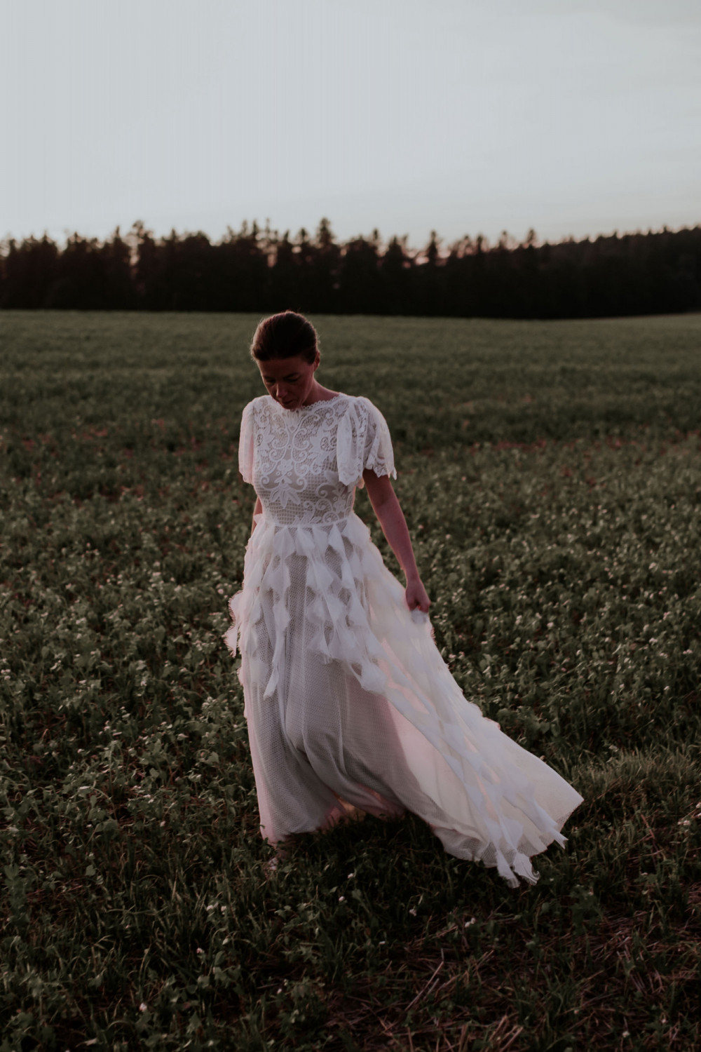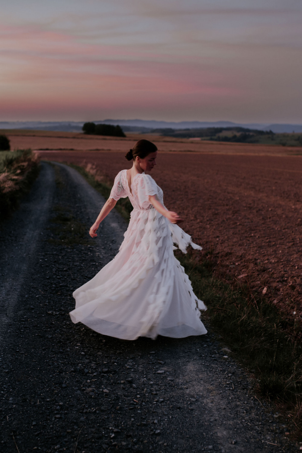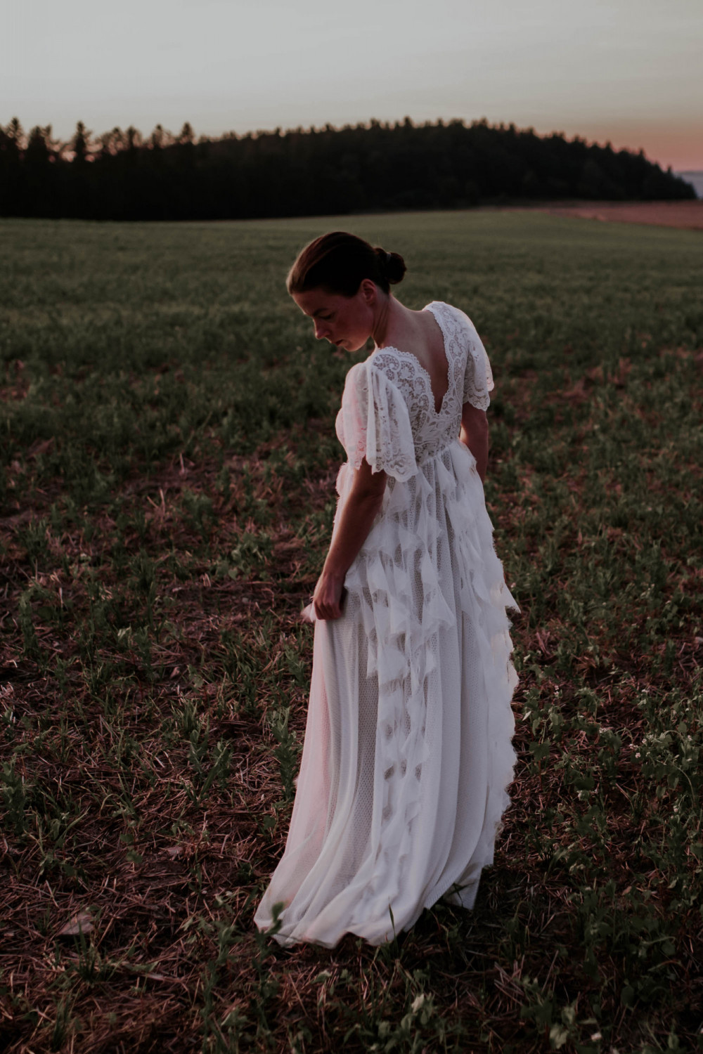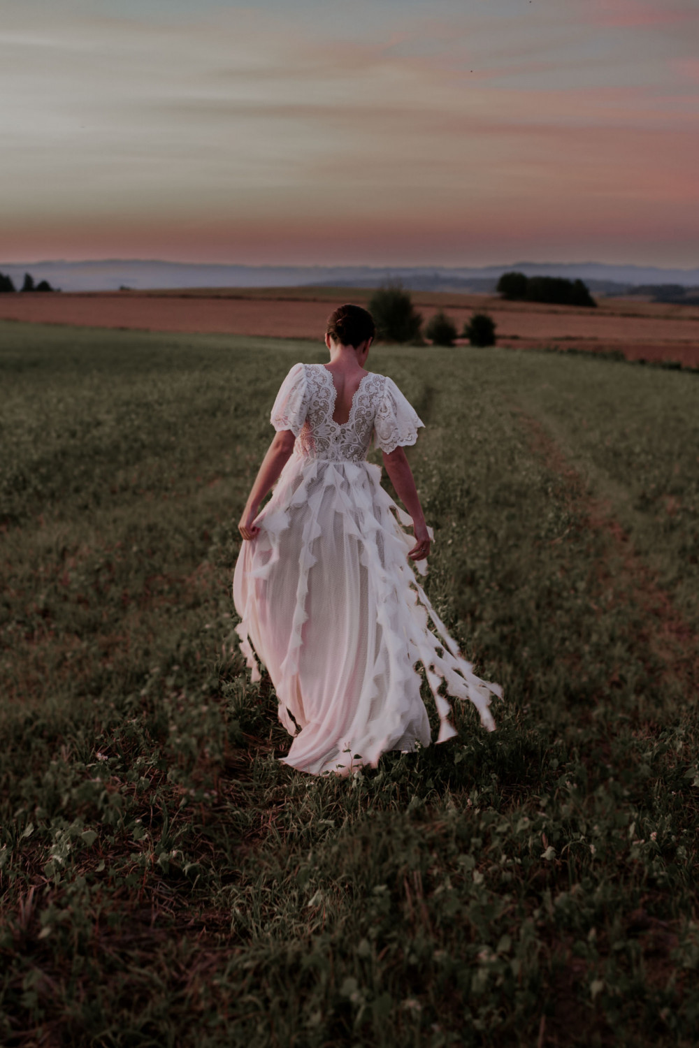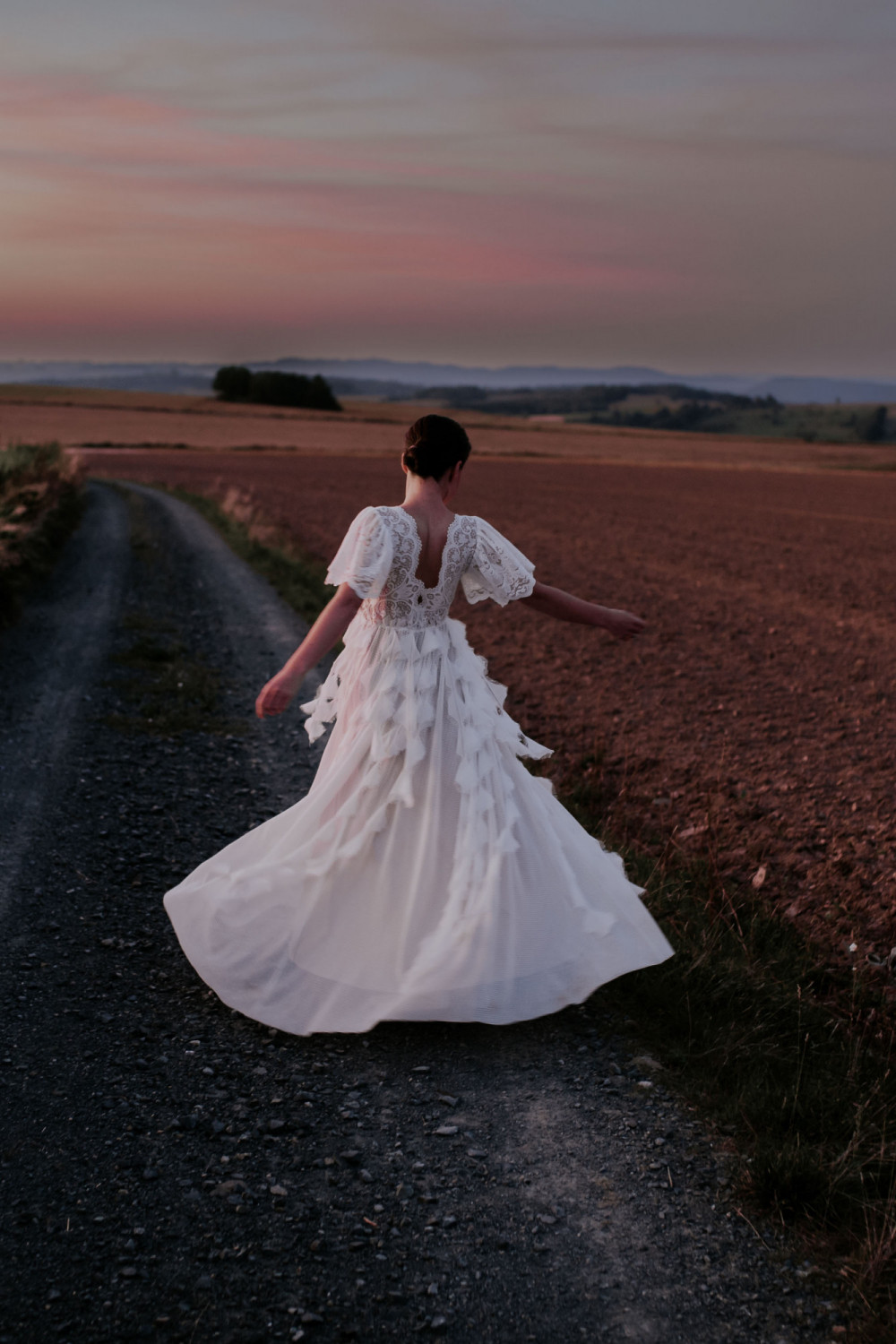 Suknia ślubna Piórkowa to propozycja dla kobiet, które marzą o kreacji pełnej lekkości, subtelności i artystycznego wyrazu. Jej wyjątkowy charakter tworzą koronkowe paseczki w kształcie piórek, doczepione w talii i opadające ku dołowi, które poruszają się z każdym krokiem i tańcem, tworząc niezwykle efektowną, niemal hipnotyzującą grę ruchu.