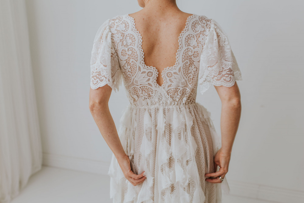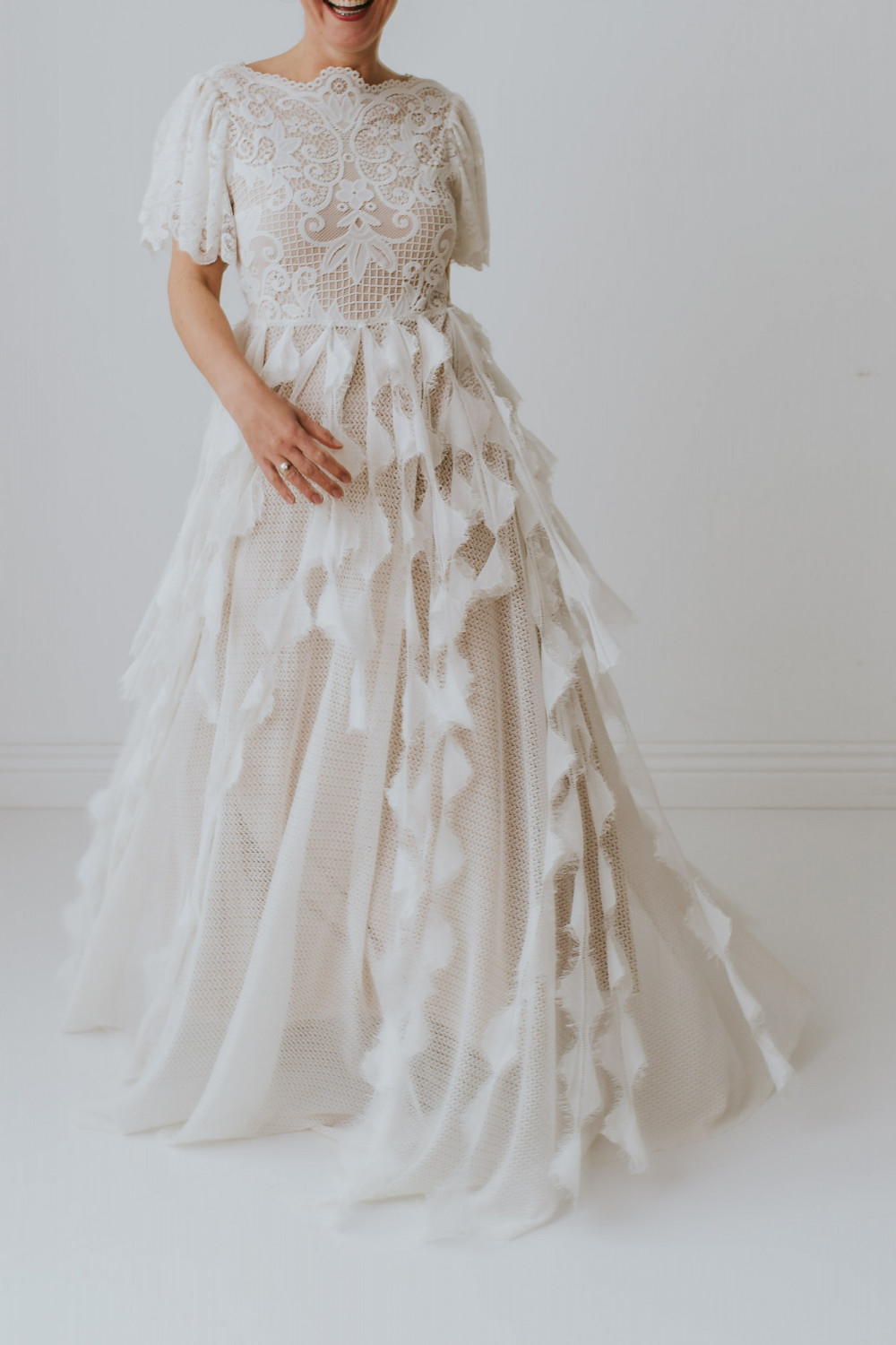 Góra sukni wykonana jest z koronki o bogatym wzorze, a wysoki dekolt wykończony efektownym brzegiem dodaje całości elegancji i klasy. Krótkie marszczone rękawy pięknie układają się w ruchu, nadając sylwetce romantycznego wdzięku i lekkości.